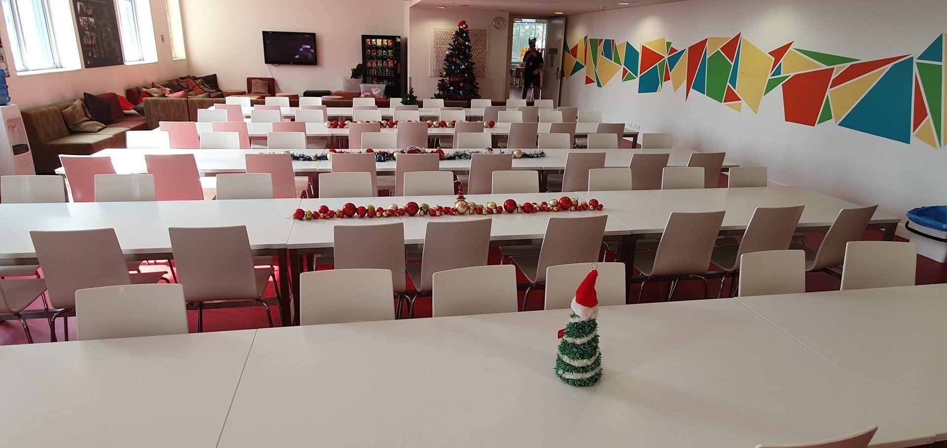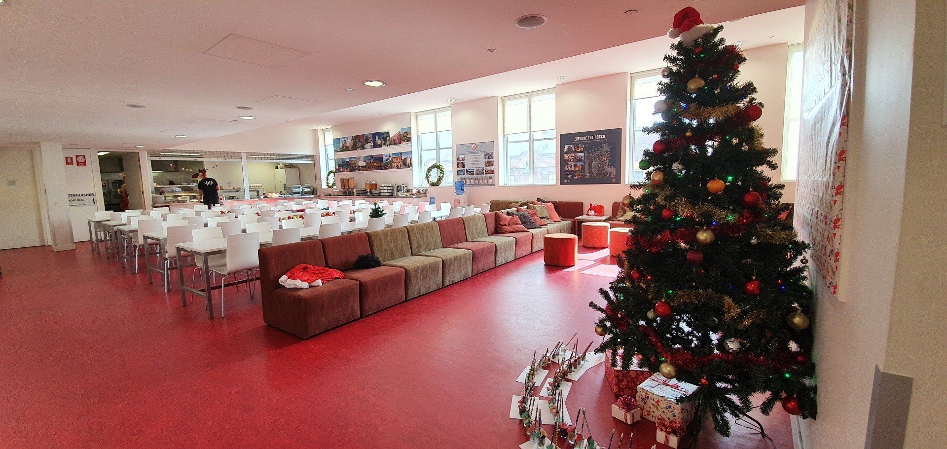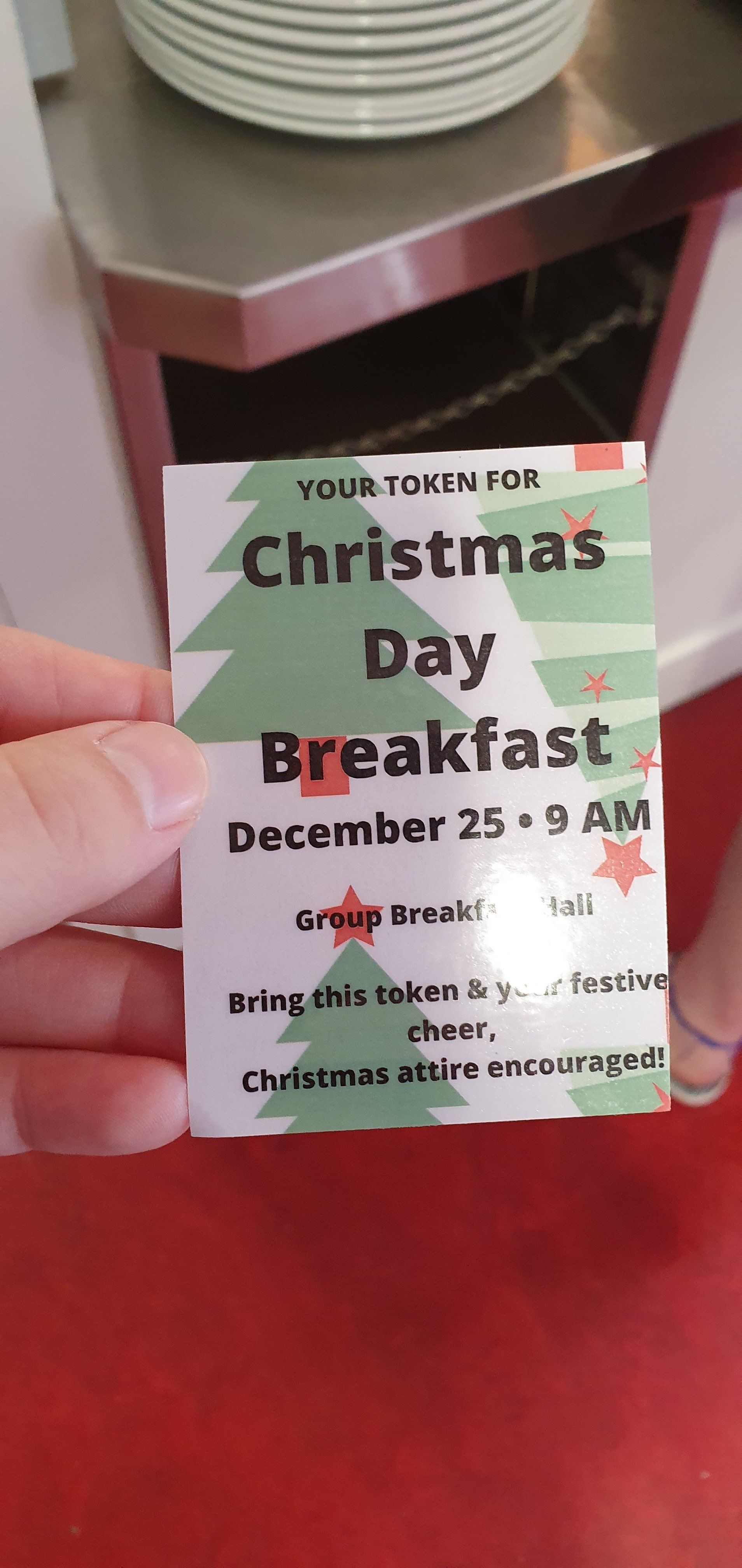 Um 9 Uhr gibt es im großen Saal das Buffet, es ist nett weihnachtlich dekoriert und es gibt sogar einen Tannenbaum mit ein paar Geschenken drunter. Das Buffet ist nicht unbedingt was Besonderes, aber es ist eine nette Atmosphäre und es gibt noch ein Sektchen zum Anstoßen. Dann darf man noch ein Los ziehen und erhält das entsprechende Geschenk. Eine nette Geste und ein süßes Geschenk in Form eines Schnapsglases und Stiftes mit Australienmotiv und ein kleiner süßer Koala zum andocken.