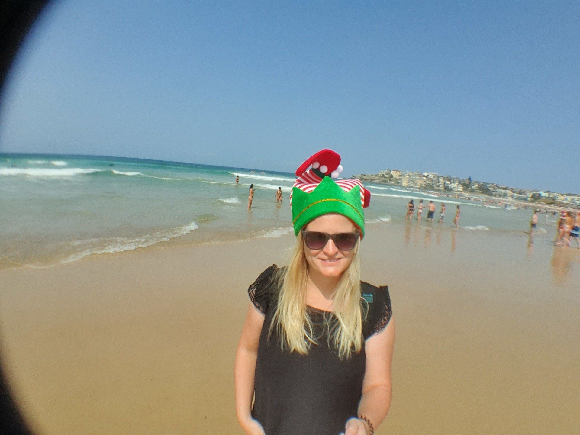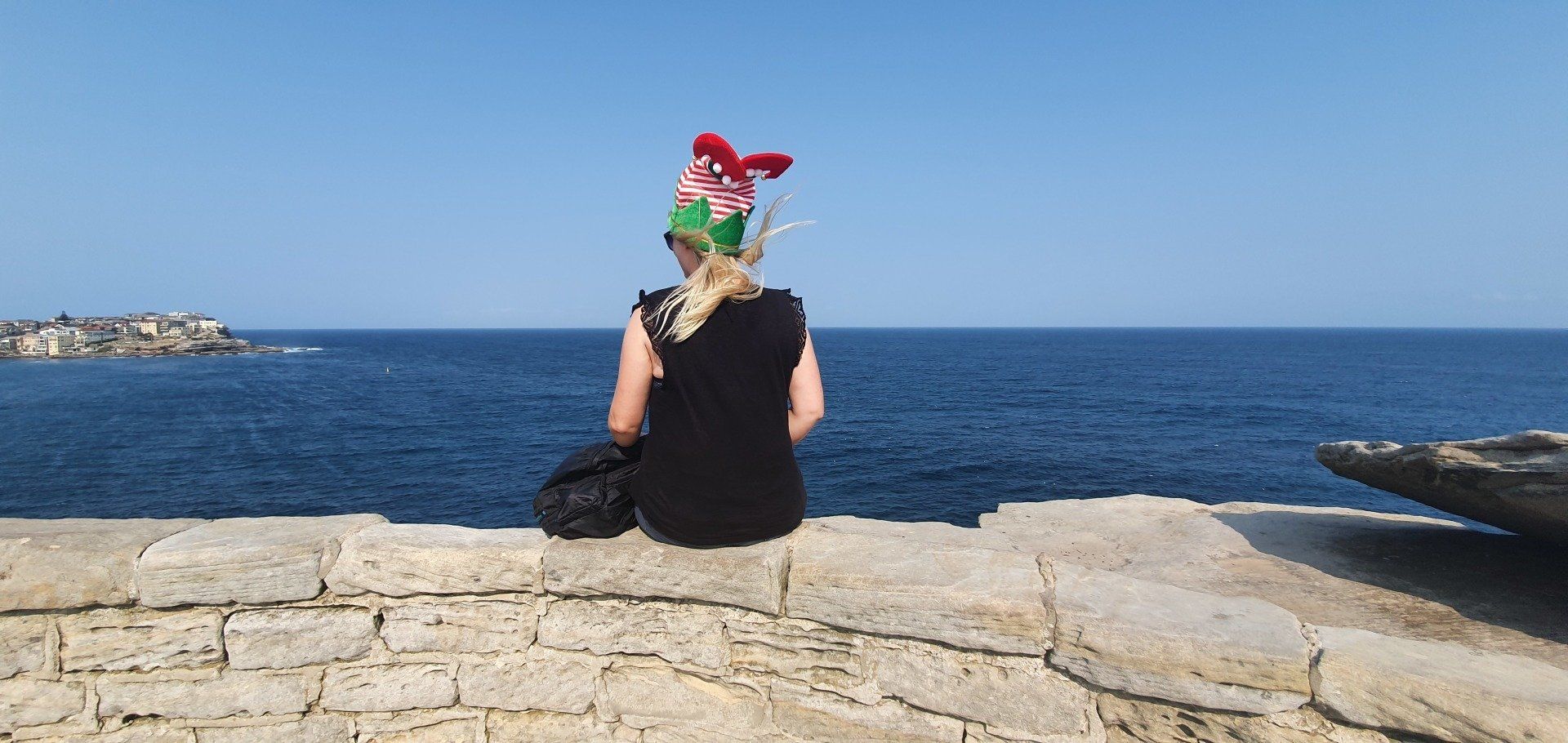 Ich drehe ein wenig meine Runden über den Strand und beobachte das Treiben und das Showlaufen hier, aber es ist nicht ganz mein Ding, um mich dazu zu legen und daher mache ich mich auf den Weg, die Küste entlang zum Bronte Beach zu laufen, etwa 6 Kilometer. Immer wieder muss ich mich mal umdrehen und staune über die Massen an Menschen. Dann geht es los, der Weg ist wirklich perfekt ausgebaut und die Aussicht wunderbar. Es weht ein angenehmes Lüftchen und die Sonne zeigt sich von ihrer schönsten Seite. Gut, dass ich meine Mütze dabei habe, man soll sich ja vor der Sonne schützen. Haha. Natürlich bin ich nicht die einzige mit dieser exotischen Kopfbedeckung, weil das hier recht normal ist, sich etwas weihnachtlich zu schmücken.