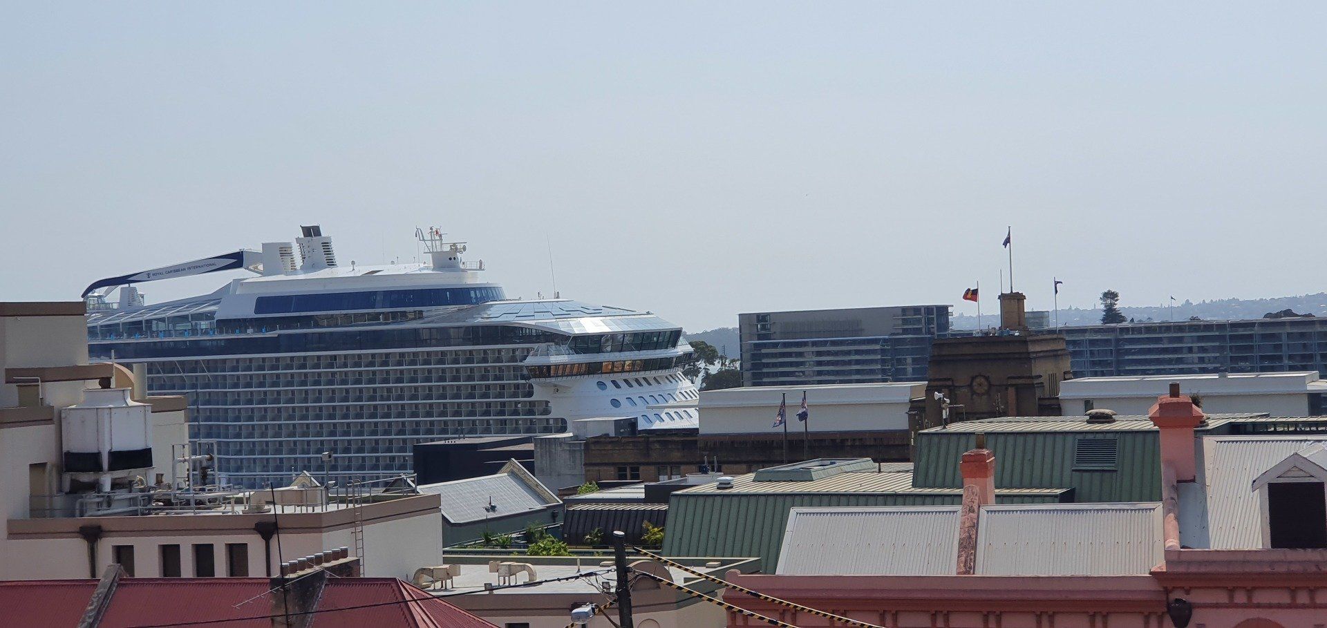 Um 10 muss ich auschecken, und so stehe ich entsprechend auf. Der letzte Blick aus dem Fenster zum Opernhaus fällt auch eher ernüchternd aus, weil ein riesiges Kreuzfahrtschiff die Sicht versperrt. Also mache mich dann auf den Weg zur Bahn, die unten am Hafen abfährt. Da ich die Gegend ja nun kenne, gehe ich die Strecke, auf der ich keine Treppen habe. Nicht wie bei der Ankunft, was bei der Ankunft sehr anstrengend war. Also los, die Bahn zum Hauptbahnhof nehmen und bis hier läuft es gut.