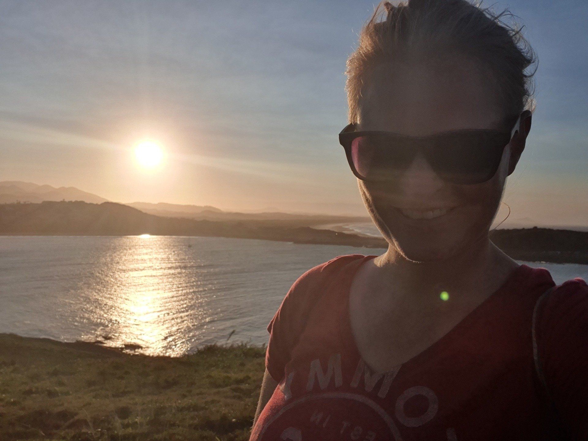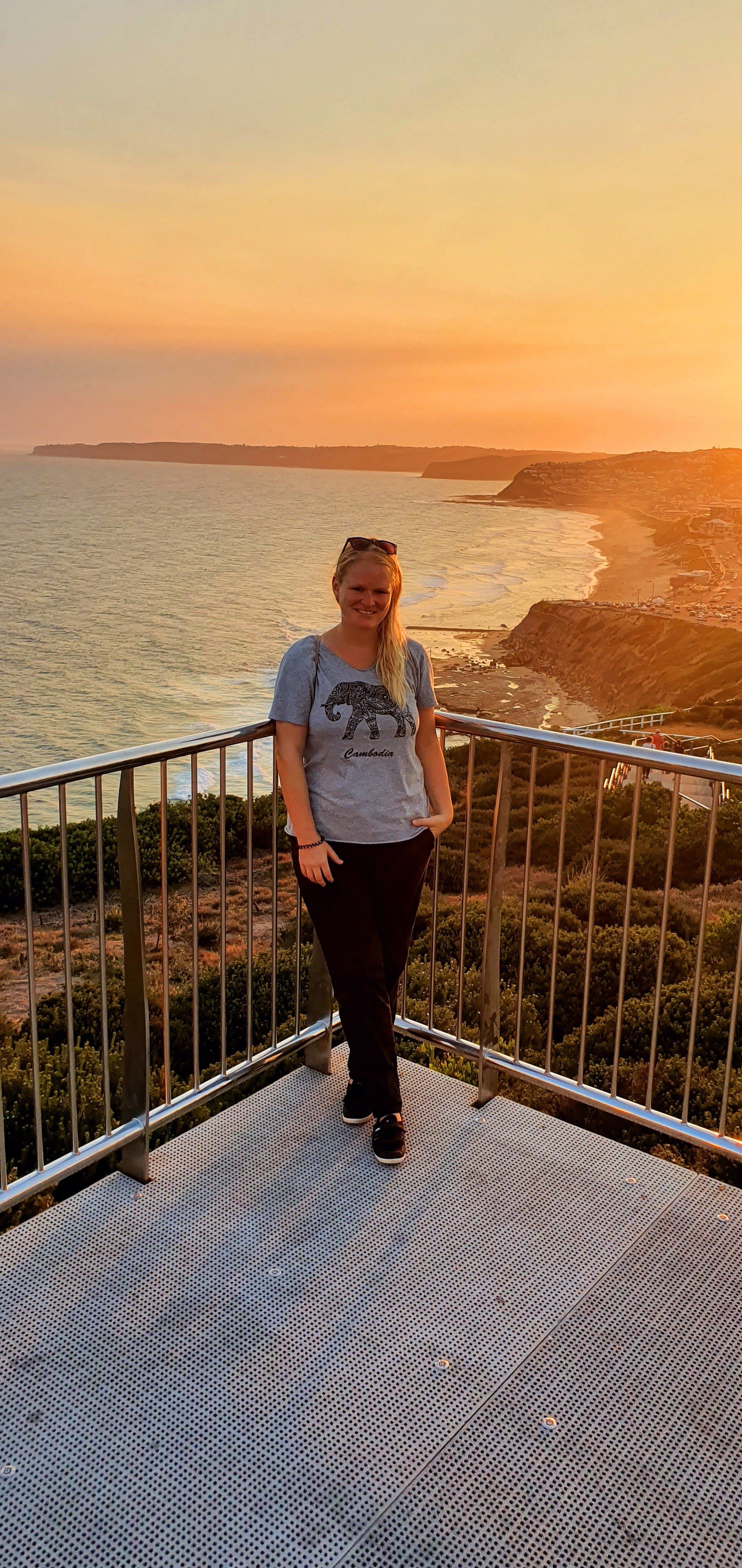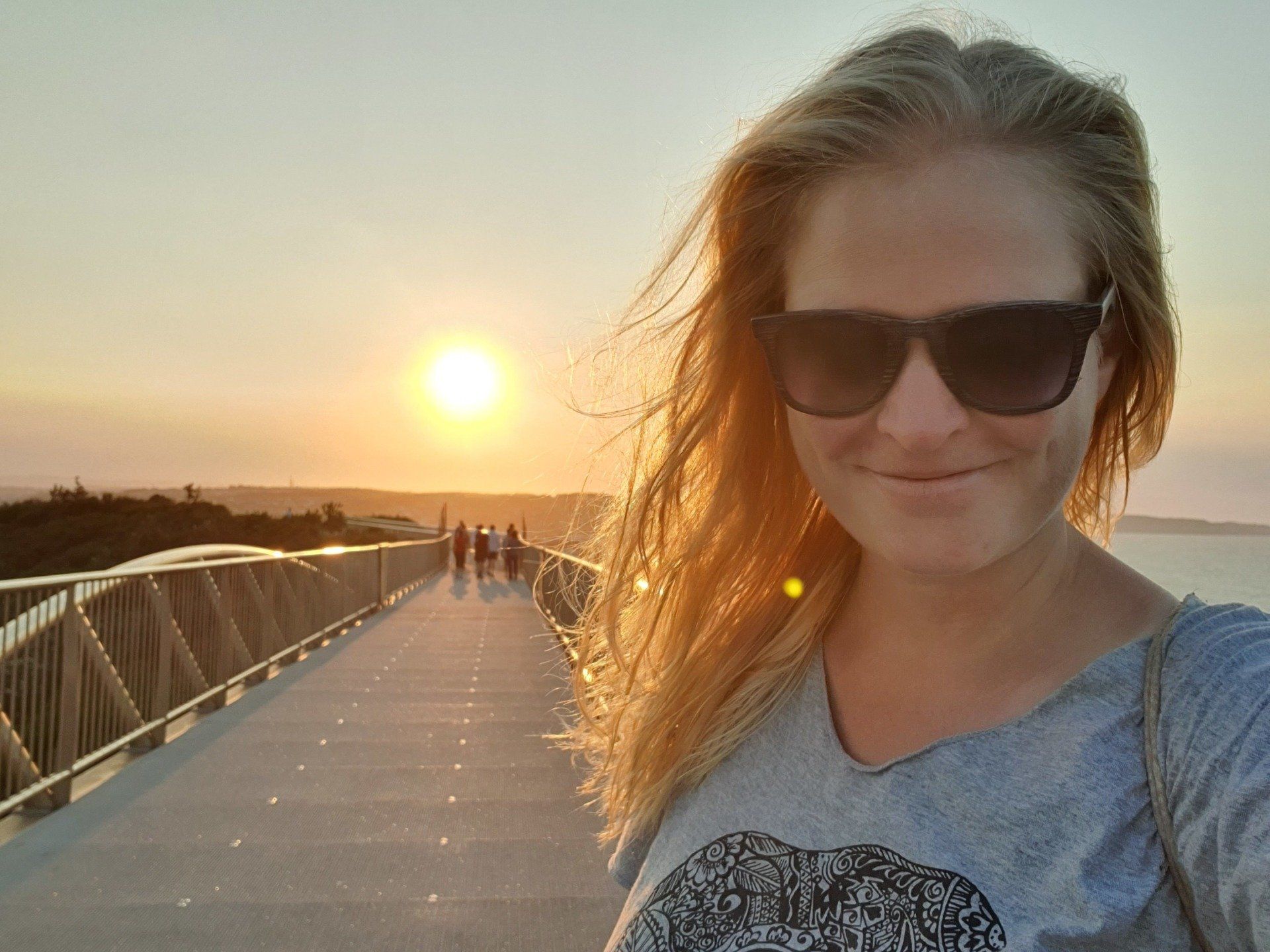 Und irgendwann kommt dann auch ein nackter Mann daher gelaufen, was etwas komisch ist. Aber es passiert nichts, er lebt wohl einfach sein Nacktsein hier aus. Ich habe nur die Flipflops an, aber wieder mal ziehen die Kilometer einfach so vorbei. Kurz vor dem Leuchtturm gehe ich noch zu einer extra Plattform, wo man wohl gut Blauwale beobachten kann. Allerdings ist es jetzt nicht die Saison, sodass es eher unwahrscheinlich ist. Daher schaue ich zwar eine Weile in die Ferne über das leuchtende Meer, aber mache mich dann auch auf zum letzten Stück des Weges. Dann am Leuchtturm angekommen bin ich schon recht müde und freue mich auf die Pause. Hier bin ich natürlich nicht mehr alleine. Der Ausblick auf den anliegenden Strand ist gigantisch, da er sich endlos zieht und ich nicht mal das Ende sehen kann. Die Sonne zeigt auch mal wieder einen fantastischen Showdown und ich denke mir, dass es wirklich ein wunderbarer Tag war.