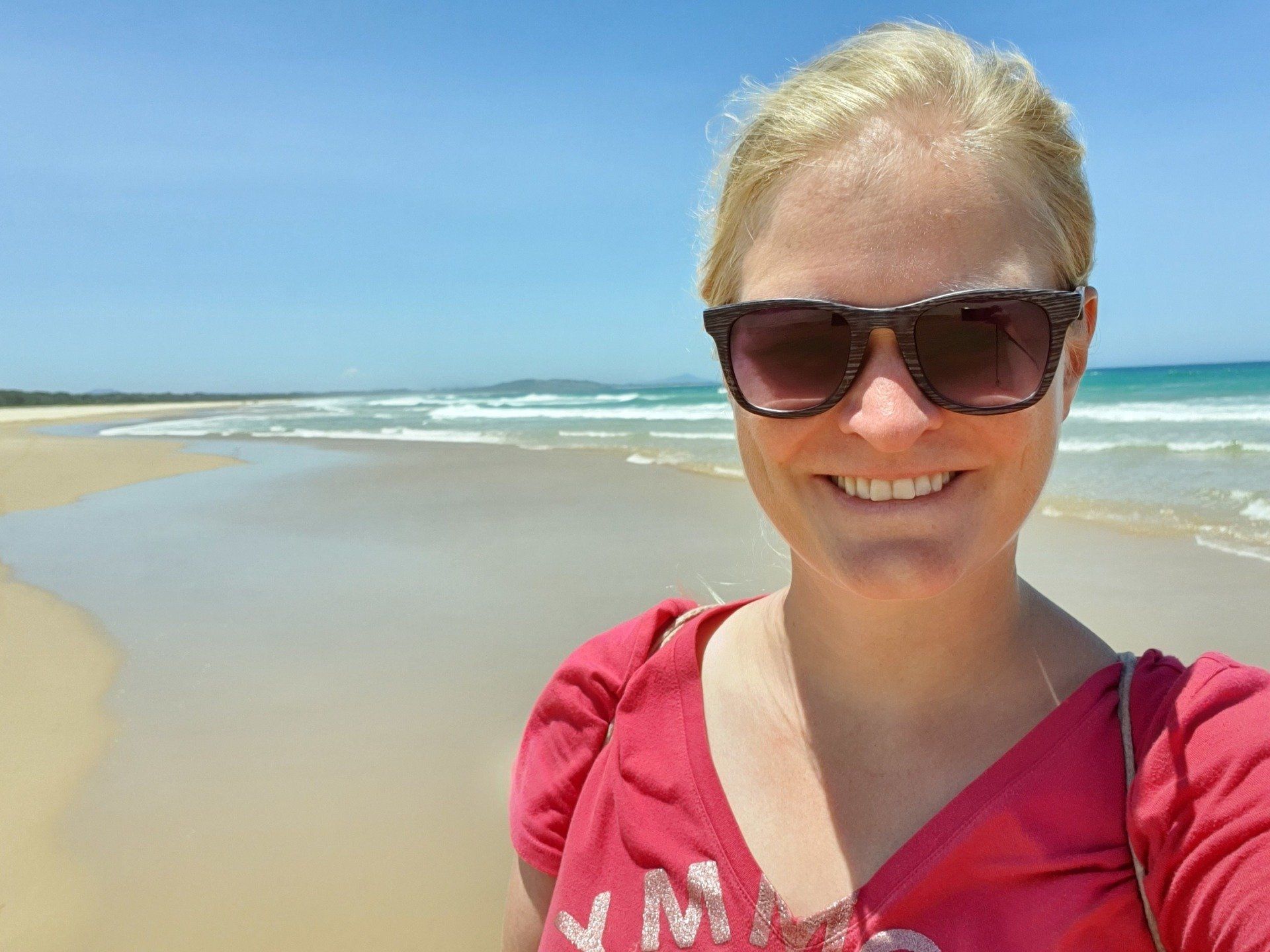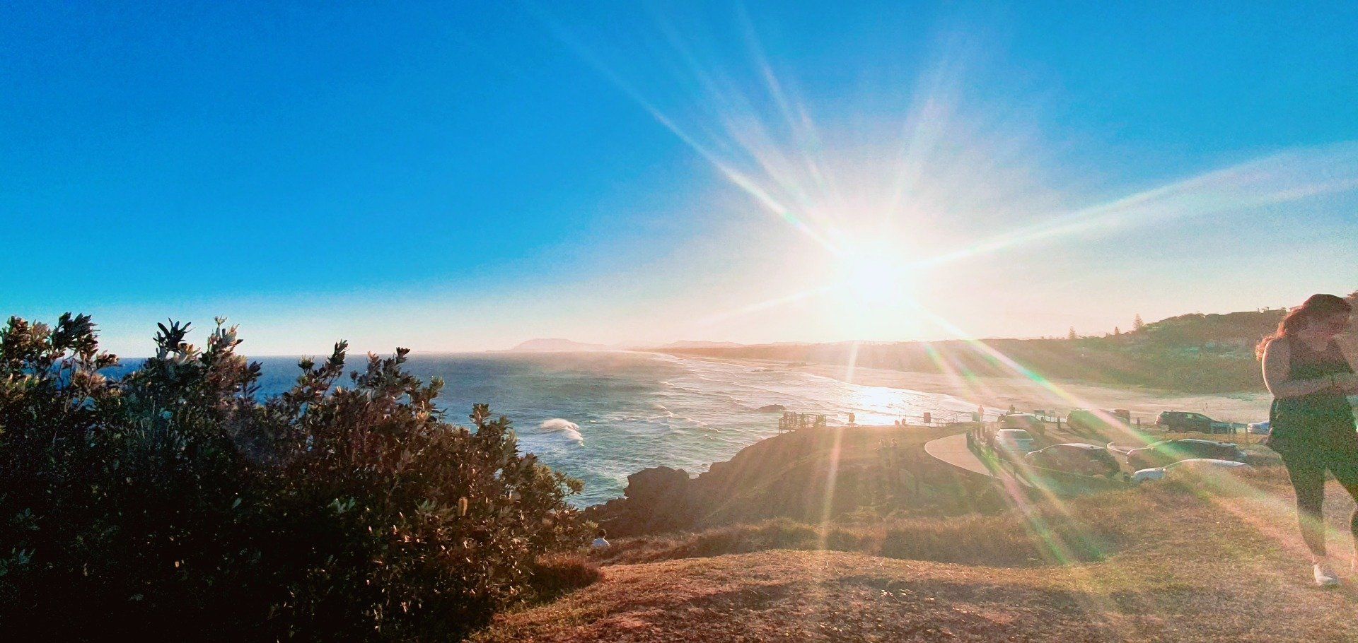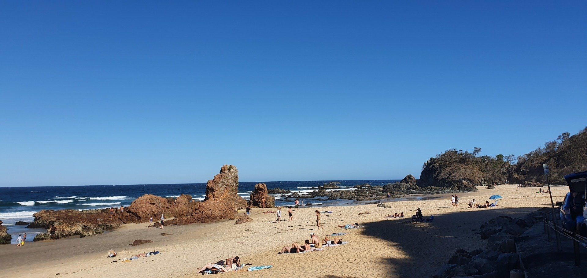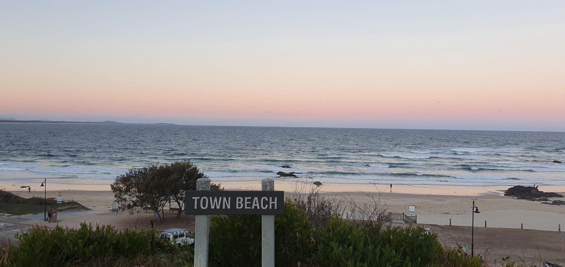 Um 6 Uhr morgens steht Tarryn putzmunter in der Tür und weckt mich. Mitten in meiner tiefsten Nacht :D Die beiden sind also immer noch Frühaufsteher. Haha. Da wir aber zum Strand in Byron Bay wollen, denke ich, kein Problem, da kann ich am Strand ja auch noch lummern, also kein Problem. Um 8 wollen wir los. Also raus aus den Federn, Kaffee schlürfen, aber ohne Frühstück. Die Fahrt dauert etwa eine Stunde, allerdings ist es dort so voll, dass wir ewig keinen Parkplatz finden.