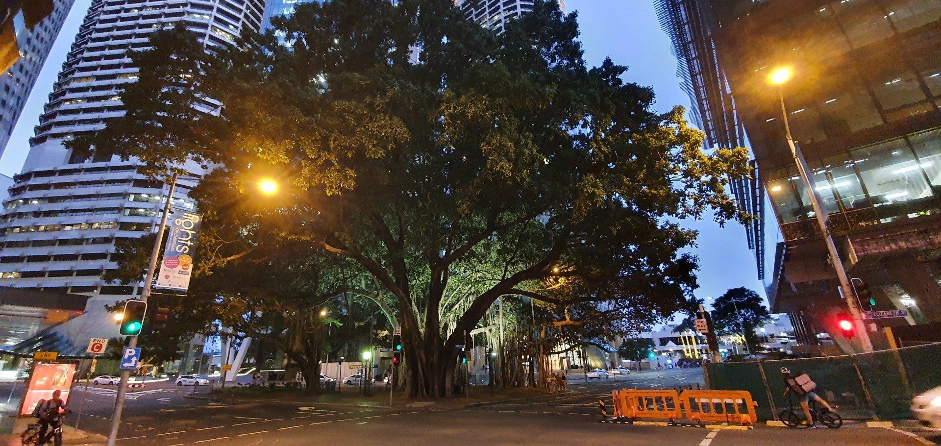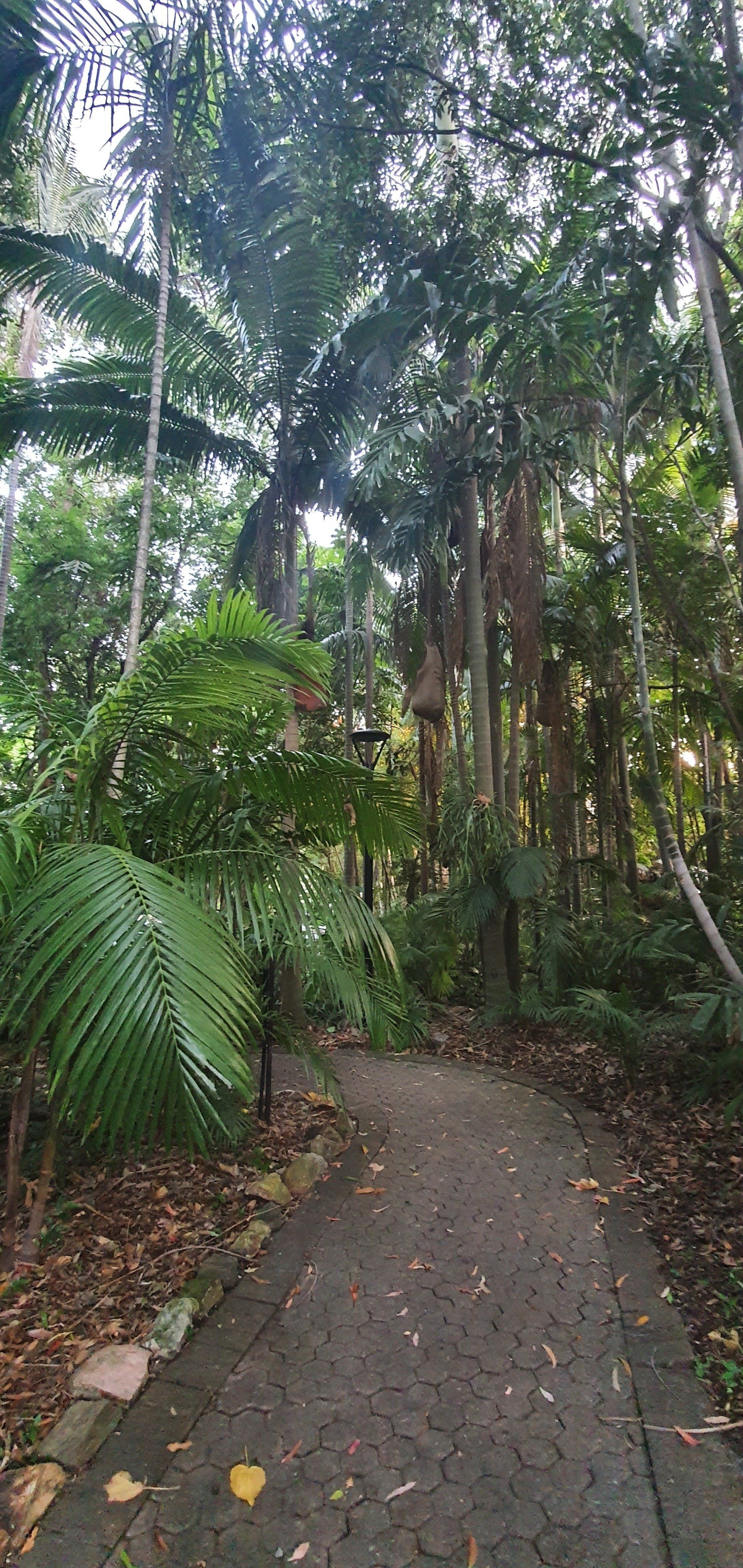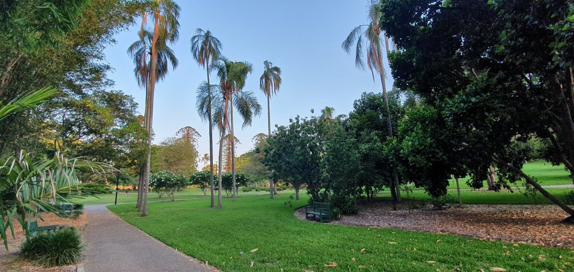Erst am Nachmittag gehe ich wieder raus. Glücklicherweise ist es hier ja etwas länger hell als in Asien, sodass ich im Hellen die kleine Halbinsel der Innenstadt, wo ich untergebracht bin, zu Fuß noch perfekt "einmal rundum" erkunden kann. So drehe ich eine weitere große Runde durch meine neue Freundin, die Stadt Brisbane. Und dann gehe ich zum Botanischen Garten, der schön angelegt ist, mit vielen Palmen und Blumen, wie das eben so ist. Hier verbringe ich in der Idylle eine ganze Zeit, und lande dann direkt vom Botanischen Garten mal wieder am Fluss. Dort laufe ich gemütlich zurück zum Citycentre und setze mich dann eine Weile auf eine Bank, um die Aussicht und die Idylle zu genießen (hach, wie oft ich hier Idylle schreibe :D). Auf der Bank, an der ein Tisch angeschlossen ist sitzt Alessandro, der ebenso die Atmosphäre genießt, und wir unterhalten uns sicher 2 Stunden lang über das Reisen, Italien (sein Land), Deutschland und die Welt. Im Wahrsten Sinne. Dann wird es schon dunkel und ich laufe wieder zurück, noch mal am Rande des Botanischen Gartens. Dort hängen an einem Baum ganz nah einige Fruit Bats ab. So kann ich sie von ganz nah beobachten, es ist echt irgendwie gruselig, aber ebenso süß und faszinierend.