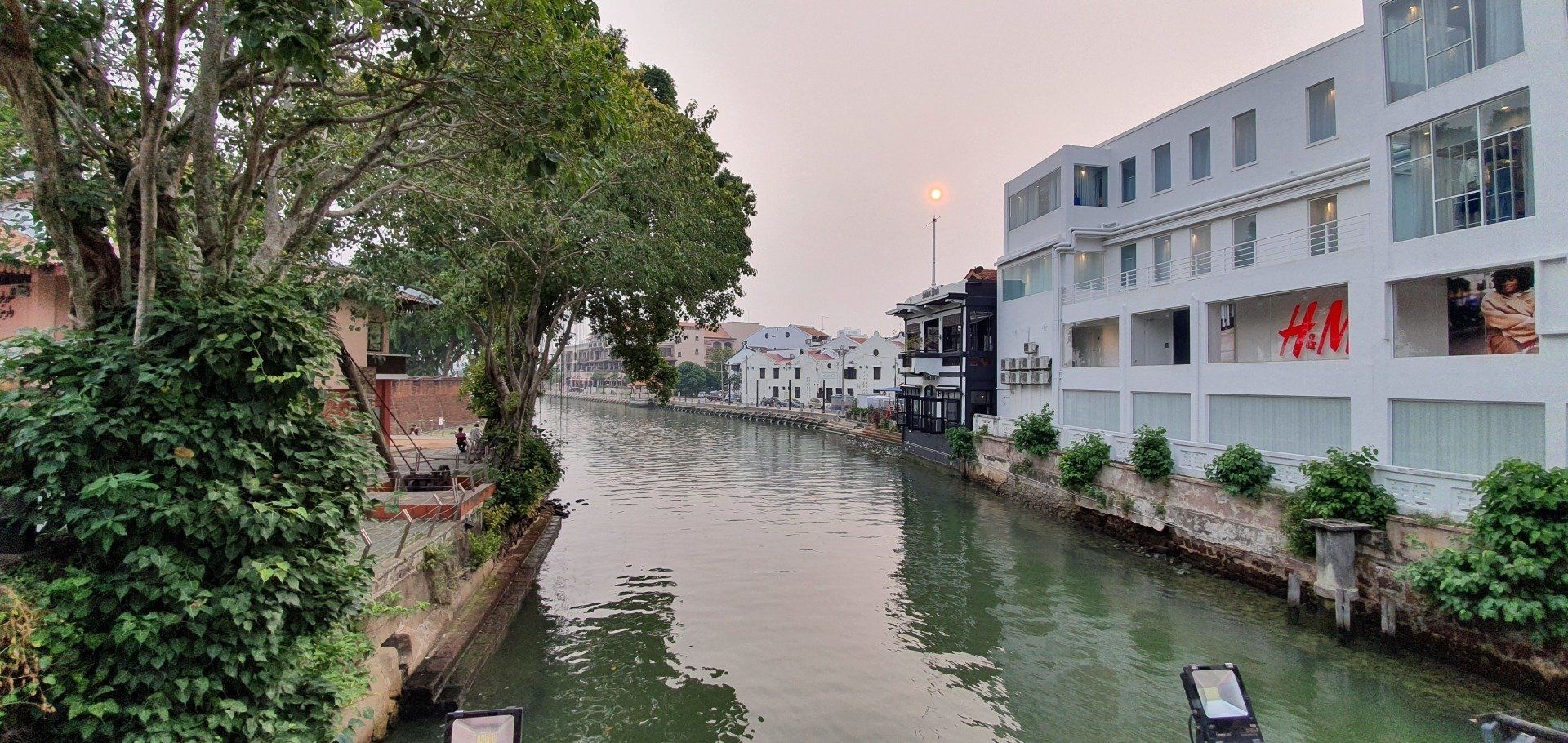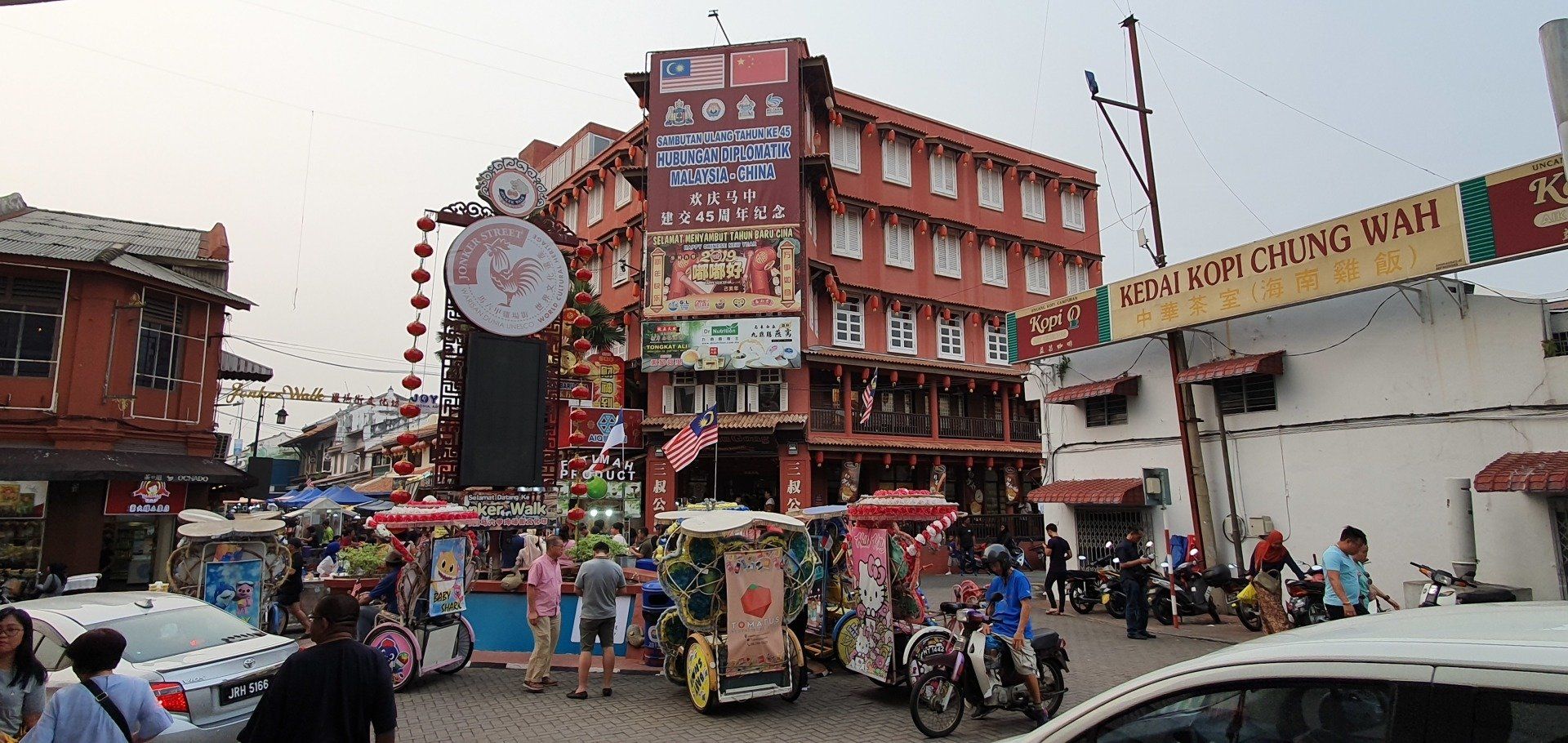 Das Zimmer im kleinen Hostel "3 little birds" könnte kontrastreicher zum MBS echt nicht sein. Es ist alles sehr basic, eben ein Hostel. Das "Kingbed" ist eine große Matratze auf dem Boden. Aber die ist bequem und ich habe gut geschlafen. Aircon funzt, eigenes Bad, etwas schmächtig. Aber ich fühle mich wohl, und das ist die Hauptsache. Ein Mädel, das hier über workaway arbeitet, ist Österreicherin und wir quatschen länger. Sie kommt wohl öfter her und mag Malakka sehr, da bin ich ja gespannt, wie mein Eindruck ist. Bisher jedenfalls recht entspannt. Allerdings habe ich mal wieder Migräne und schone mich etwas. Und als ich gehen Mittag auf den Balkon gehe, werde ich fast von der drückenden Hitze erschlagen. Also beschließe ich, tagsüber mal drin zu verbringen. Ist ja kein Problem. Am Abend, gegen 5, ziehe ich dann mal los. Das Hostel liegt, wie ich finde, sehr gut. Etwas abseits der Haupt-Innenstadt, wenn man das so nennen kann, und ist daher sehr ruhig. Und fußläufig zu Fluss, historischem Stadtkern und der Jonker Street, wo wochenends ein verrückter Foodmarkt ist. Mein erstes Ziel sind die für Malakka bekannten Spots wie das Stadthaus, die alte Festung, die älteste Kirche Asiens und dann mal sehen, was mir noch so über den Weg läuft. Schon am Fluss und der darüberführenden kleinen Brücke ist die Atmosphäre sehr idyllisch, da viele Vögel in den Bäumen sitzen und ihre Meinung frei kundtun. Zudem sind unglaublich viele Menschen unterwegs in die Jonker Street, die - von meiner Seite kommend - am Brückenanfang startet. Ich gehe aber in die andere Richtung und mir fallen direkt die ulkigen Rikschas hier auf. Voll beleuchtet, voll aufgedrehte Mucke und definitiv nicht zu übersehen. Sie werden mir auch noch öfter begegnen.