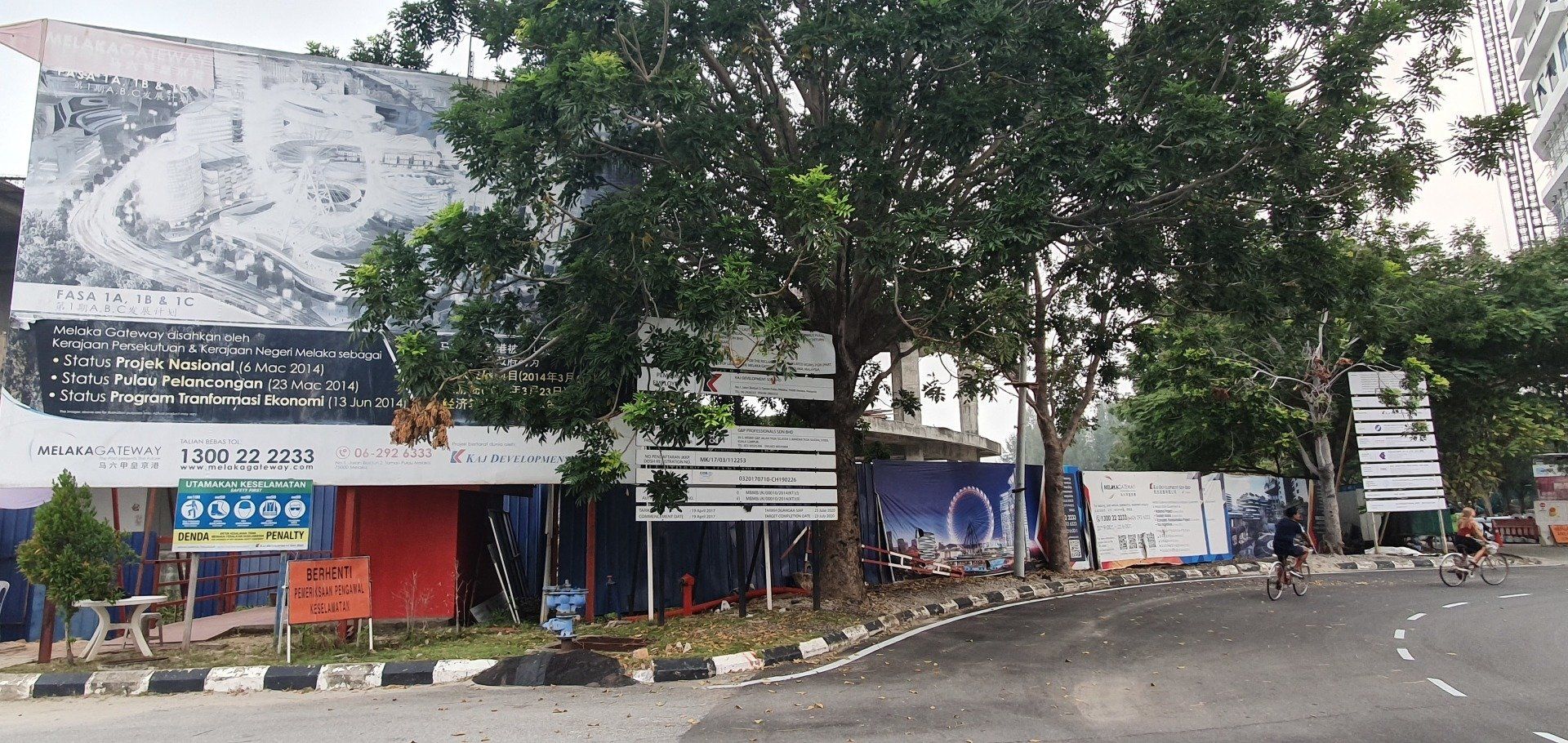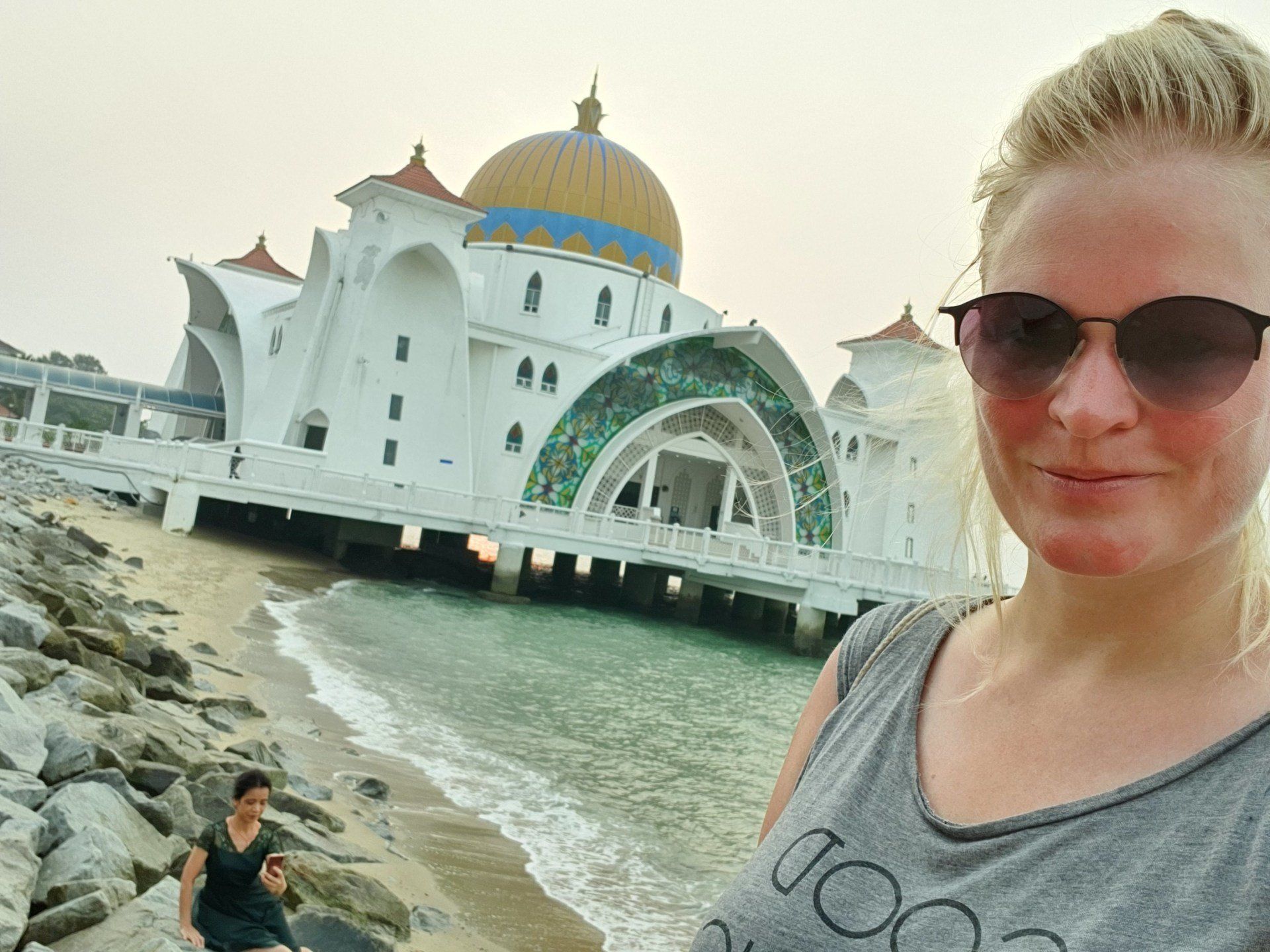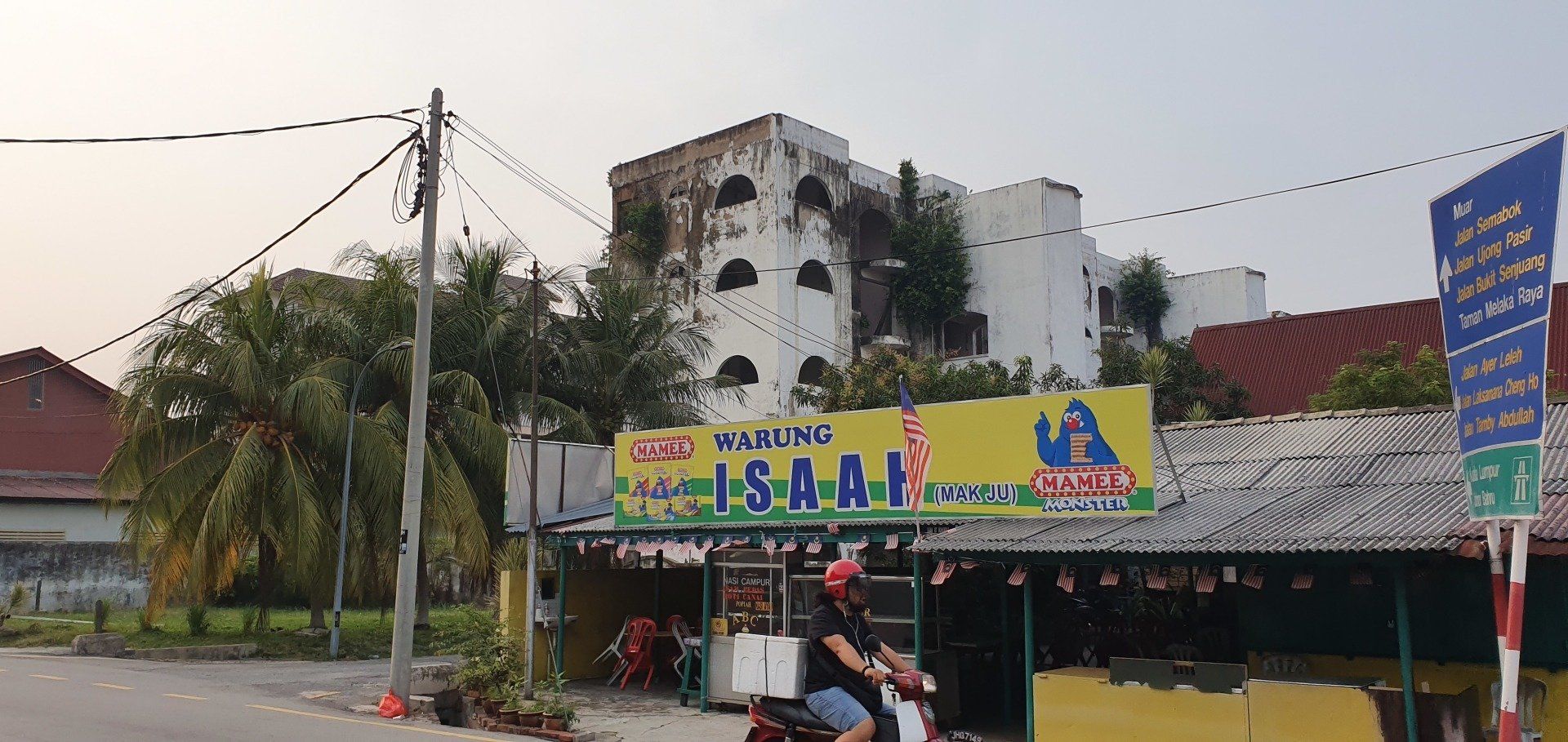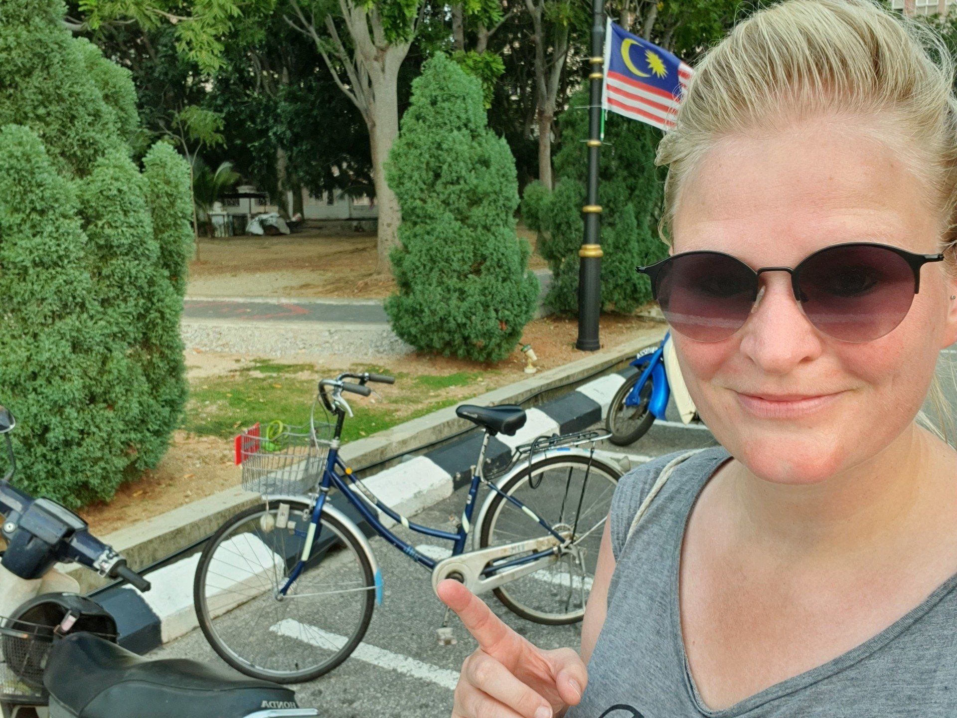 Am Nachmittag, gegen 4, schwinge ich mich dann auf ein Rad, das das Hostel umsonst zur Verfügung stellt, und fahre in Richtung "kleine Insel" vor Melakka, denn dort soll eine weitere Attraktion sein, eine relativ neu gebaute Moschee (2006). Grob die Richtung angesehen fahre ich einfach mal los und lande entsprechend in verschiedenen Wohngegenden, die man so sonst wohl nicht sehen würde. Und ich finde es krass, wie unterschiedlich die Häuser hier zu dem Stadtkern sind, an denen sich die Touris tummeln. Es ist irgendwie wie in einer anderen Welt, und, na ja, war zu erwarten, so werde ich dann auch angeguckt, wie ich da mit meinem klapprigen Damenrad planlos durch die Gegend gurke. Aber ich mag es, auch wenn es super warm ist, und man das Schwitzen gar nicht aufhört. Selbst, wenn man nix macht, es ist einfach eine drückende Hitze. Leider ist der Himmel hier auch von den Waldbränden in Indonesien zugenebelt und es wirkt recht trist. Sehr schade. Nach einigen Minuten spitzele ich immer mal auf mein Handy, um zu checken, wo ich eigentlich gerade bin. Und dann merke ich mir wieder grob die Richtung und nach etwa 8 Kilometern (von "direkten" 4, wenn ich es gefahren wäre) lande ich dann an einer Kreuzung zu einer Art Brücke, die mich zur Insel führt. Wie ich die überqueren soll, ist mir allerdings noch ein Rätsel, aber dann hänge ich mich einfach mal an ein paar Autos dran und bin drüben. Alles gut gegangen. An der Insel angekommen, sie nennen es dort "Harbour City", erwartet mich eine Geisterstadt. Eine riesige Baustelle, direkt am Kreisverkehr am "Eingang", deren Schilder schon ganz ausgebleicht sind, und die wohl stagniert. Ein riesiges Projekt, das grob zeigt, was hier entstehen soll. Dann fahre ich direkt in Richtung Moschee. Auch hier ist es leicht gruselig, denn überall hört man Krähen laut schreien. Und besonders das kleine Waldstück, das ich durchfahre, wirkt dadurch echt gruselig. Zum Glück spielen ein paar Kinder auf der Wiese Fußball, da bin ich etwas beruhigt. Schnell bin ich ja nun mit der Klapperkiste, deren Bremsen auch höchst suspekt sind, wirklich nicht. Vor dem Ziel parken schon Busse und es ist wirklich schön angelegt, am Wasser, recht modern. Ich gehe allerdings nicht rein, da ich nicht passend angezogen bin. Auch fürs Klo müsste man die Schuhe ausziehen, was mich nicht so reizt. ;)