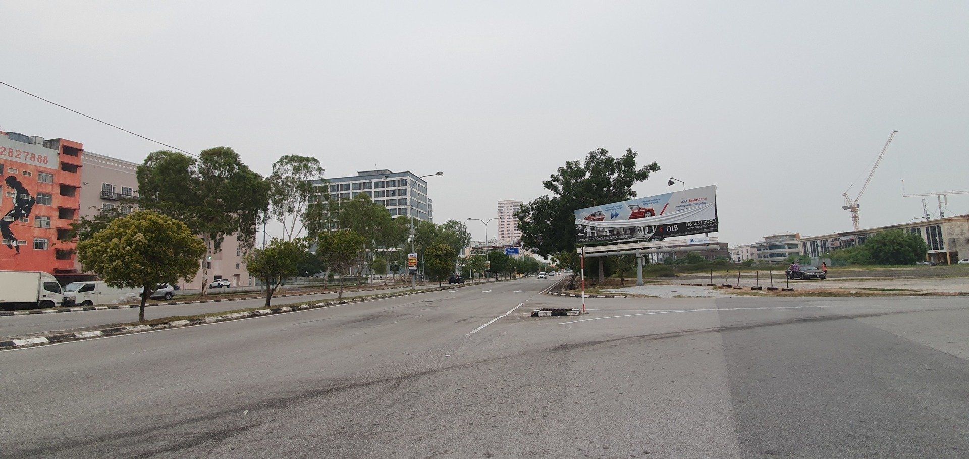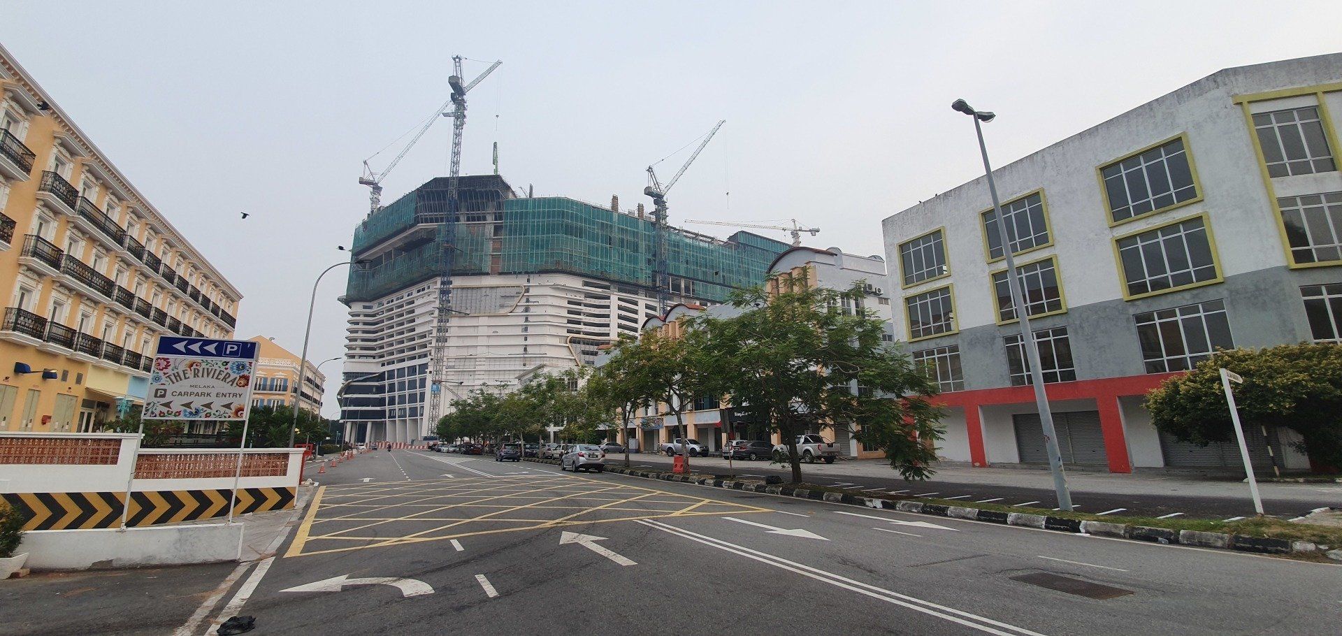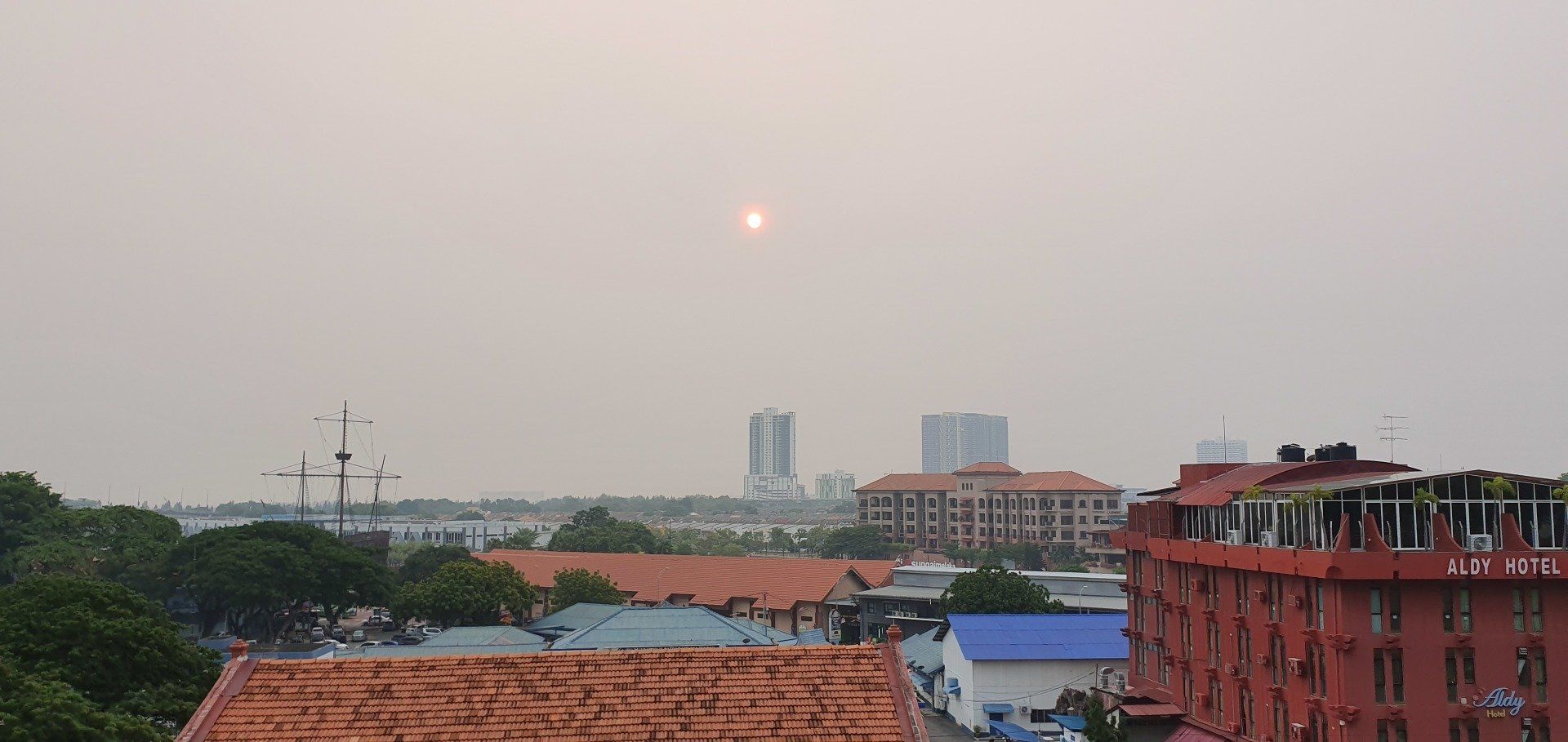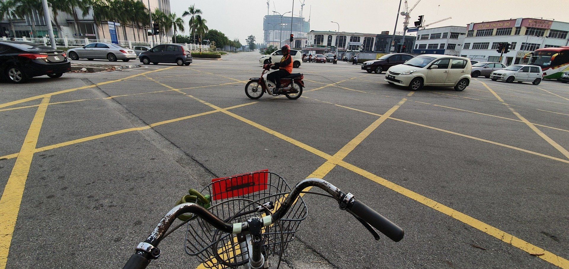 Am Nachmittag, gegen 4, schwinge ich mich dann auf ein Rad, das das Hostel umsonst zur Verfügung stellt, und fahre in Richtung "kleine Insel" vor Melakka, denn dort soll eine weitere Attraktion sein, eine relativ neu gebaute Moschee (2006). Grob die Richtung angesehen fahre ich einfach mal los und lande entsprechend in verschiedenen Wohngegenden, die man so sonst wohl nicht sehen würde. Und ich finde es krass, wie unterschiedlich die Häuser hier zu dem Stadtkern sind, an denen sich die Touris tummeln. Es ist irgendwie wie in einer anderen Welt, und, na ja, war zu erwarten, so werde ich dann auch angeguckt, wie ich da mit meinem klapprigen Damenrad planlos durch die Gegend gurke. Aber ich mag es, auch wenn es super warm ist, und man das Schwitzen gar nicht aufhört. Selbst, wenn man nix macht, es ist einfach eine drückende Hitze. Leider ist der Himmel hier auch von den Waldbränden in Indonesien zugenebelt und es wirkt recht trist. Sehr schade. Nach einigen Minuten spitzele ich immer mal auf mein Handy, um zu checken, wo ich eigentlich gerade bin. Und dann merke ich mir wieder grob die Richtung und nach etwa 8 Kilometern (von "direkten" 4, wenn ich es gefahren wäre) lande ich dann an einer Kreuzung zu einer Art Brücke, die mich zur Insel führt. Wie ich die überqueren soll, ist mir allerdings noch ein Rätsel, aber dann hänge ich mich einfach mal an ein paar Autos dran und bin drüben. Alles gut gegangen. An der Insel angekommen, sie nennen es dort "Harbour City", erwartet mich eine Geisterstadt. Eine riesige Baustelle, direkt am Kreisverkehr am "Eingang", deren Schilder schon ganz ausgebleicht sind, und die wohl stagniert. Ein riesiges Projekt, das grob zeigt, was hier entstehen soll. Dann fahre ich direkt in Richtung Moschee. Auch hier ist es leicht gruselig, denn überall hört man Krähen laut schreien. Und besonders das kleine Waldstück, das ich durchfahre, wirkt dadurch echt gruselig. Zum Glück spielen ein paar Kinder auf der Wiese Fußball, da bin ich etwas beruhigt. Schnell bin ich ja nun mit der Klapperkiste, deren Bremsen auch höchst suspekt sind, wirklich nicht. Vor dem Ziel parken schon Busse und es ist wirklich schön angelegt, am Wasser, recht modern. Ich gehe allerdings nicht rein, da ich nicht passend angezogen bin. Auch fürs Klo müsste man die Schuhe ausziehen, was mich nicht so reizt. ;)