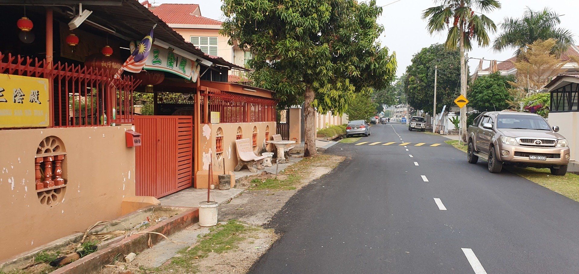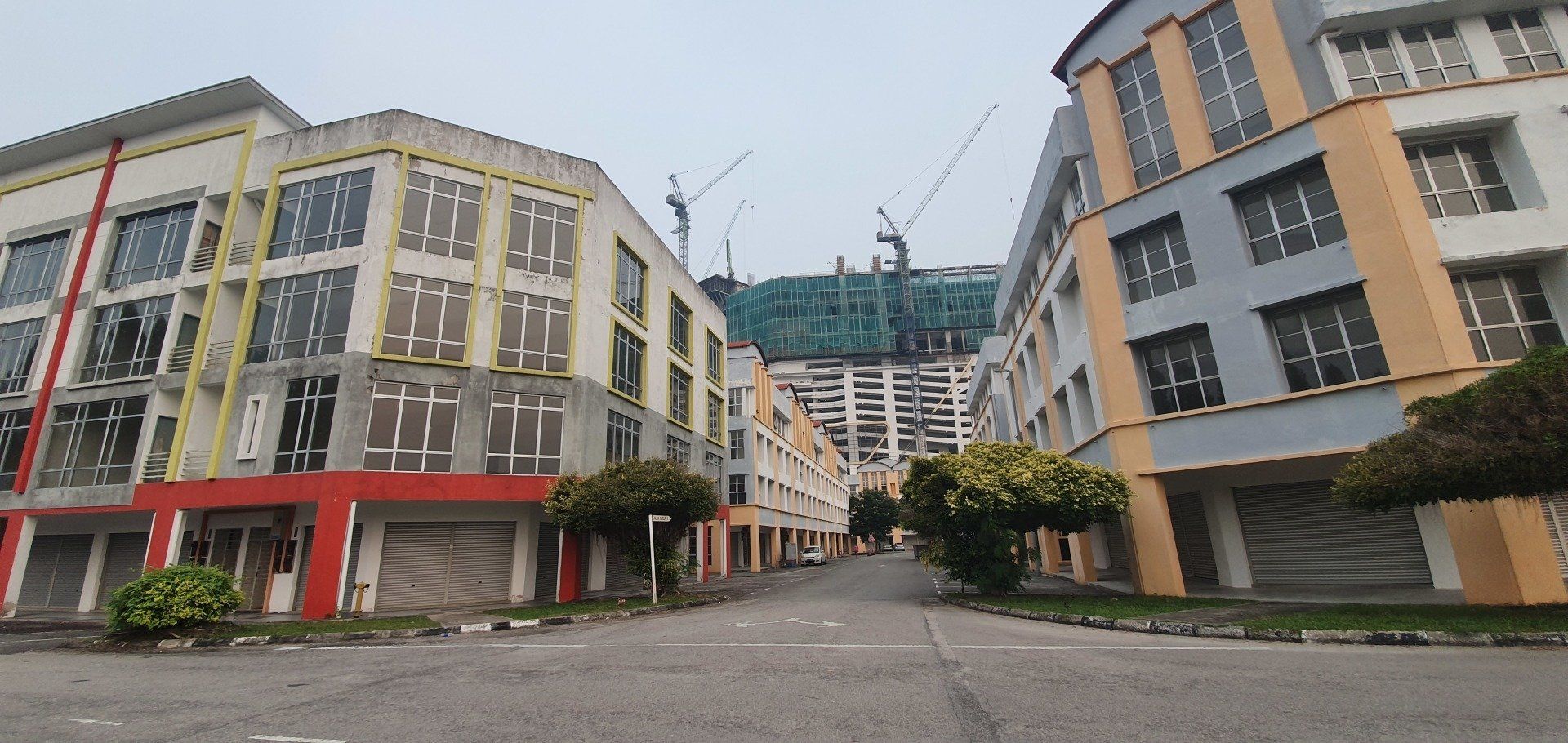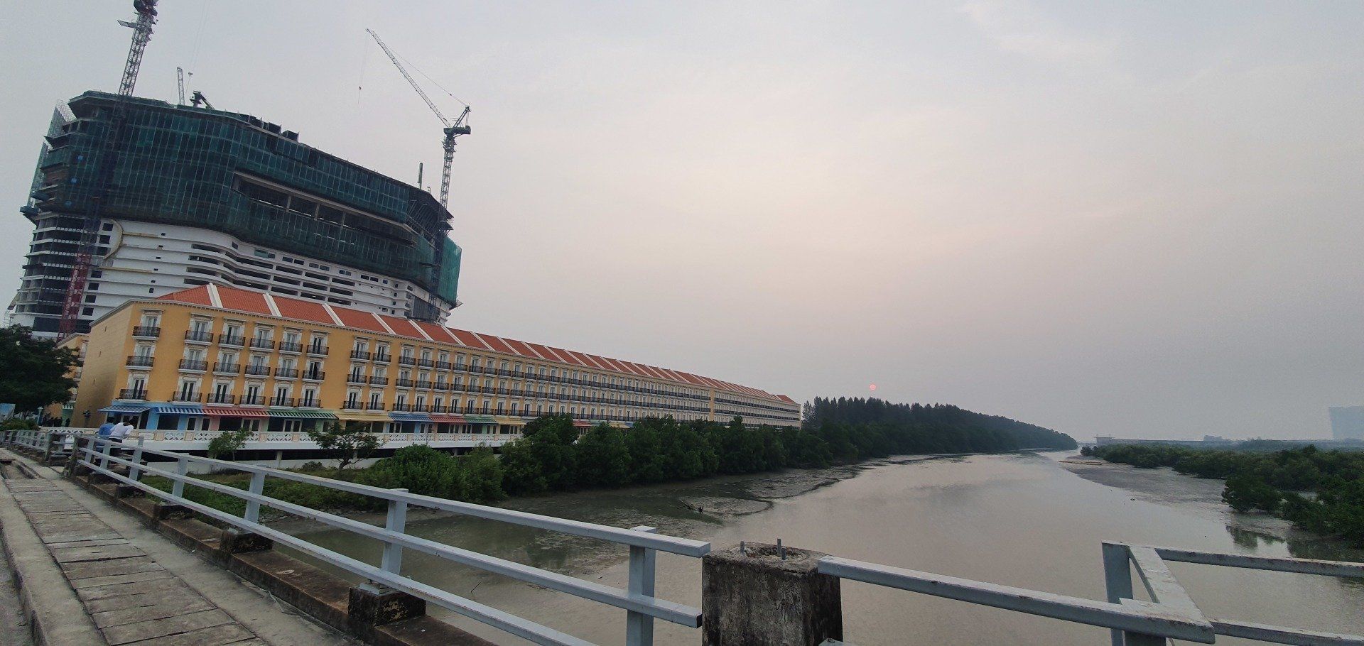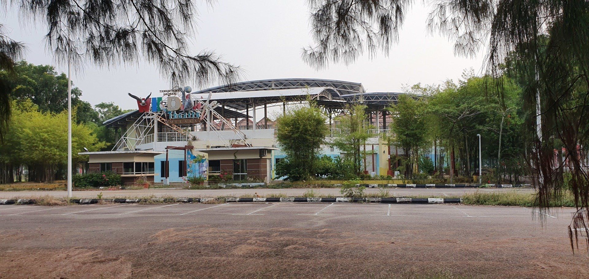 Am Nachmittag, gegen 4, schwinge ich mich dann auf ein Rad, das das Hostel umsonst zur Verfügung stellt, und fahre in Richtung "kleine Insel" vor Melakka, denn dort soll eine weitere Attraktion sein, eine relativ neu gebaute Moschee (2006). Grob die Richtung angesehen fahre ich einfach mal los und lande entsprechend in verschiedenen Wohngegenden, die man so sonst wohl nicht sehen würde. Und ich finde es krass, wie unterschiedlich die Häuser hier zu dem Stadtkern sind, an denen sich die Touris tummeln. Es ist irgendwie wie in einer anderen Welt, und, na ja, war zu erwarten, so werde ich dann auch angeguckt, wie ich da mit meinem klapprigen Damenrad planlos durch die Gegend gurke. Aber ich mag es, auch wenn es super warm ist, und man das Schwitzen gar nicht aufhört. Selbst, wenn man nix macht, es ist einfach eine drückende Hitze. Leider ist der Himmel hier auch von den Waldbränden in Indonesien zugenebelt und es wirkt recht trist. Sehr schade. Nach einigen Minuten spitzele ich immer mal auf mein Handy, um zu checken, wo ich eigentlich gerade bin. Und dann merke ich mir wieder grob die Richtung und nach etwa 8 Kilometern (von "direkten" 4, wenn ich es gefahren wäre) lande ich dann an einer Kreuzung zu einer Art Brücke, die mich zur Insel führt. Wie ich die überqueren soll, ist mir allerdings noch ein Rätsel, aber dann hänge ich mich einfach mal an ein paar Autos dran und bin drüben. Alles gut gegangen. An der Insel angekommen, sie nennen es dort "Harbour City", erwartet mich eine Geisterstadt. Eine riesige Baustelle, direkt am Kreisverkehr am "Eingang", deren Schilder schon ganz ausgebleicht sind, und die wohl stagniert. Ein riesiges Projekt, das grob zeigt, was hier entstehen soll. Dann fahre ich direkt in Richtung Moschee. Auch hier ist es leicht gruselig, denn überall hört man Krähen laut schreien. Und besonders das kleine Waldstück, das ich durchfahre, wirkt dadurch echt gruselig. Zum Glück spielen ein paar Kinder auf der Wiese Fußball, da bin ich etwas beruhigt. Schnell bin ich ja nun mit der Klapperkiste, deren Bremsen auch höchst suspekt sind, wirklich nicht. Vor dem Ziel parken schon Busse und es ist wirklich schön angelegt, am Wasser, recht modern. Ich gehe allerdings nicht rein, da ich nicht passend angezogen bin. Auch fürs Klo müsste man die Schuhe ausziehen, was mich nicht so reizt. ;)