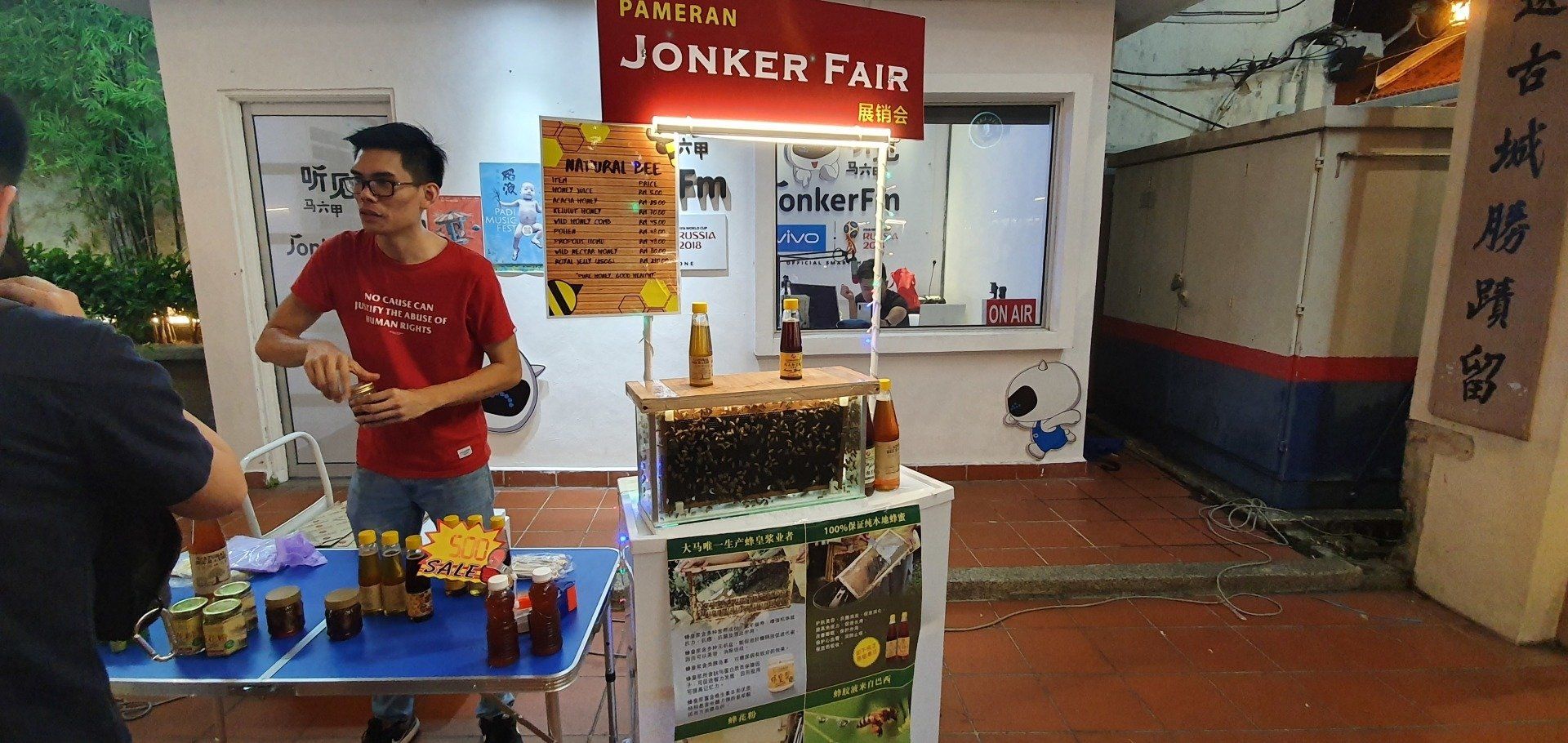 Auch als ich auf dem Rückweg auf der anderen Straßenseite laufe, zieht es mich in einen kleinen Seitenteil mit Ständchen und ich denke, das ist ja nette Musik. Und dann ist es das Studio des hiesigen Radios, und der Moderator singt gerade live. Nicht schlecht. Klingt wie vom Band. Dann gibt es für mich noch Mais und Früchte (okay, mit Schoki überzogen), und dann gehts zurück ins Hostel. Bisheriger Eindruck ist schon echt süß und ich bin überrascht, dass ich in nur 4 Stunden schon die größten "must sees" von Malakka durch habe. Dann schaue ich am Abend mal noch, was ich am nächsten (Nachmit)tag machen kann.