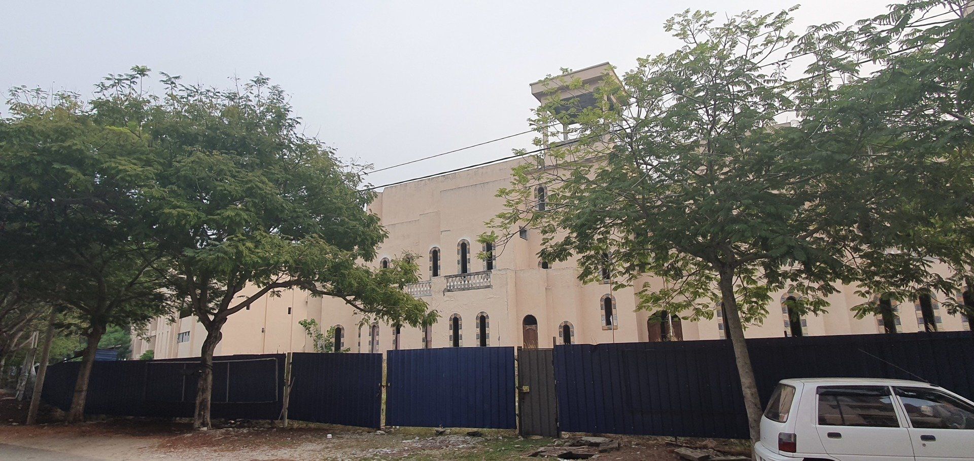 Dann wollte ich gerne noch zu einem auf Maps.me ausgeschilderten Aussichtspunkt, fast neben der Moschee. Allerdings trennt mich (und einige andere) ein Graben davon. Man könnte zwar runterspringen und rüber laufen (aktuell ist kein Wasser drin gewesen), aber wie dann wieder hochkommen? Und was, wenn auf einmal doch Wasser kommt? Nein, nein, ich kenne mich ja. Ich schwinge mich noch aufs Rad und versuche, eine Lücke in dem langen blauen Wellblechzaun zu finden, wo man rein kann. Aber vergeblich. Das einzige, was auch auf Maps.me steht, ist, dass es "Arab city" sein soll, wobei hier auch "on hold" steht. Wieder eine Geisterstadt, ein ewig langes Gebäude (sieht schön aus von außen), aber menschenleer und wohl nicht fertig geworden. Ich habe den Eindruck, man hatte Großes vor mit diesem Inselchen, und irgendwie erinnert es mich sogar an die künstlichen Inseln von Dubai. Nur dass da der Bau fertig ist. Und hier kriegt man es nicht hin.