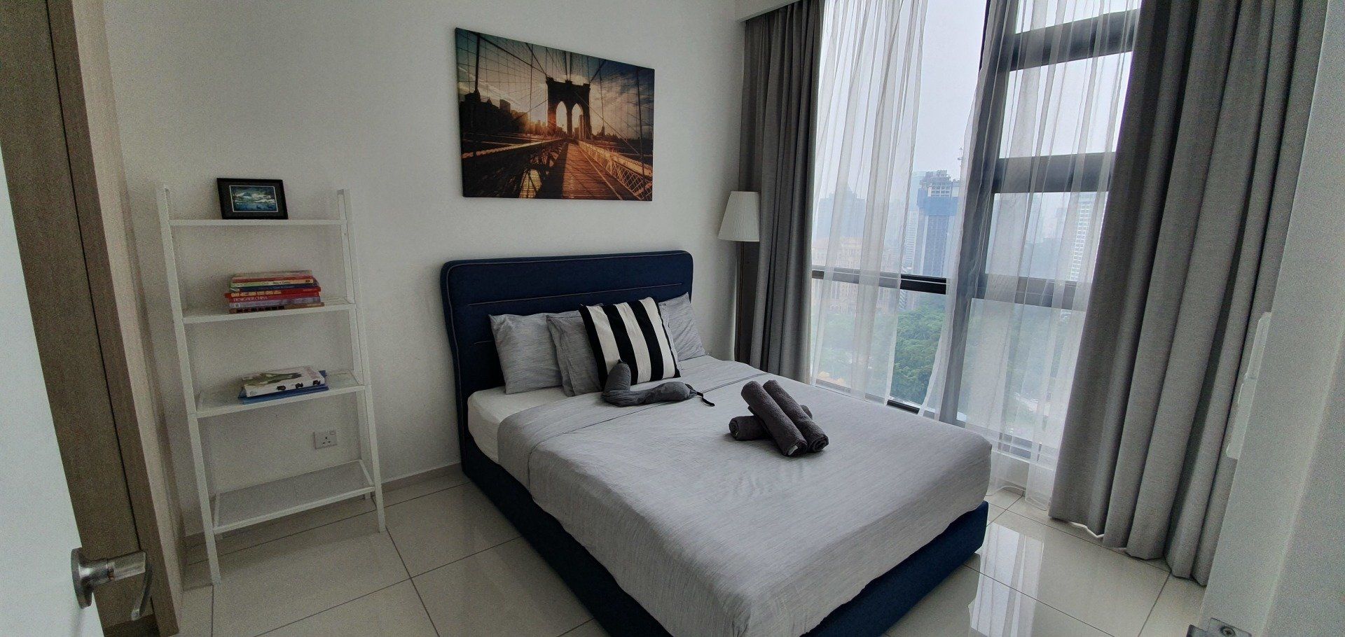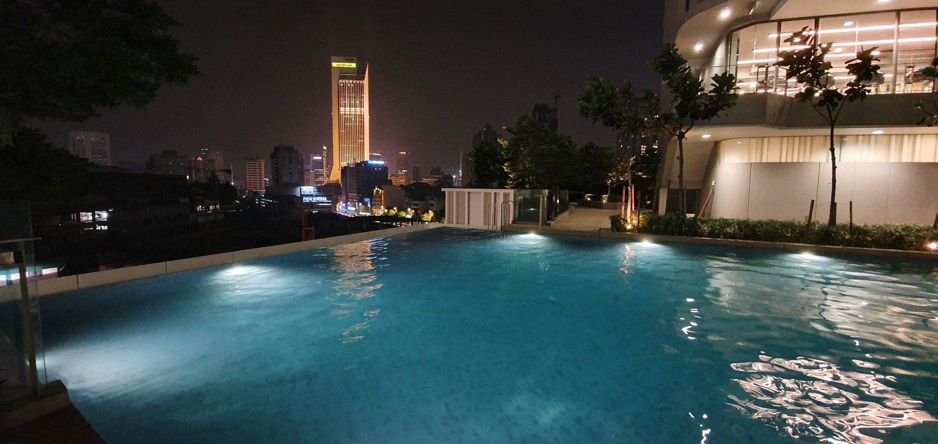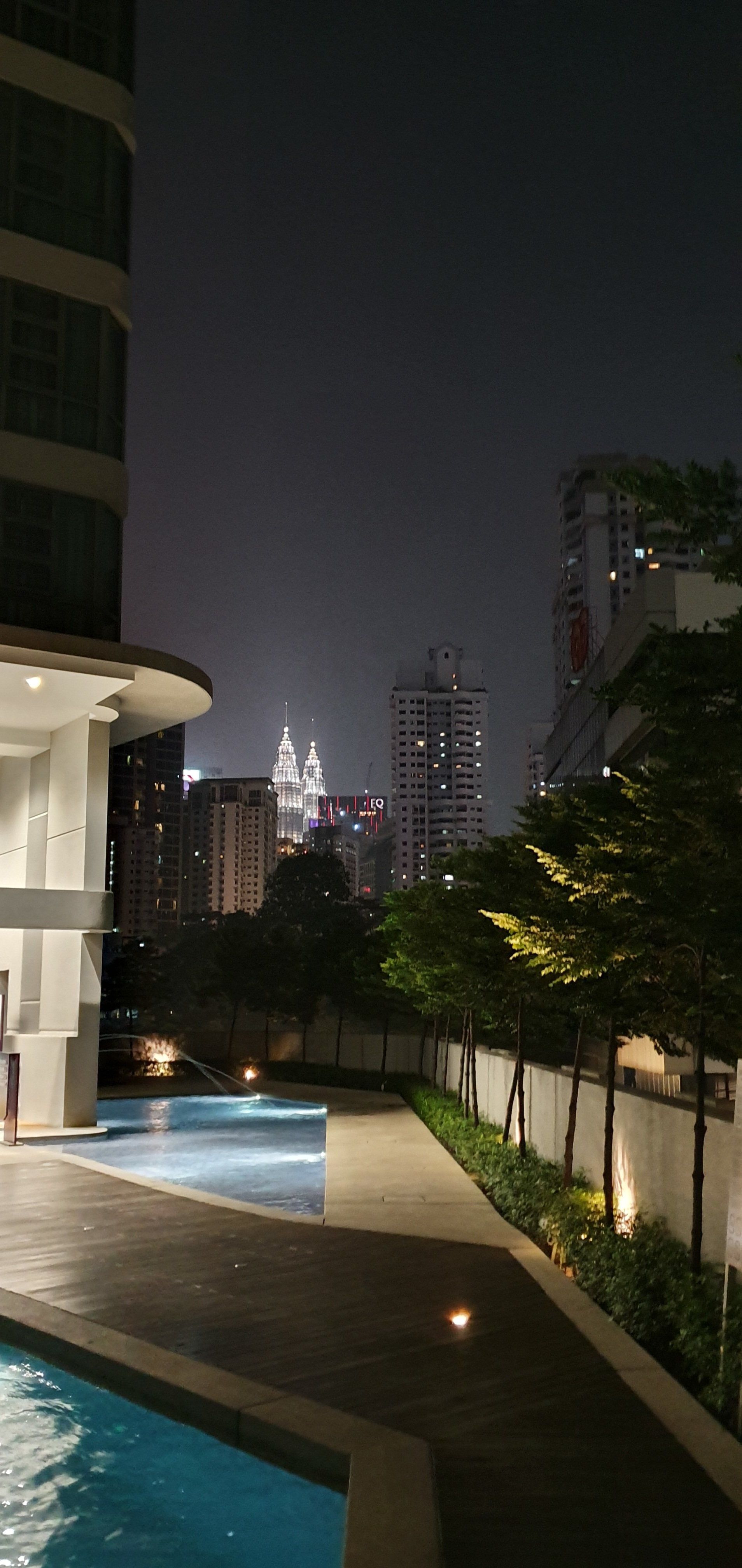 Ich fühle mich gleich wohl und verteile meinen ganzen Kram überall. Haha. Dann drehe ich aber noch eine Runde über die Annehmlichkeiten der Unterkunft: Es gibt einen Infinitypool im 6. Stock, der sehr schick ist, und im Nordturm noch einen Pool im 42. Stock mit cooler Aussicht auf die Stadt inklusive beleuchteter Skyline und den berühmten Petronas Zwillingstürmen.