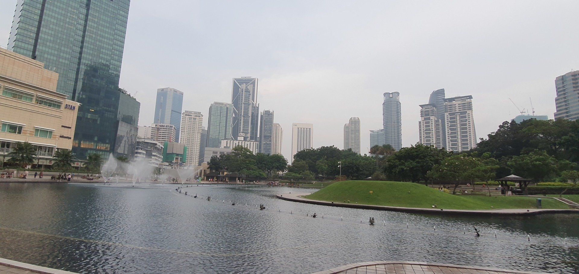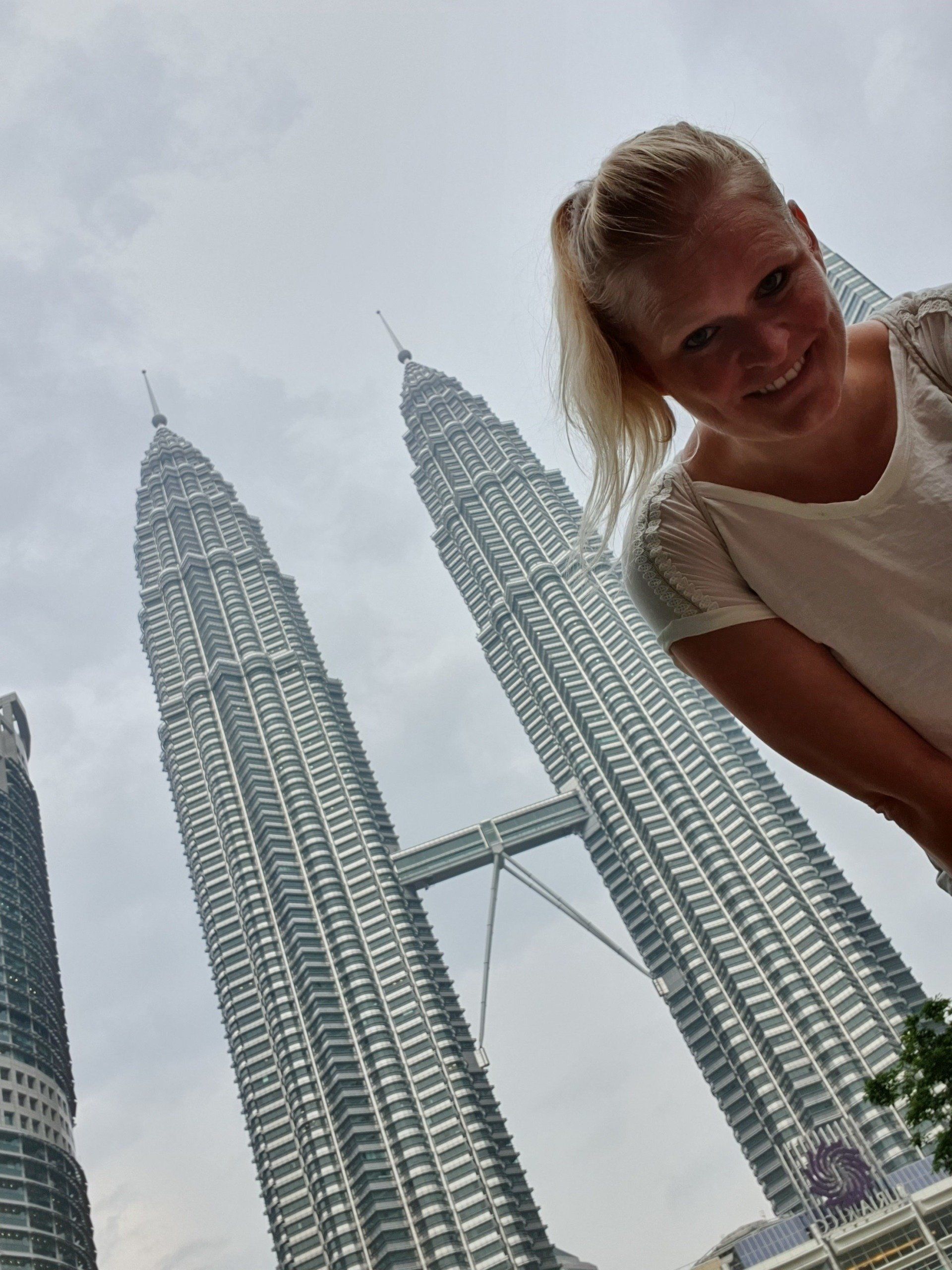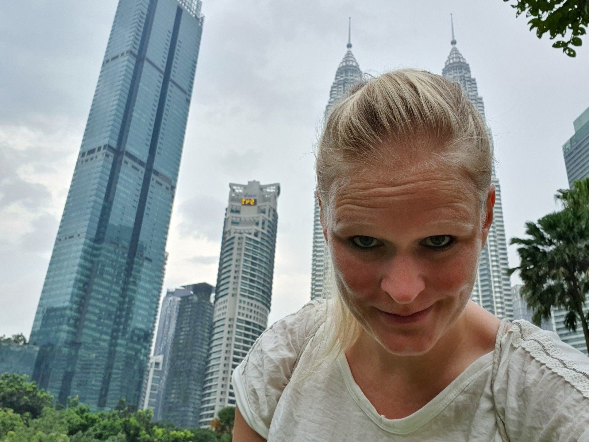 Um 10 werde ich durch Bohrarbeiten nebenan aus dem Bett geschmissen. Grummel. Aber ich habe gut geschlafen, nur etwas zu kurz, und dann bin ich den ganzen Vormittag einfach fleißig. Wie auch zuvor will ich tagsüber sowieso nicht zu früh raus, also reicht es auch noch mal für ein Mittagsschläfchen. Auch in Kuala Lumpur ist der Himmel mit dem Dunst der brennenden Wälder in Indonesien bedeckt, sehr, sehr schade. Wieder gegen 5 mache ich mich auf den Weg zum Erkunden der Stadt, mit dem Ziel: Petronas Zwillingstürme und der vorgelagerte Park. Laut Navi 2.5 km, die easy zu Fuß zu bewältigen sind. Ich merke mir also wieder grob die Richtung und ziehe los. Mit genügend Wasser bewaffnet, das ist ganz wichtig. Auch wenn die Sonne ihren Weg durch den Dunst nicht schafft, es ist trotzdem mega drückend warm.