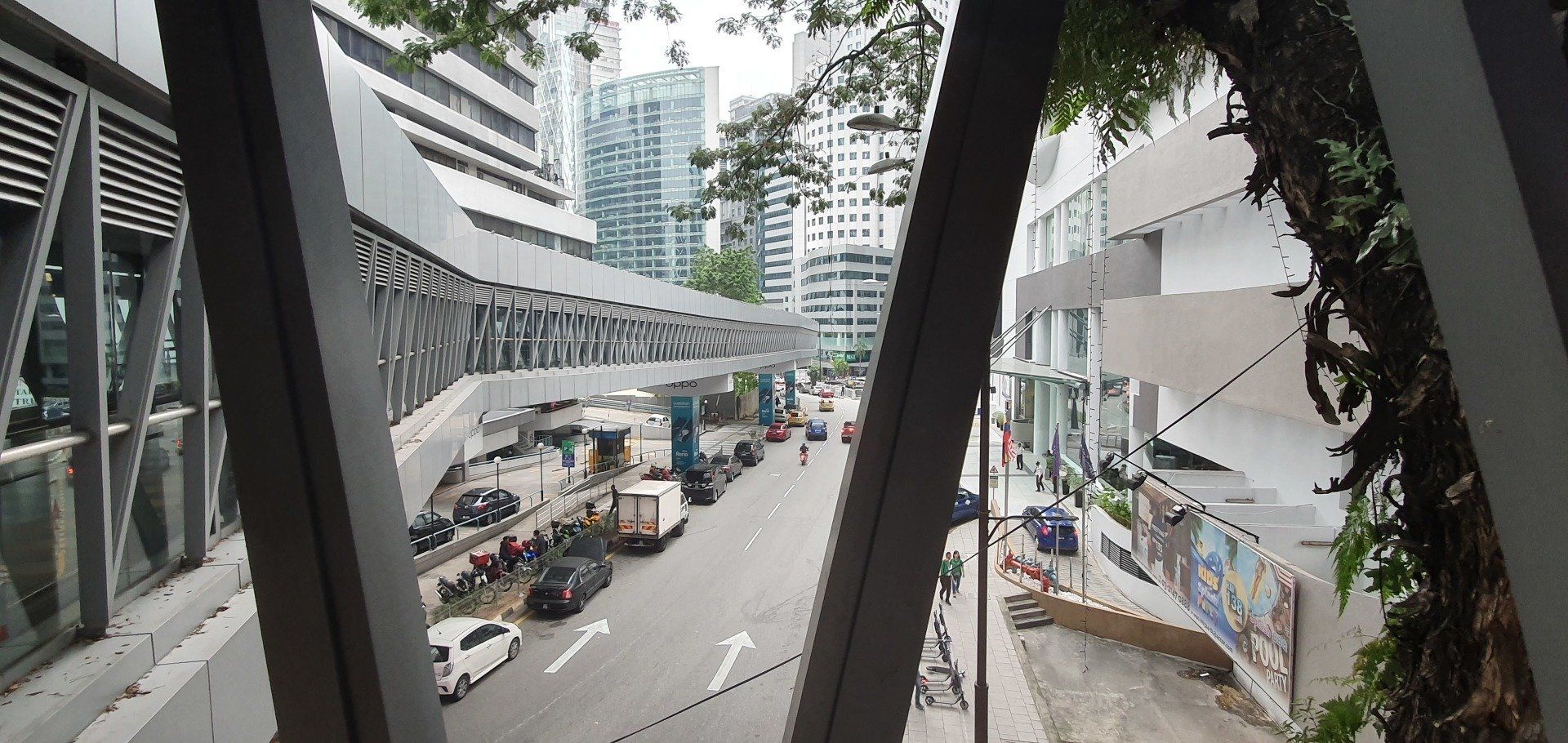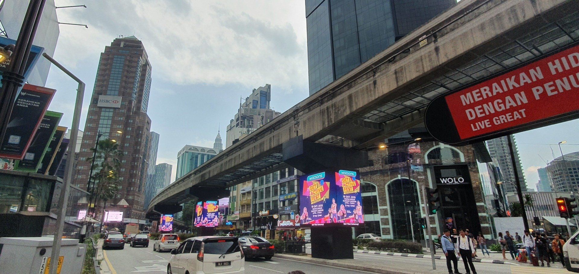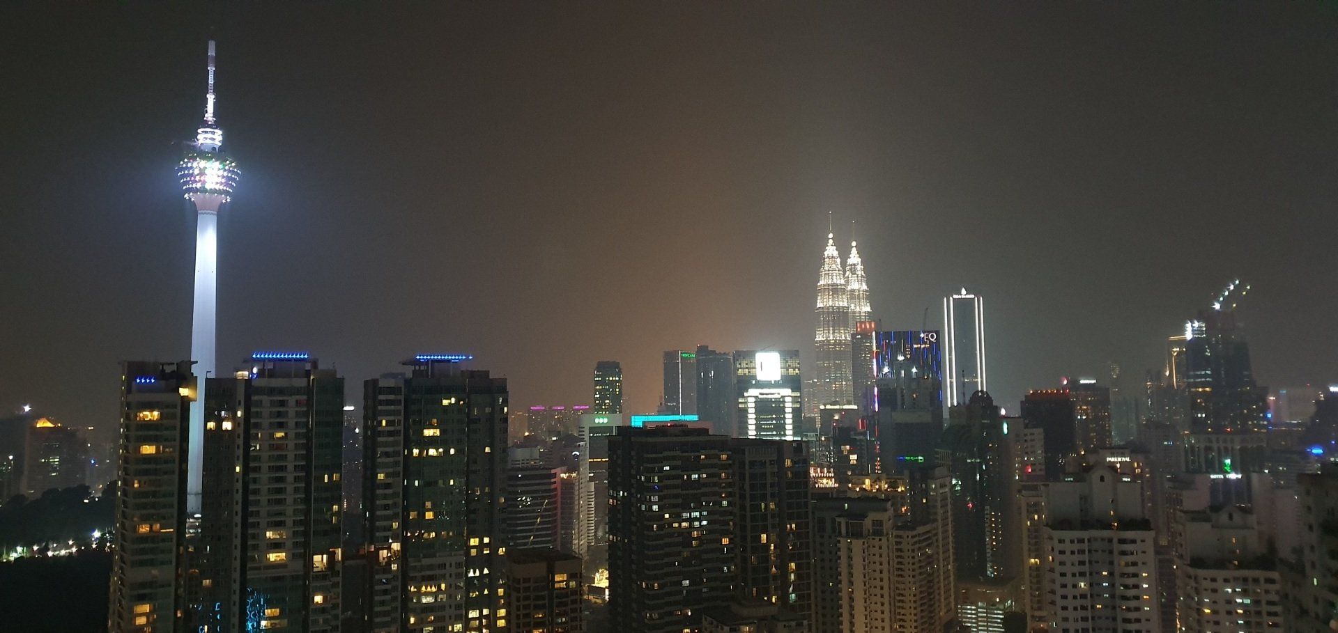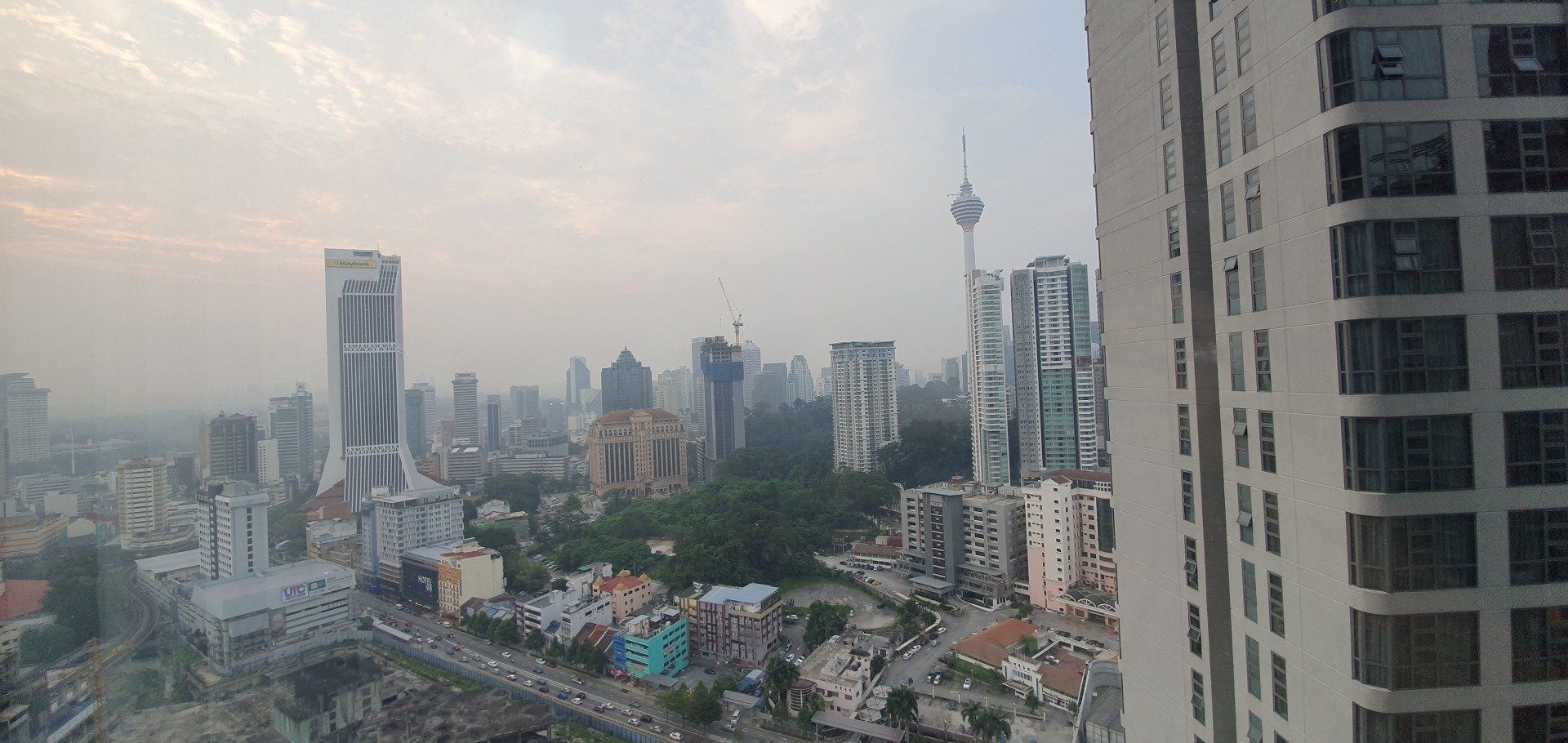 Um 10 werde ich durch Bohrarbeiten nebenan aus dem Bett geschmissen. Grummel. Aber ich habe gut geschlafen, nur etwas zu kurz, und dann bin ich den ganzen Vormittag einfach fleißig. Wie auch zuvor will ich tagsüber sowieso nicht zu früh raus, also reicht es auch noch mal für ein Mittagsschläfchen. Auch in Kuala Lumpur ist der Himmel mit dem Dunst der brennenden Wälder in Indonesien bedeckt, sehr, sehr schade. Wieder gegen 5 mache ich mich auf den Weg zum Erkunden der Stadt, mit dem Ziel: Petronas Zwillingstürme und der vorgelagerte Park. Laut Navi 2.5 km, die easy zu Fuß zu bewältigen sind. Ich merke mir also wieder grob die Richtung und ziehe los. Mit genügend Wasser bewaffnet, das ist ganz wichtig. Auch wenn die Sonne ihren Weg durch den Dunst nicht schafft, es ist trotzdem mega drückend warm.