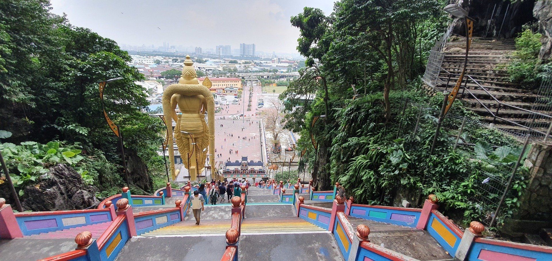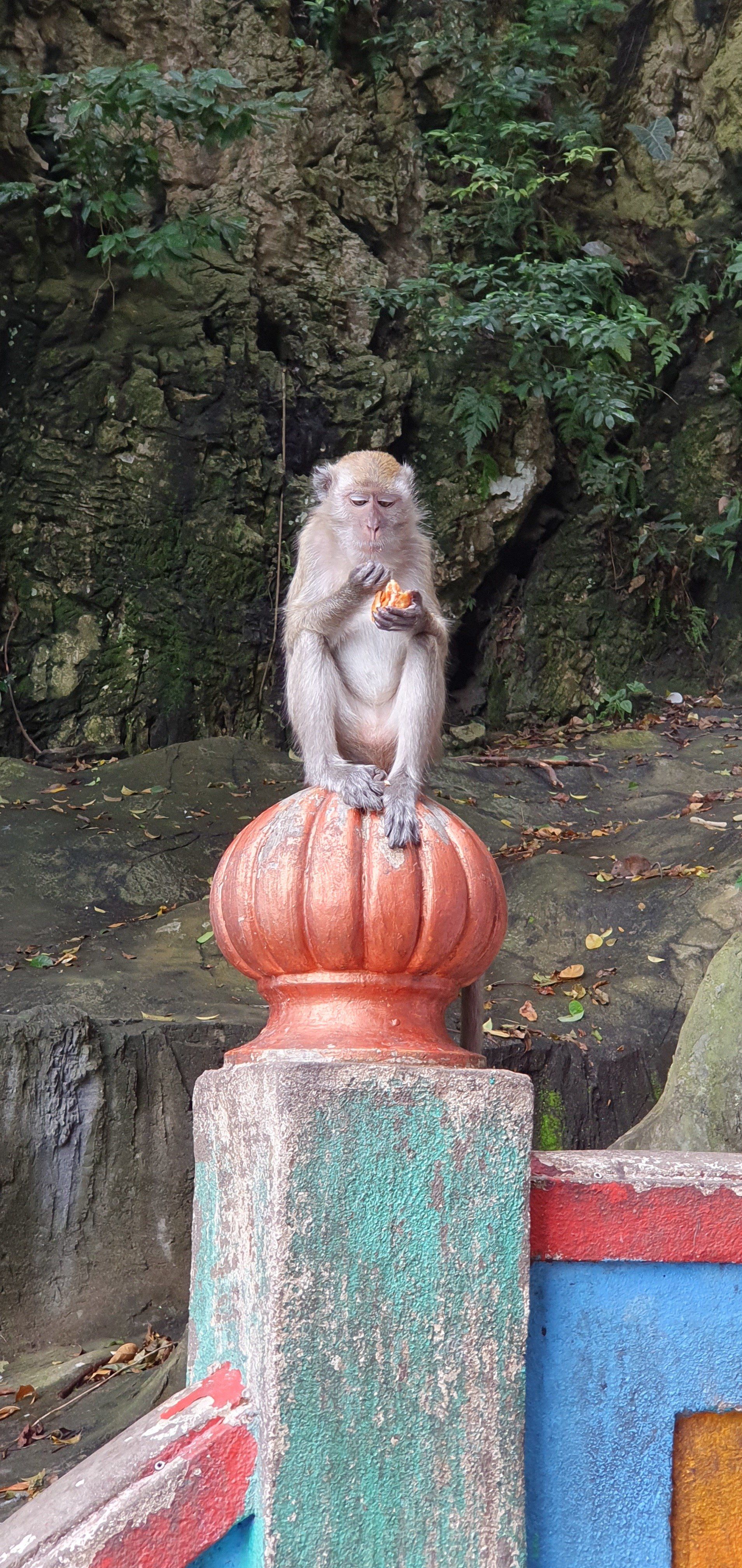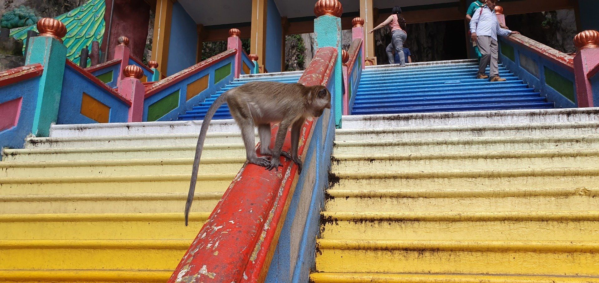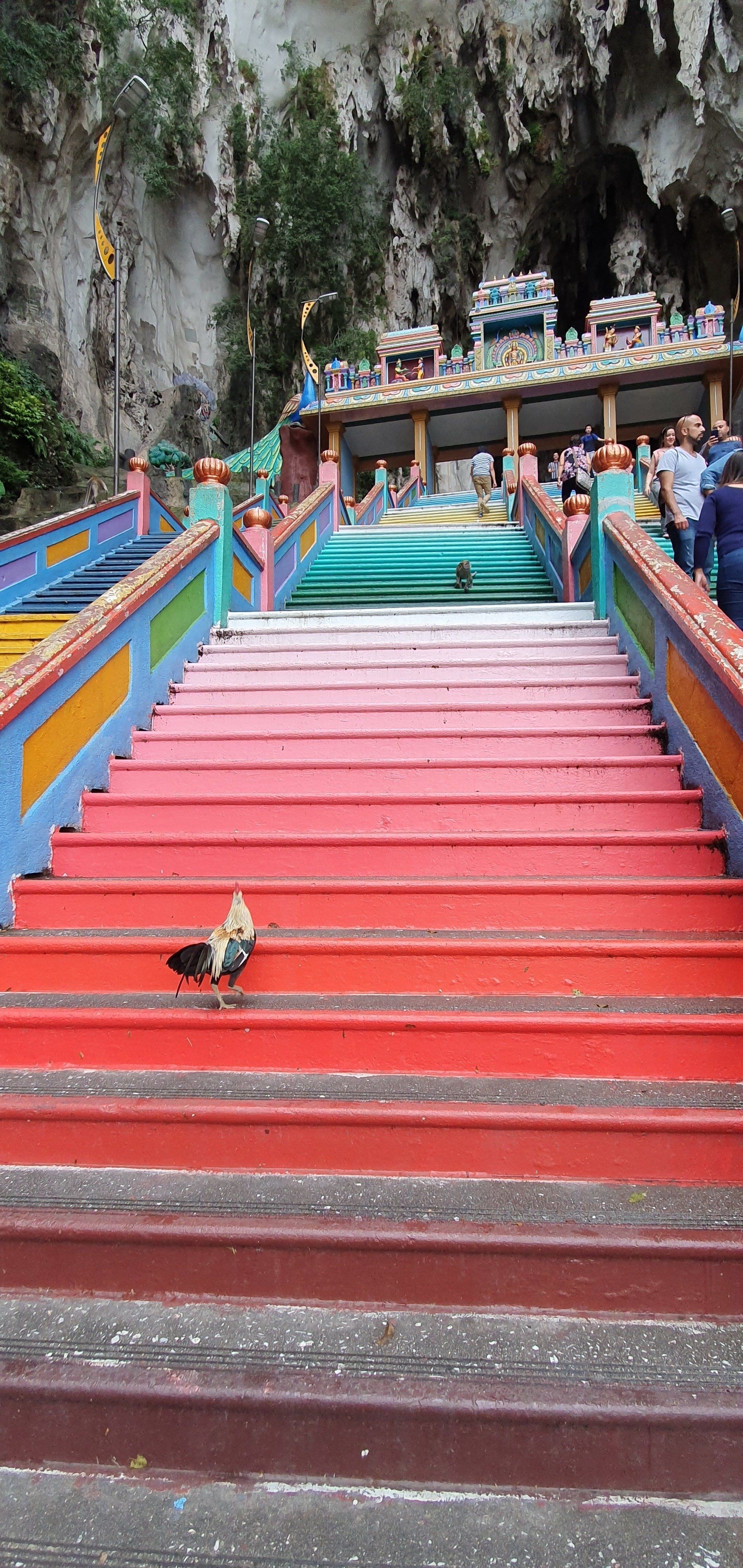 Angekommen am Ziel thront schon der Riesen-Buddha in Gold neben den bunten Treppen (272 an der Zahl), die man erklimmen muss, um sich die Tempel oben in den Höhlen anzusehen. Yeah, meine Lieblingsaufgabe, Treppen hochlaufen. Unten auf dem Vorplatz herrscht schon reges Treiben, und besonders viele Äffchen treiben hier ihr Unwesen. Dazu kommen noch etliche Tauben, und viele (hauptsächlich Chinesen) finden es witzig, sie aufzuschrecken und Bilder davon zu machen, sie mittendrin. Etwas nervig, weil man sich da natürlich erst mal sicher in Richtung Treppen bewegen muss und drauf achten muss, dass man weder eine Taube an den Kopf, noch einen Schiss auf den Kopf kriegt. Aber ich denke, ich habe es gut gemeistert und starte meinen Weg, die Treppen hoch. Es kostet keinen Eintritt, man muss allerdings einen Sarong leihen, der umgerechnet 20 Cent kostet. Natürlich kann man auch einen eigenen mitnehmen, dann ist es umsonst. Es gibt nur verschiedene Spendenboxen, wo man einen kleinen Obolus reinpacken kann. Die Farben der Treppen machen einiges her und die gelegentlichen Pausen zwischendurch ermöglichen auch immer mal wieder einen netten Blick in die Ferne. Zwar ist der Himmel immer noch voller Dunst der Waldbrände in Indonesien, aber die Aussicht ist dennoch nicht ohne. An der Spitze angekommen finde ich die Höhlen durchaus imposant, und auch die eingebauten Tempel können sich sehen lassen. Es ist kein riesiges Gelände, sondern eher überschaubar, und so drehe ich eine kleine Runde, immer mit Blick nach oben, weil die Formationen, die sich hier bieten, einfach sehenswert sind. Dann geht es langsam schon wieder zurück, kurz noch einen Smalltalk-Foto-Stopp mit ein paar Indern. Und dann laufe ich wieder runter, immer die Affen weitestgehend im Blick. Denn man weiß nie, was die Knechte aushecken.