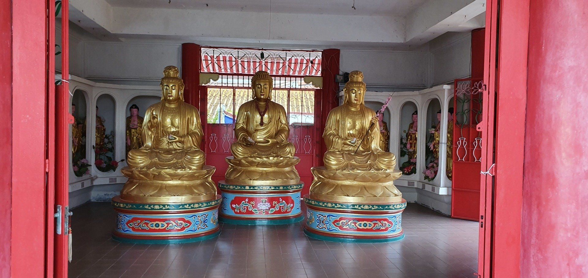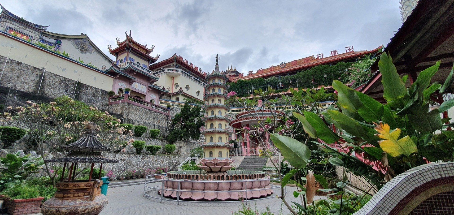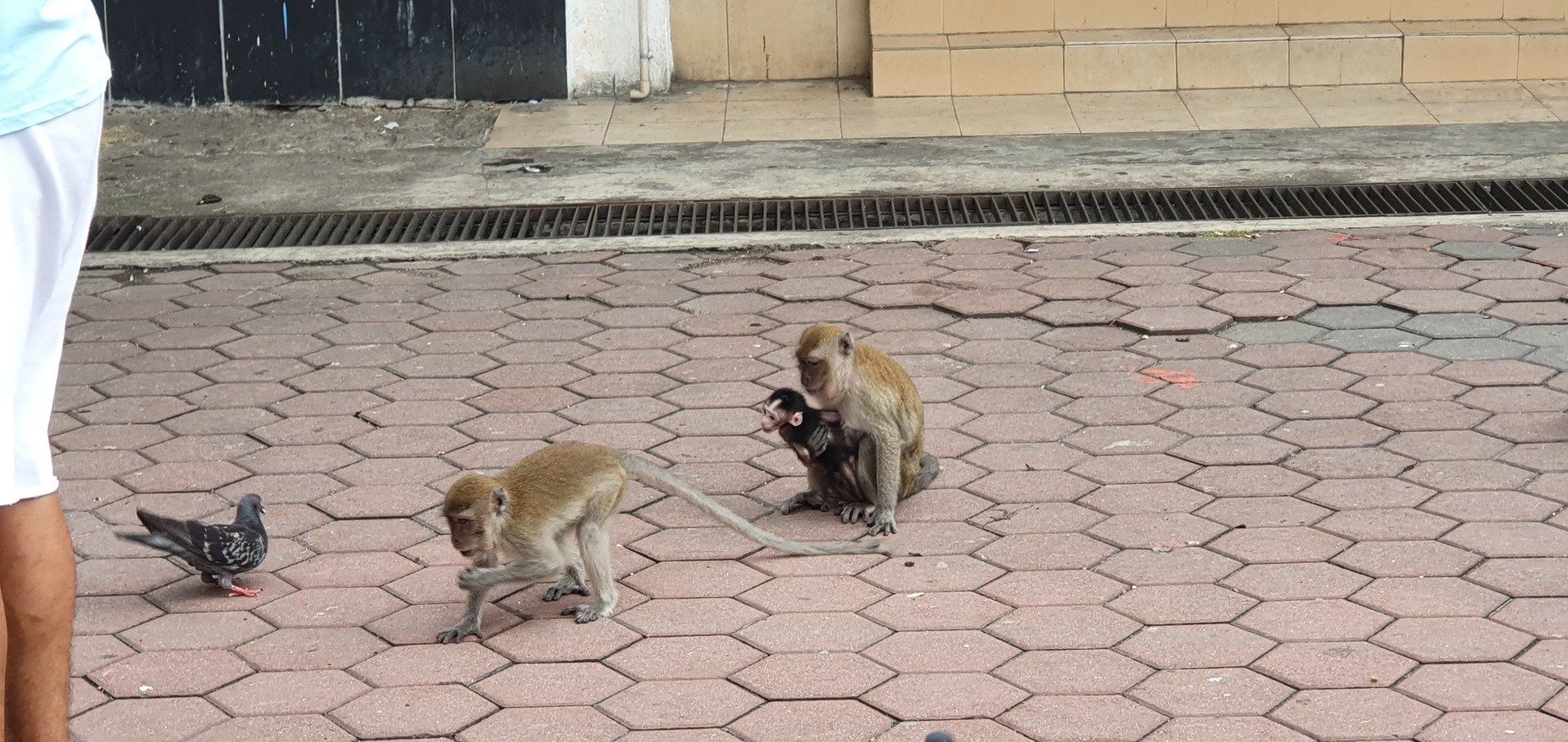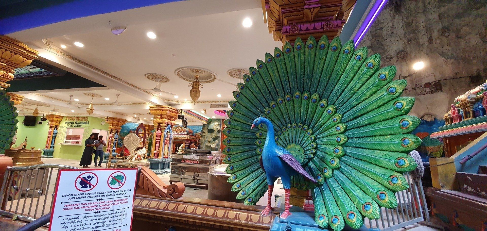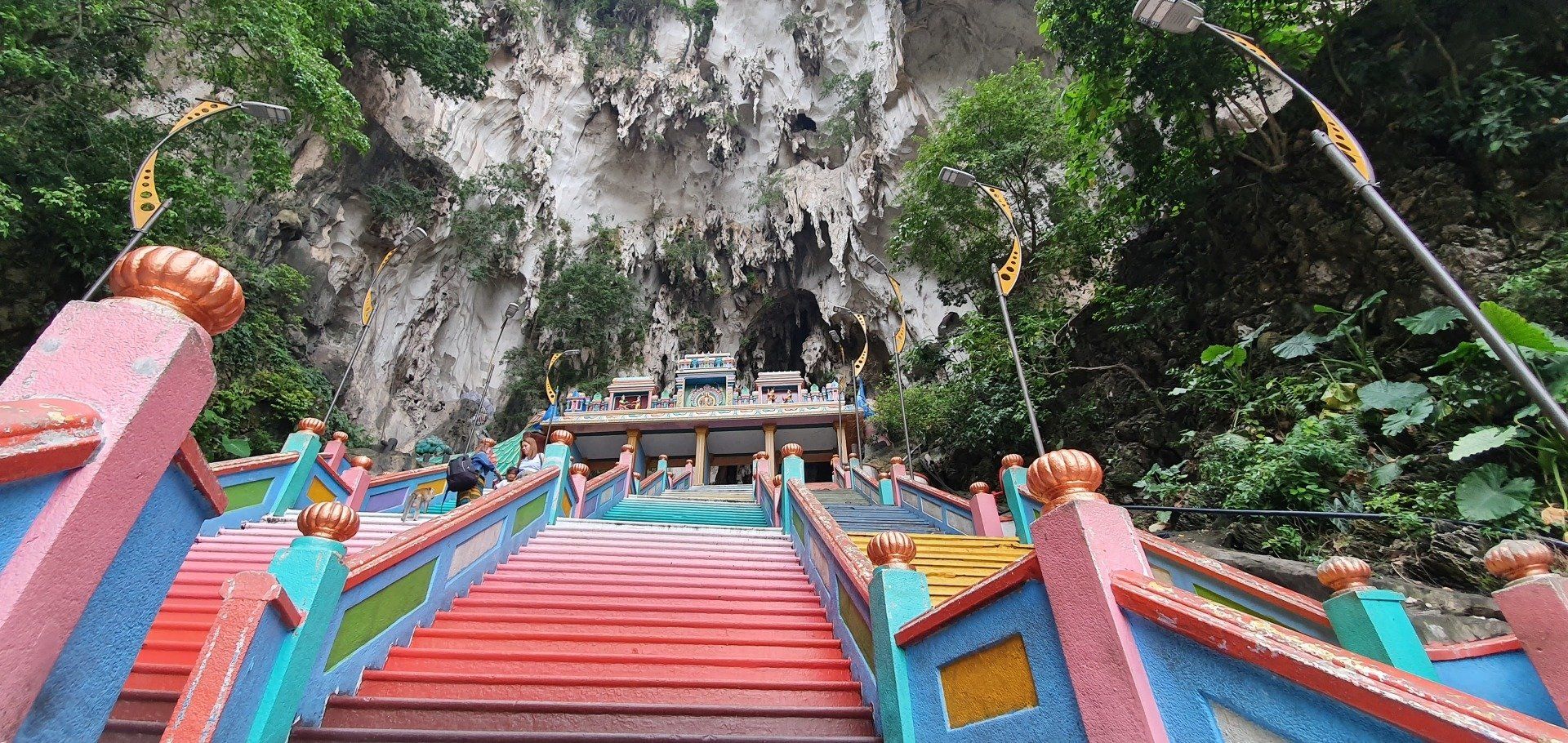 Angekommen am Ziel thront schon der Riesen-Buddha in Gold neben den bunten Treppen (272 an der Zahl), die man erklimmen muss, um sich die Tempel oben in den Höhlen anzusehen. Yeah, meine Lieblingsaufgabe, Treppen hochlaufen. Unten auf dem Vorplatz herrscht schon reges Treiben, und besonders viele Äffchen treiben hier ihr Unwesen. Dazu kommen noch etliche Tauben, und viele (hauptsächlich Chinesen) finden es witzig, sie aufzuschrecken und Bilder davon zu machen, sie mittendrin. Etwas nervig, weil man sich da natürlich erst mal sicher in Richtung Treppen bewegen muss und drauf achten muss, dass man weder eine Taube an den Kopf, noch einen Schiss auf den Kopf kriegt. Aber ich denke, ich habe es gut gemeistert und starte meinen Weg, die Treppen hoch. Es kostet keinen Eintritt, man muss allerdings einen Sarong leihen, der umgerechnet 20 Cent kostet. Natürlich kann man auch einen eigenen mitnehmen, dann ist es umsonst. Es gibt nur verschiedene Spendenboxen, wo man einen kleinen Obolus reinpacken kann. Die Farben der Treppen machen einiges her und die gelegentlichen Pausen zwischendurch ermöglichen auch immer mal wieder einen netten Blick in die Ferne. Zwar ist der Himmel immer noch voller Dunst der Waldbrände in Indonesien, aber die Aussicht ist dennoch nicht ohne. An der Spitze angekommen finde ich die Höhlen durchaus imposant, und auch die eingebauten Tempel können sich sehen lassen. Es ist kein riesiges Gelände, sondern eher überschaubar, und so drehe ich eine kleine Runde, immer mit Blick nach oben, weil die Formationen, die sich hier bieten, einfach sehenswert sind. Dann geht es langsam schon wieder zurück, kurz noch einen Smalltalk-Foto-Stopp mit ein paar Indern. Und dann laufe ich wieder runter, immer die Affen weitestgehend im Blick. Denn man weiß nie, was die Knechte aushecken.