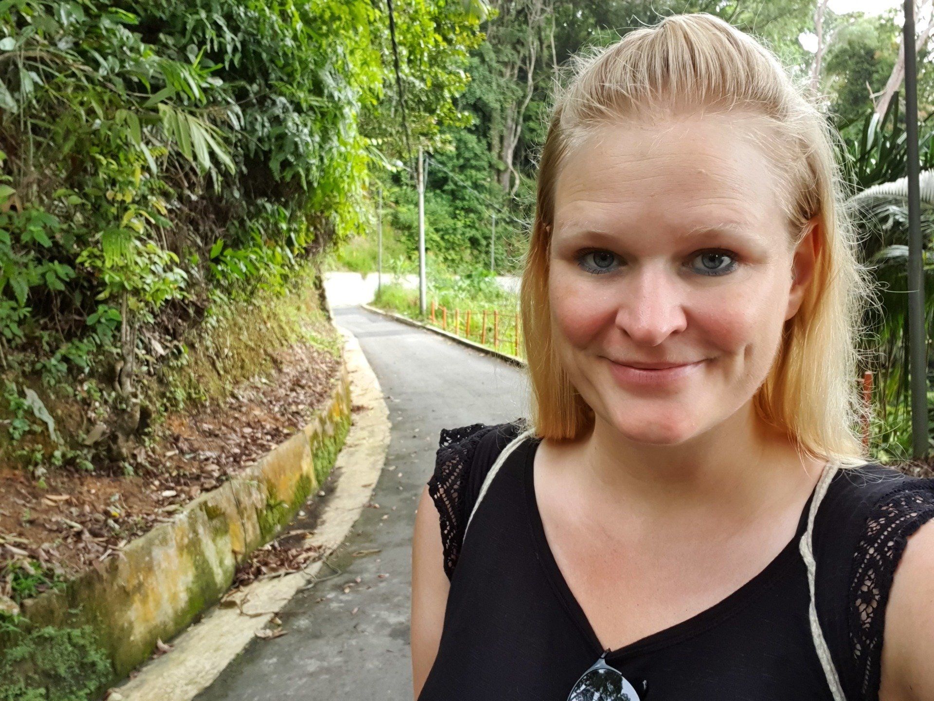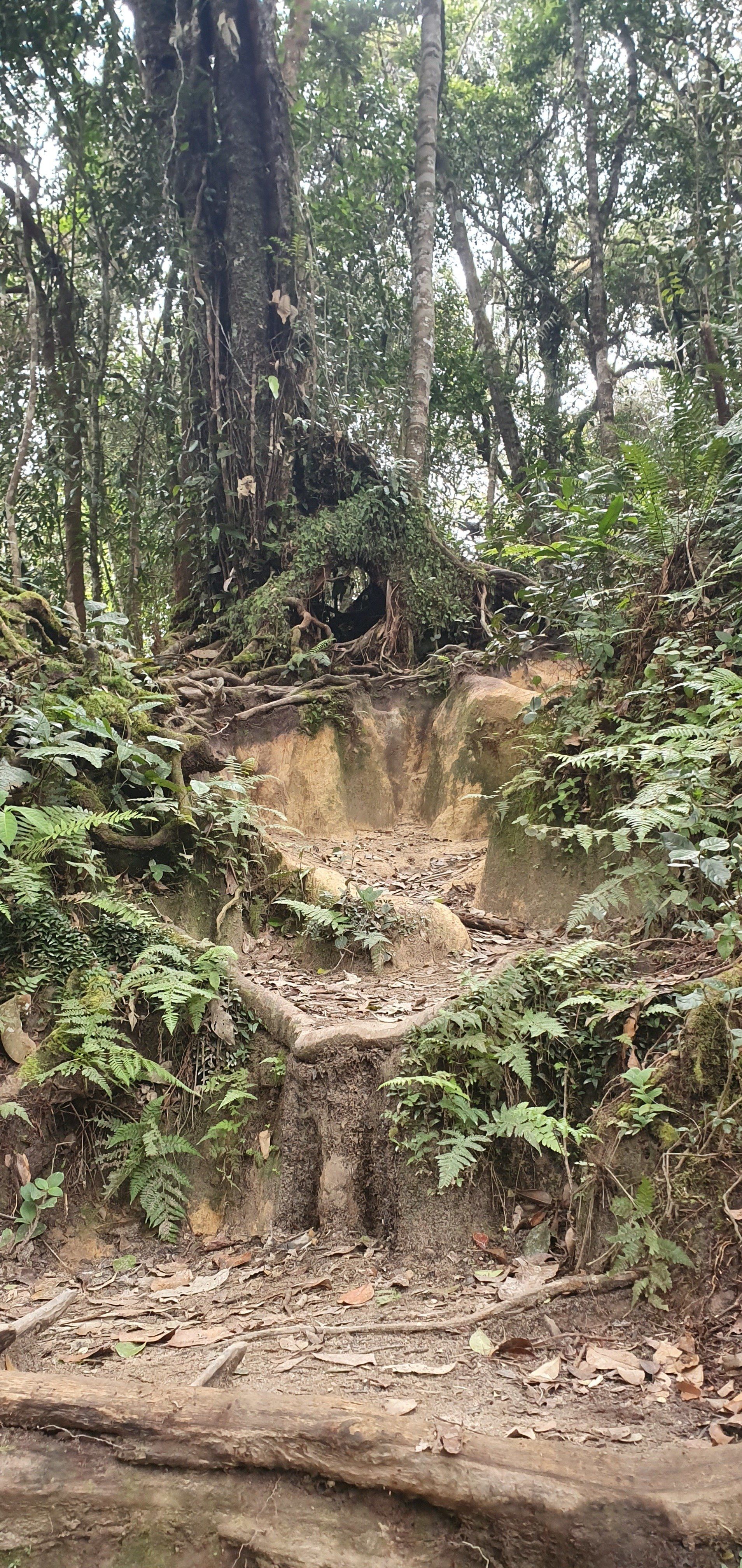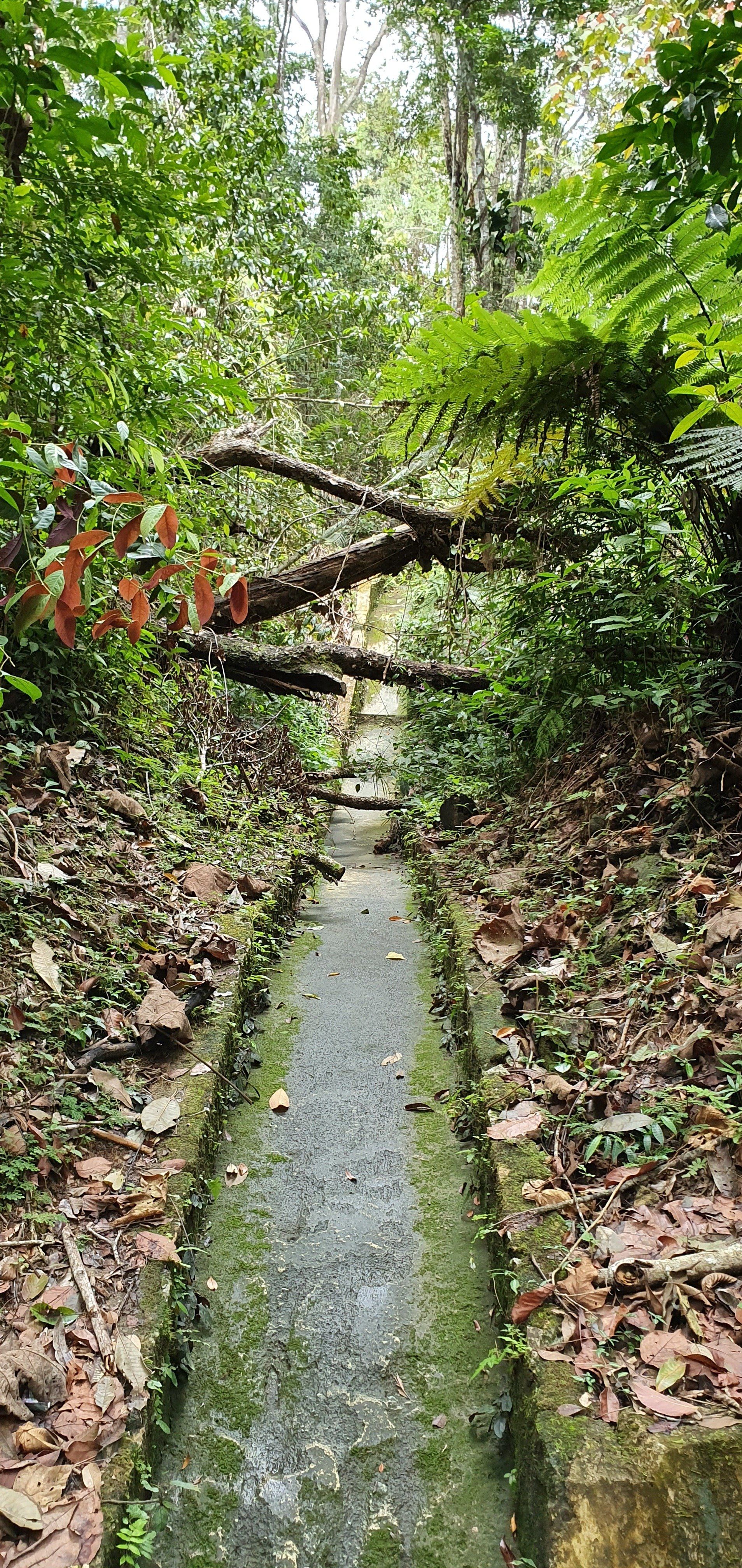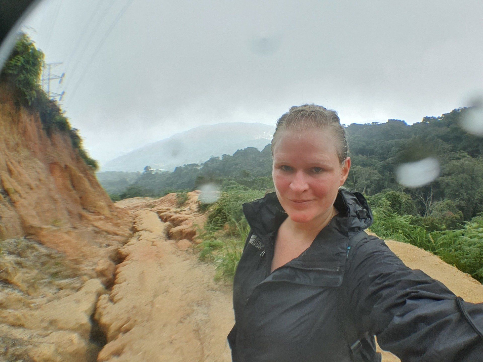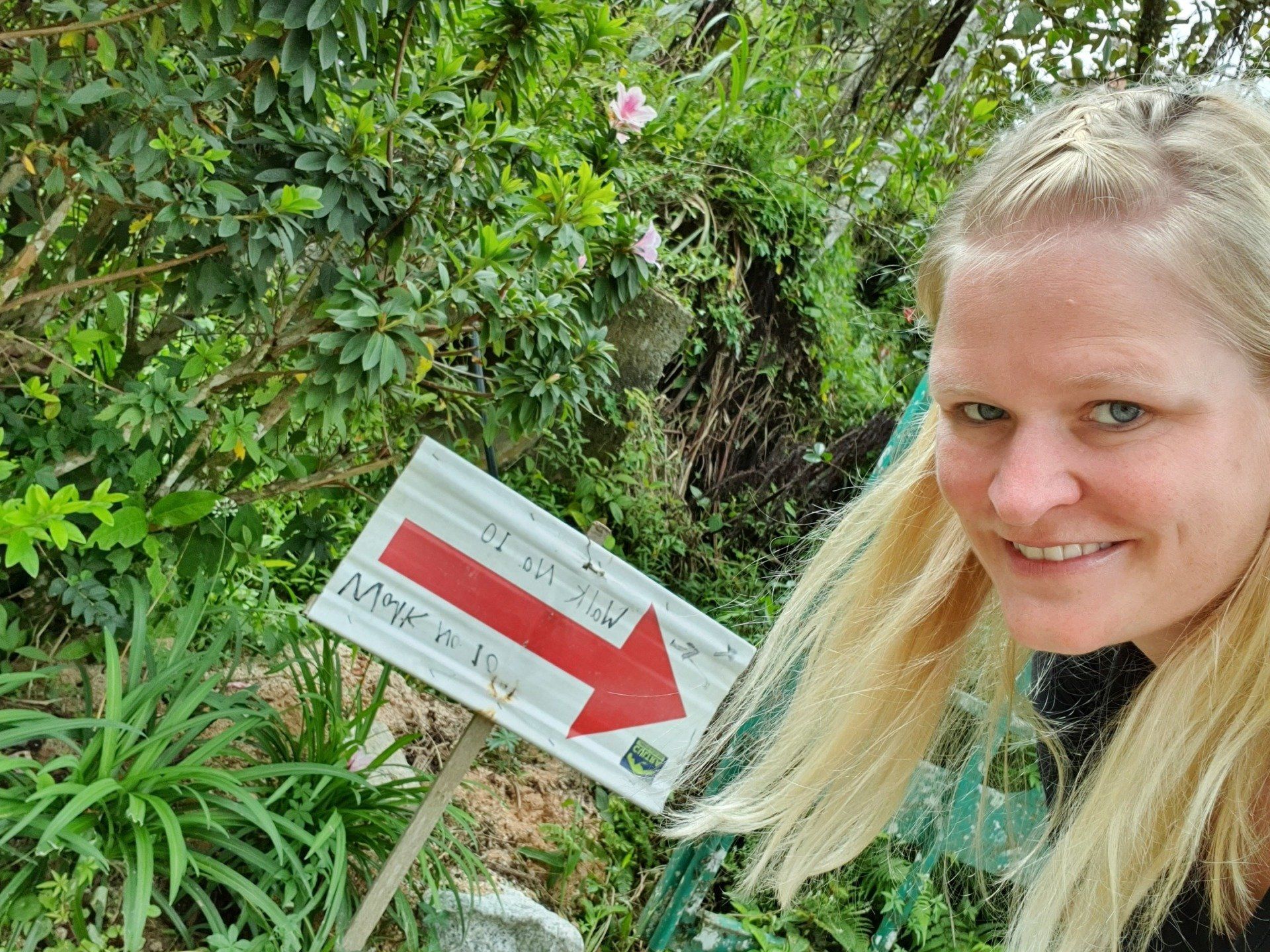 Gegen Mittag mache ich mich dann gut ausgerüstet auf und treffe im Hostel noch ein nettes deutsches Paar, die per Anhalter umherreisen und wir verquatschen uns noch eine Weile. Dann geht es für mich erst relativ spät los. Ausgesucht habe ich mir den Pfad 10 für "hin", und Pfad 6 für "zurück". Man soll nur aufpassen, dass man sich an ein paar Stellen nicht verirrt, aber mit Maps.Me an Bord fühle ich mich relativ sicher. Der Weg aus der Stadt zum Pfad ist recht easy, man muss nur genau hingucken, wo man abbiegt, um auf den Pfad zu gelangen. Denn es gibt nur ein winziges, schon recht verwittertes Schild und der erste Teil ist auch eine Art Baugrube. Aber ich bin richtig und freue mich auf eine schöne Wanderung, die ja nicht so schwer sein soll. Relativ schnell schwirrt schon ein überdimensional großes Insekt, Wespenartig, an meinem Kopf vorbei und ich denke: Welcome to the jungle. Die erste Strecke ist auch ganz nett zu laufen und das Wetter hält auch gut. Die Sonne ist kaum da und das ist von den Temperaturen recht angenehm. Nach und nach wird es immer steiler und steiler, und wer mich kennt, der weiß, wie sehr ich das liebe. Aber ich habe nicht vor, umzudrehen, und kämpfe mich über die verschiedenen Bodenarten und Baumwurzeln durch. Je höher ich komme, desto mehr merke ich, wie meine Kopfschmerzen stärker werden. Es ist wirklich sehr anstrengend und weit und breit ist auch kein Mensch zu sehen. Irgendwann kam noch ein Paar vorbei, aber das wars dann auch. Ich denke mir zwischendurch, dass diese Wanderung so alleine im Dschungel vielleicht doch nicht so die allerbeste Idee war, falls was passiert. Und bei den Wegbeschaffungen und den Tieren, die die leben, ist das nicht mal so abwegig. Man muss ja nur mal umknicken. Aber gut, hilft ja nix und es geht weiter. Und ich denke, ich habe ja auch einfach Glück, dass es nicht regnet. Und irgendwann erreiche ich dann auch den Gipfel und freue mich sehr darüber. Ein paar Meter noch weiter hoch und ein Schild zeigt die Spitze an. Die Aussicht ist auch wirklich sehr nett und ich überlege, ob ich den Rest von diesem Pfad, der quasi noch einen Umweg über ein Elektrizitätswerk macht und dann wieder zurück führt, noch mache. Aber ich merke, dass ich nicht ganz fit bin und noch einen weiten Heimweg vor mir habe, und außerdem ist mir etwas schwindelig und die Kopfschmerzen werden schlimmer und schlimmer. Also beschließe ich, den Rückweg über Pfad 6 anzutreten, der ganz nett sein soll. Lediglich mit dem Hinweis, dass man den Einstieg vielleicht nicht gut finden kann. Herausforderung angenommen, denke ich. Leider zieht es von jetzt auf gleich zu und es beginnt zu regnen, als ich da oben stehe und keinen "schützenden" Wald mehr über mir habe. Aber es ist auch irgendwie gut, denn so ziehe ich meine Regenjacke an. Die ich dann auch brauche, wie sich rausstellen soll.
