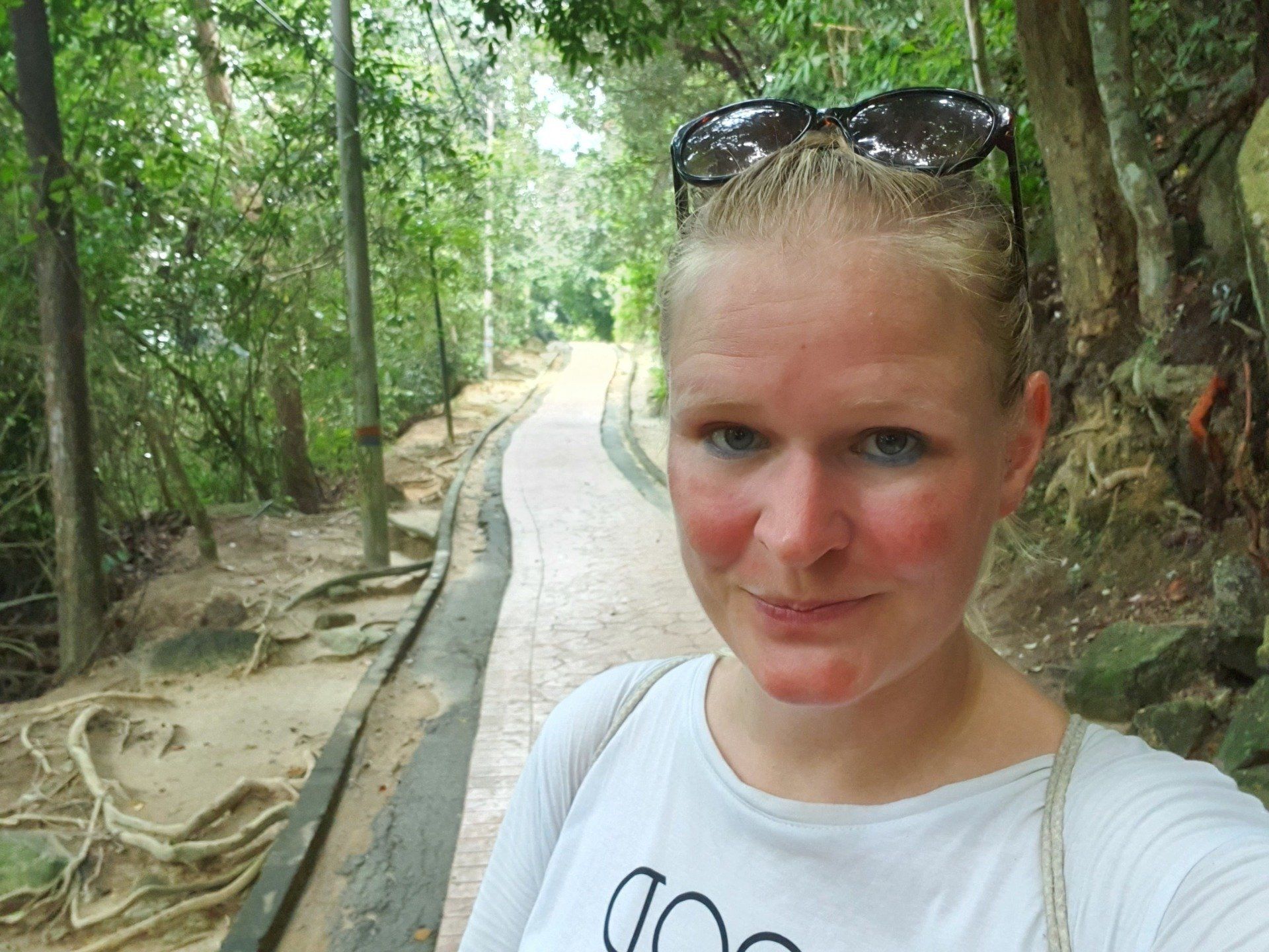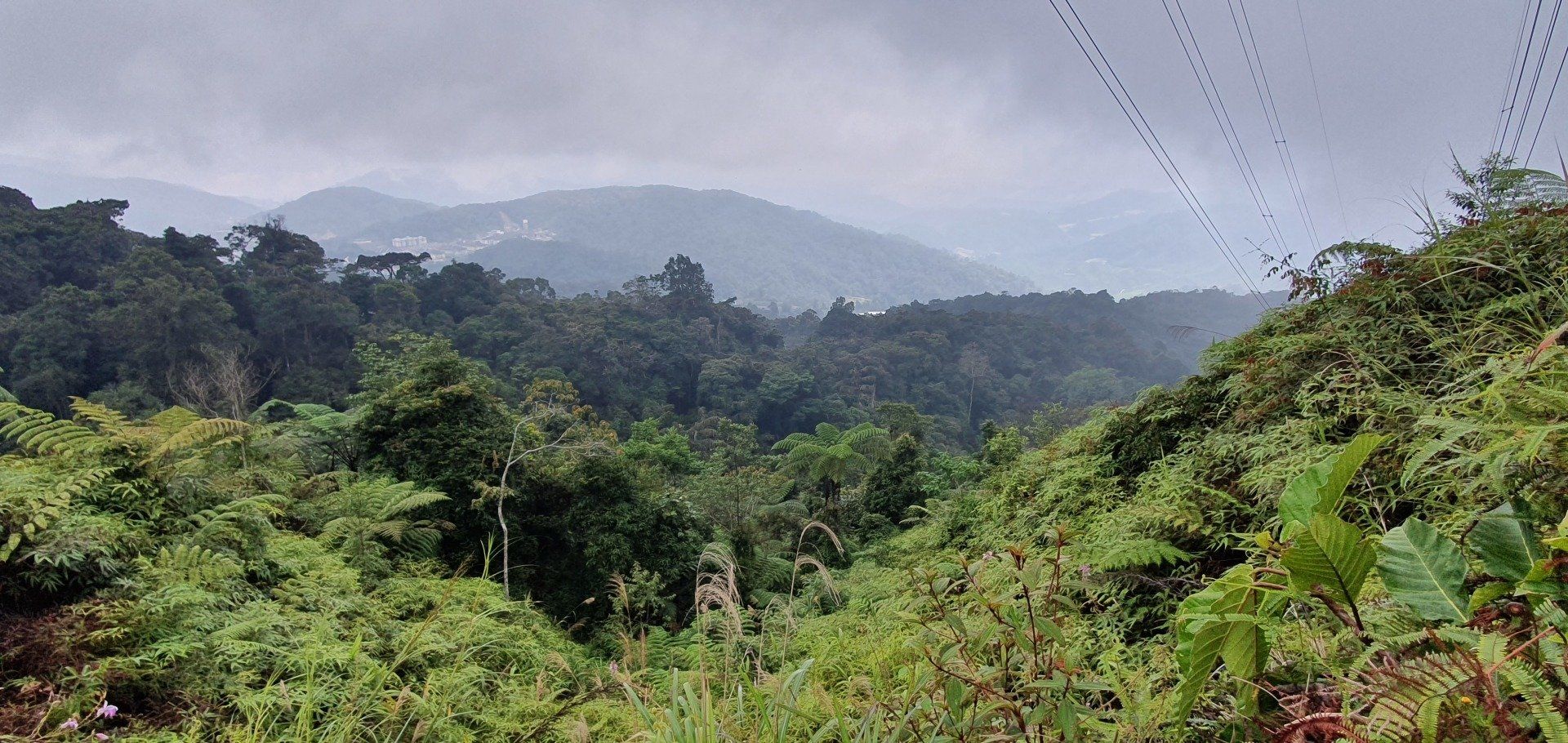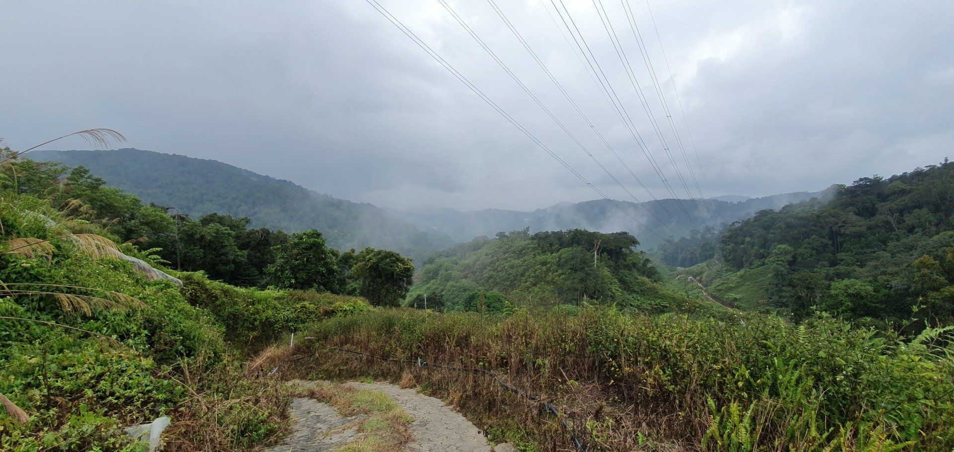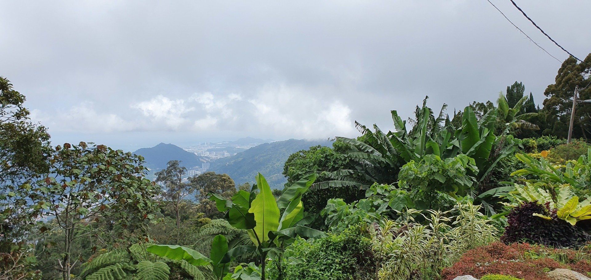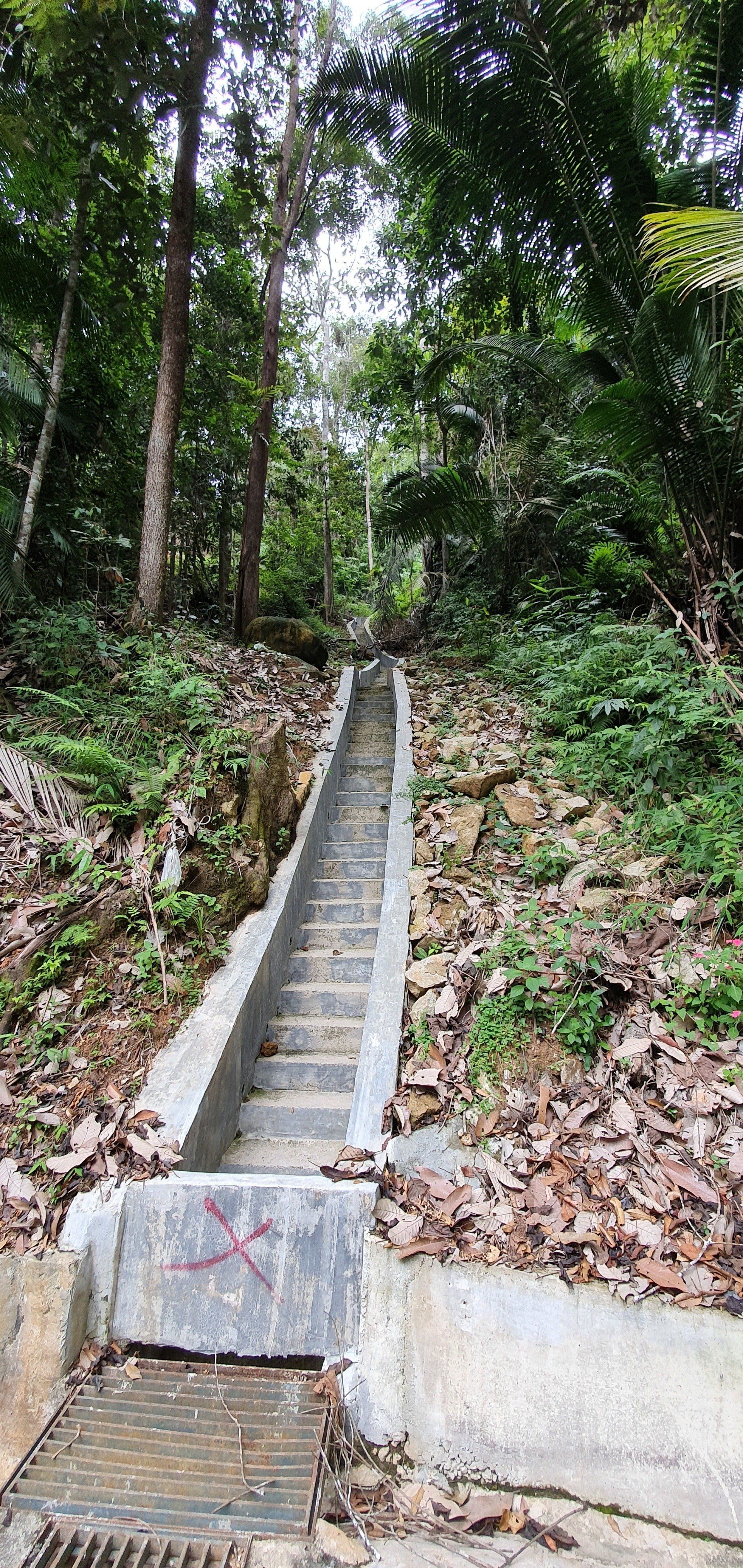 Gegen Mittag mache ich mich dann gut ausgerüstet auf und treffe im Hostel noch ein nettes deutsches Paar, die per Anhalter umherreisen und wir verquatschen uns noch eine Weile. Dann geht es für mich erst relativ spät los. Ausgesucht habe ich mir den Pfad 10 für "hin", und Pfad 6 für "zurück". Man soll nur aufpassen, dass man sich an ein paar Stellen nicht verirrt, aber mit Maps.Me an Bord fühle ich mich relativ sicher. Der Weg aus der Stadt zum Pfad ist recht easy, man muss nur genau hingucken, wo man abbiegt, um auf den Pfad zu gelangen. Denn es gibt nur ein winziges, schon recht verwittertes Schild und der erste Teil ist auch eine Art Baugrube. Aber ich bin richtig und freue mich auf eine schöne Wanderung, die ja nicht so schwer sein soll. Relativ schnell schwirrt schon ein überdimensional großes Insekt, Wespenartig, an meinem Kopf vorbei und ich denke: Welcome to the jungle. Die erste Strecke ist auch ganz nett zu laufen und das Wetter hält auch gut. Die Sonne ist kaum da und das ist von den Temperaturen recht angenehm. Nach und nach wird es immer steiler und steiler, und wer mich kennt, der weiß, wie sehr ich das liebe. Aber ich habe nicht vor, umzudrehen, und kämpfe mich über die verschiedenen Bodenarten und Baumwurzeln durch. Je höher ich komme, desto mehr merke ich, wie meine Kopfschmerzen stärker werden. Es ist wirklich sehr anstrengend und weit und breit ist auch kein Mensch zu sehen. Irgendwann kam noch ein Paar vorbei, aber das wars dann auch. Ich denke mir zwischendurch, dass diese Wanderung so alleine im Dschungel vielleicht doch nicht so die allerbeste Idee war, falls was passiert. Und bei den Wegbeschaffungen und den Tieren, die die leben, ist das nicht mal so abwegig. Man muss ja nur mal umknicken. Aber gut, hilft ja nix und es geht weiter. Und ich denke, ich habe ja auch einfach Glück, dass es nicht regnet. Und irgendwann erreiche ich dann auch den Gipfel und freue mich sehr darüber. Ein paar Meter noch weiter hoch und ein Schild zeigt die Spitze an. Die Aussicht ist auch wirklich sehr nett und ich überlege, ob ich den Rest von diesem Pfad, der quasi noch einen Umweg über ein Elektrizitätswerk macht und dann wieder zurück führt, noch mache. Aber ich merke, dass ich nicht ganz fit bin und noch einen weiten Heimweg vor mir habe, und außerdem ist mir etwas schwindelig und die Kopfschmerzen werden schlimmer und schlimmer. Also beschließe ich, den Rückweg über Pfad 6 anzutreten, der ganz nett sein soll. Lediglich mit dem Hinweis, dass man den Einstieg vielleicht nicht gut finden kann. Herausforderung angenommen, denke ich. Leider zieht es von jetzt auf gleich zu und es beginnt zu regnen, als ich da oben stehe und keinen "schützenden" Wald mehr über mir habe. Aber es ist auch irgendwie gut, denn so ziehe ich meine Regenjacke an. Die ich dann auch brauche, wie sich rausstellen soll.