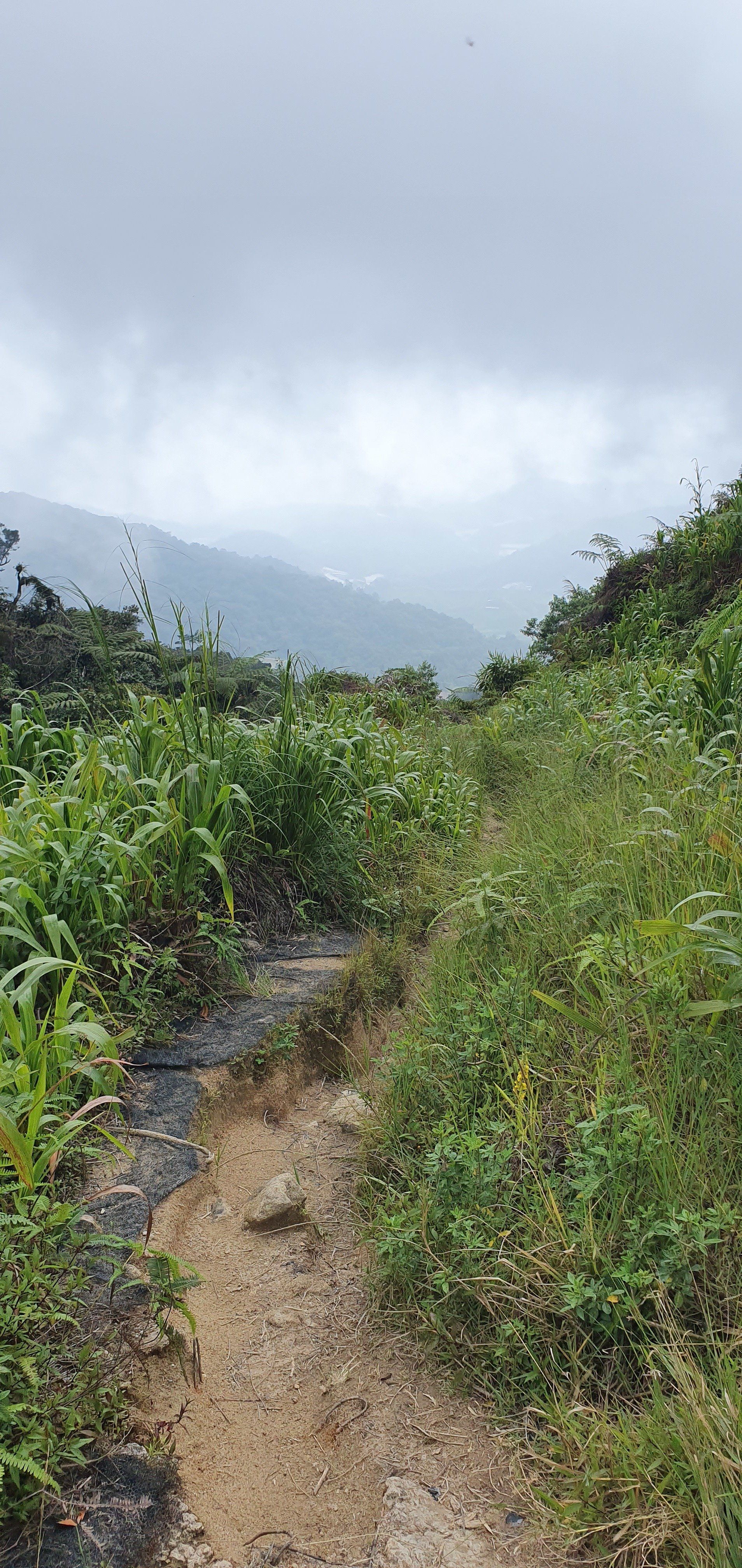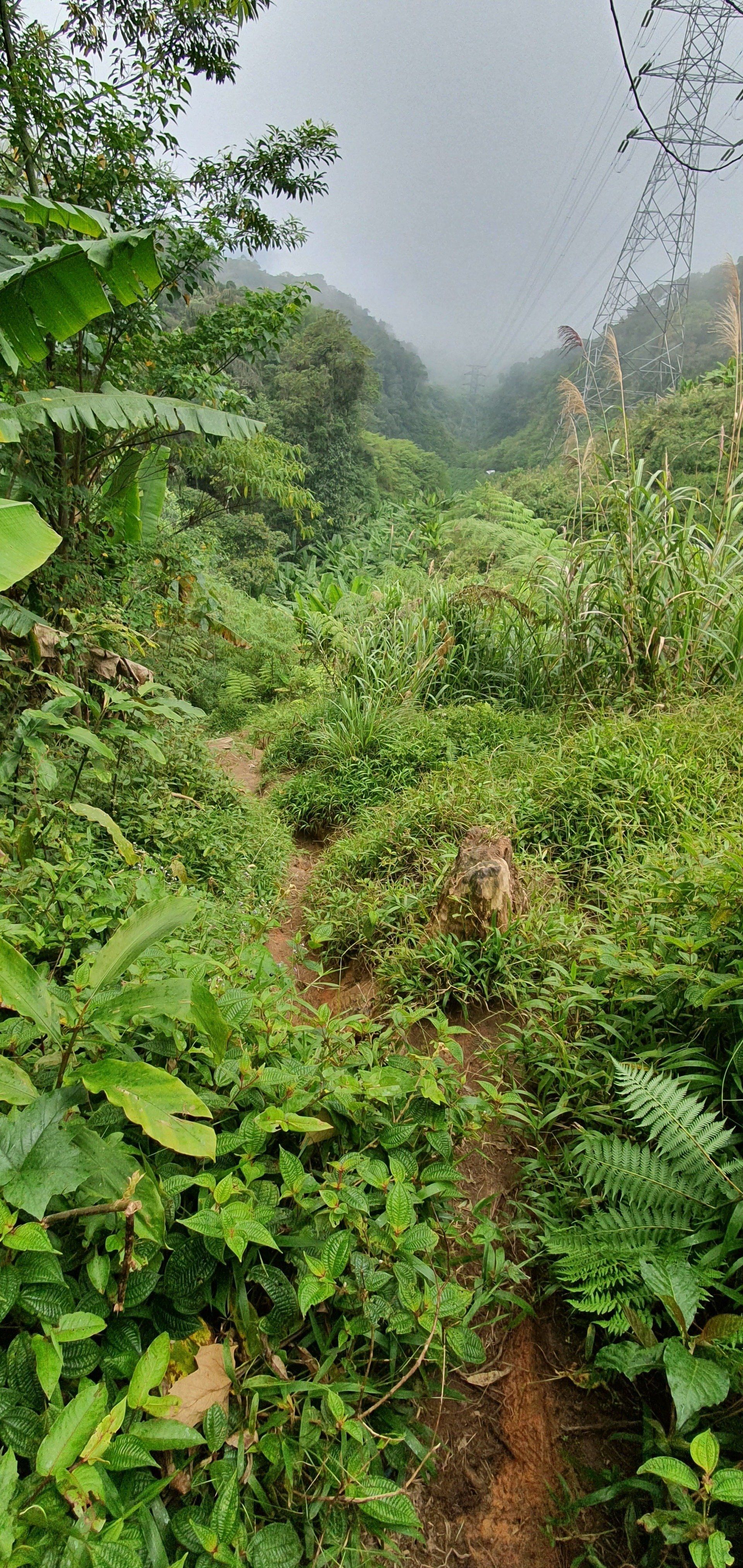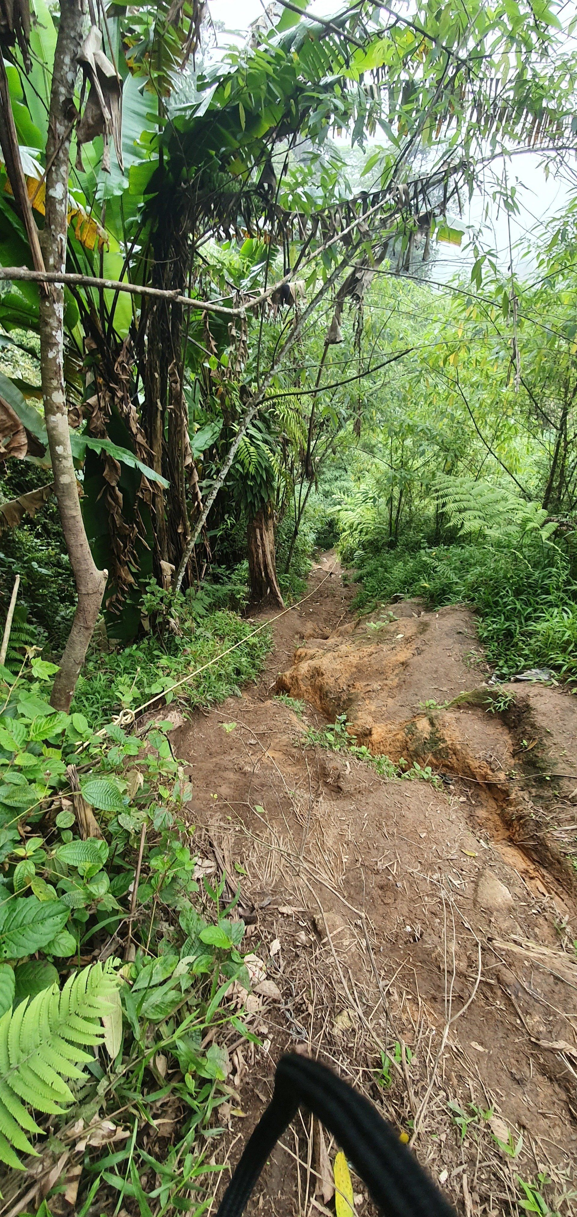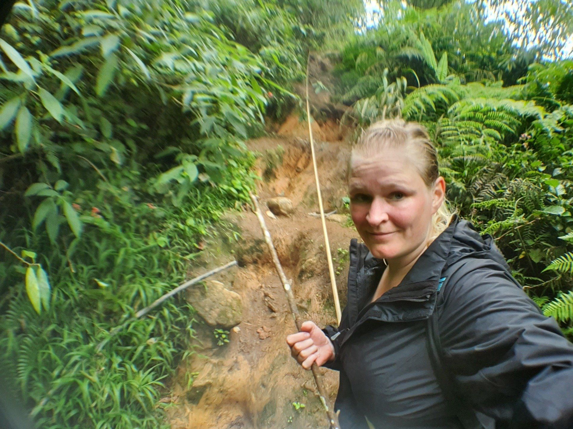 Es gibt noch eine kleine "Brücke", die daraufhin deutet, dass dies der Weg sein könnte (bestehend aus einem Bambusrohr und einem Seil). Die Jungs meinen jedoch, dass das kein Weg sein kann, weil das Gras und Co höher wäre, als man selbst. Aber alles deutet darauf hin, und da ich lange Sachen trage, schlage ich mich mal - fast wörtlich zu sehen - in die Büsche. Und da bin ich ganz froh, dass ich die Jacke anhabe, denn man weiß ja nicht so genau, was sich alles in diesem Gras so rumtreibt. Schnell gehen ist auch nicht, da man kaum was sieht und der Boden auch teilweise eine einzige Matschrutsche ist. Das kann noch heiter werden, denke ich mir. Und so wird es auch super anstrengend, den Weg runter zu schaffen, da es auch noch stärker und dauerhaft anfängt zu regnen. Aber ich muss ja weiter und freue mich über jeden Meter. An einigen Stellen hat man sogar eine Art Seil, bestehend aus einem Gummirohr, gespannt, an dem ich mich dann abseile und hoffe, dass alles stabil ist. Darauf muss ich immerhin vertrauen, weil ich da sonst nicht runter komme. Irgendwann komme ich an einer Flussquelle vorbei und kann den Weg nicht mehr ausmachen. Durch den Regen ist das eigentliche Bächlein auch schon größer und ich kann mir nicht vorstellen, dass man quasi über den Bach laufen muss. Aber so ist es. Denn nachdem ich ein Stück in die falsche Richtung gelaufen bin, sehe ich auf der Karte, dass ich falsch bin. Und dann folge ich dem Lauf und muss durchs Wasser watscheln. Aber gut, alles geht irgendwie und ich habe gute wasserfeste Schuhe. Weiter dann im Wald.