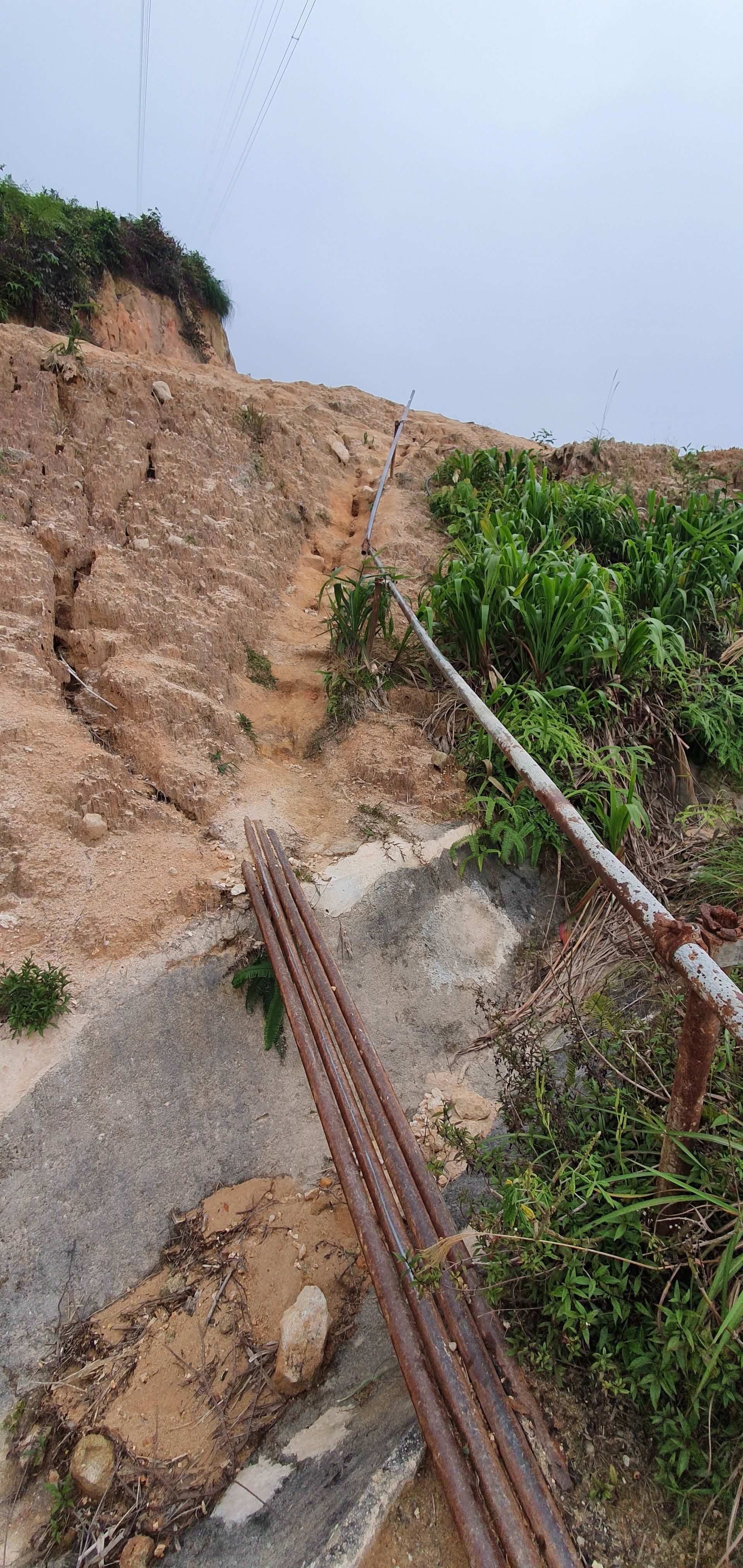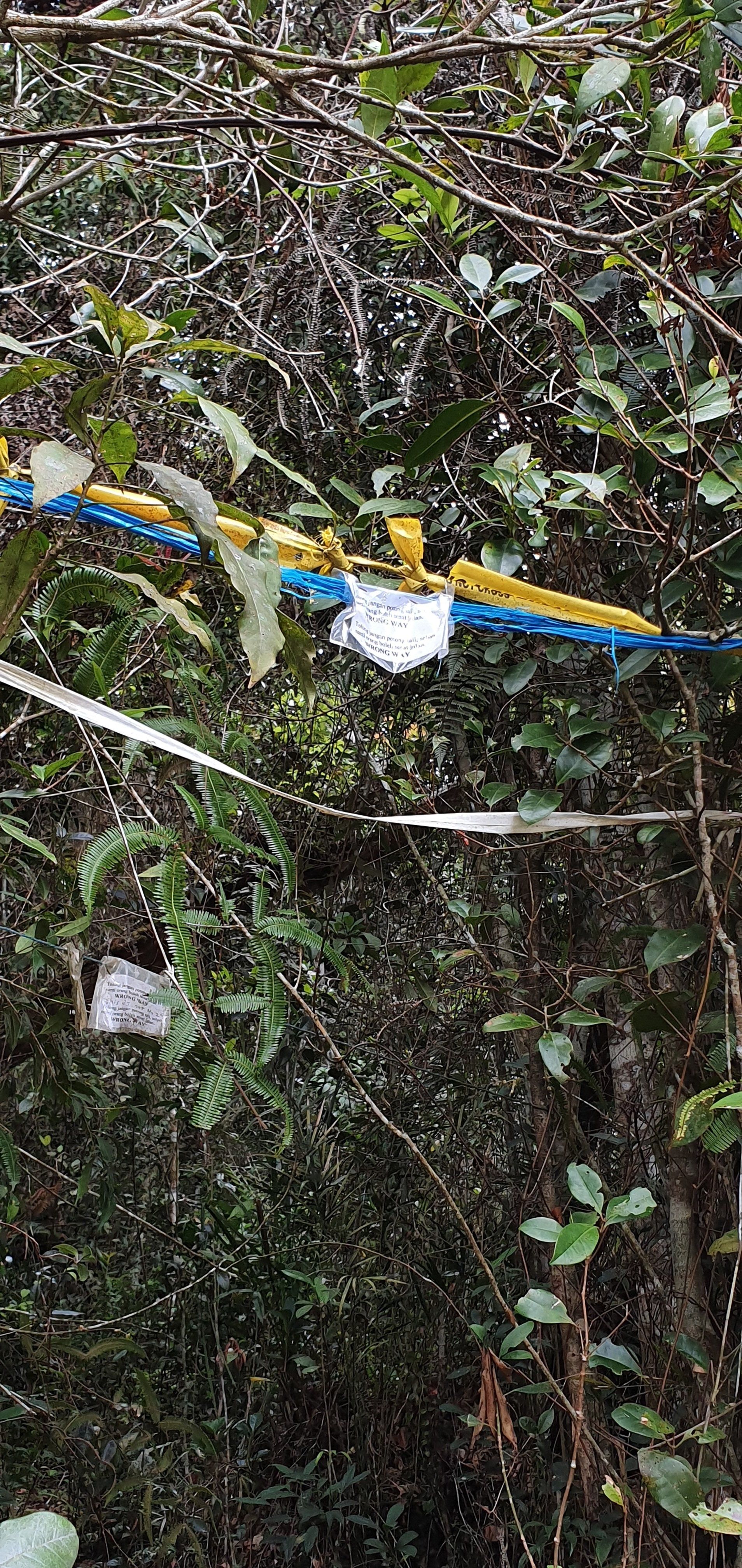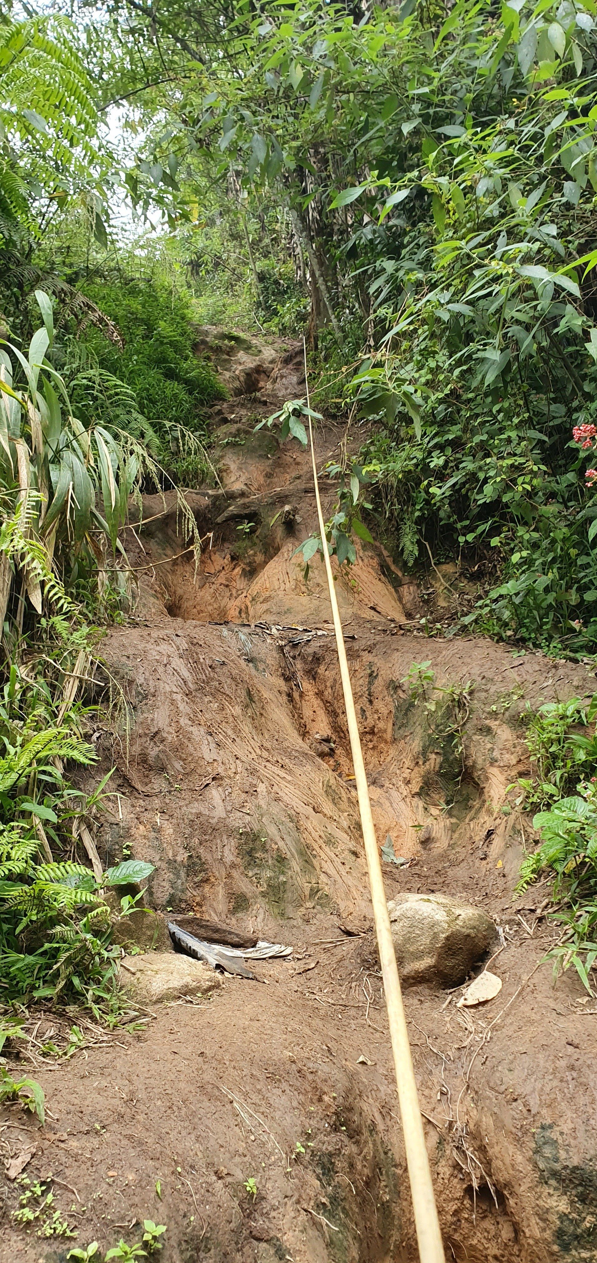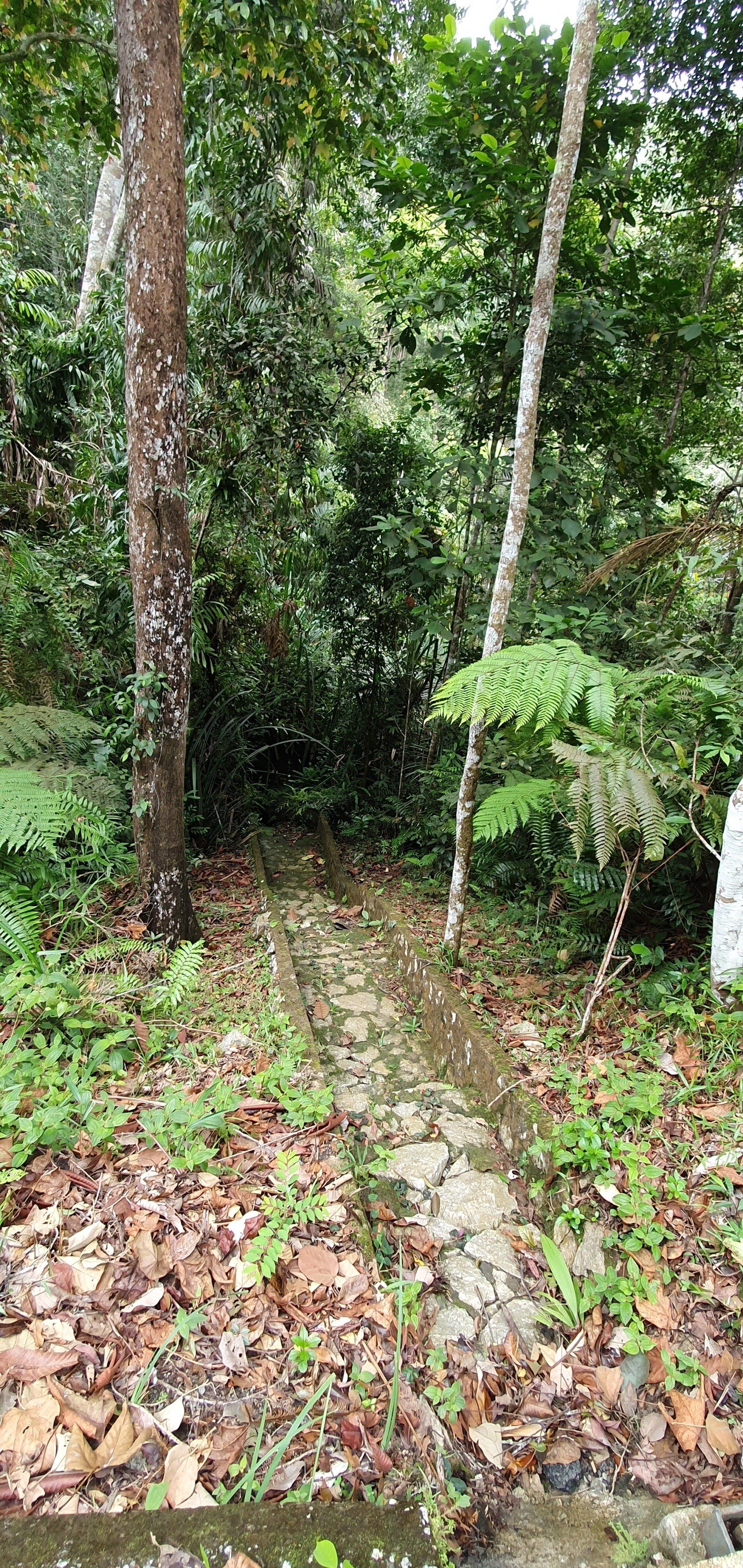 Es gibt noch eine kleine "Brücke", die daraufhin deutet, dass dies der Weg sein könnte (bestehend aus einem Bambusrohr und einem Seil). Die Jungs meinen jedoch, dass das kein Weg sein kann, weil das Gras und Co höher wäre, als man selbst. Aber alles deutet darauf hin, und da ich lange Sachen trage, schlage ich mich mal - fast wörtlich zu sehen - in die Büsche. Und da bin ich ganz froh, dass ich die Jacke anhabe, denn man weiß ja nicht so genau, was sich alles in diesem Gras so rumtreibt. Schnell gehen ist auch nicht, da man kaum was sieht und der Boden auch teilweise eine einzige Matschrutsche ist. Das kann noch heiter werden, denke ich mir. Und so wird es auch super anstrengend, den Weg runter zu schaffen, da es auch noch stärker und dauerhaft anfängt zu regnen. Aber ich muss ja weiter und freue mich über jeden Meter. An einigen Stellen hat man sogar eine Art Seil, bestehend aus einem Gummirohr, gespannt, an dem ich mich dann abseile und hoffe, dass alles stabil ist. Darauf muss ich immerhin vertrauen, weil ich da sonst nicht runter komme. Irgendwann komme ich an einer Flussquelle vorbei und kann den Weg nicht mehr ausmachen. Durch den Regen ist das eigentliche Bächlein auch schon größer und ich kann mir nicht vorstellen, dass man quasi über den Bach laufen muss. Aber so ist es. Denn nachdem ich ein Stück in die falsche Richtung gelaufen bin, sehe ich auf der Karte, dass ich falsch bin. Und dann folge ich dem Lauf und muss durchs Wasser watscheln. Aber gut, alles geht irgendwie und ich habe gute wasserfeste Schuhe. Weiter dann im Wald.