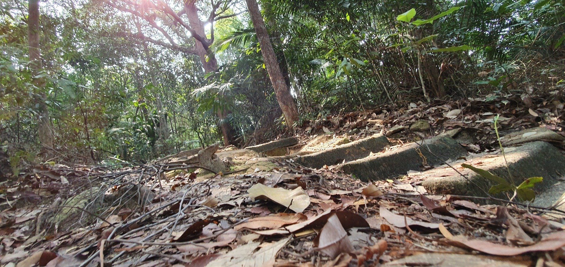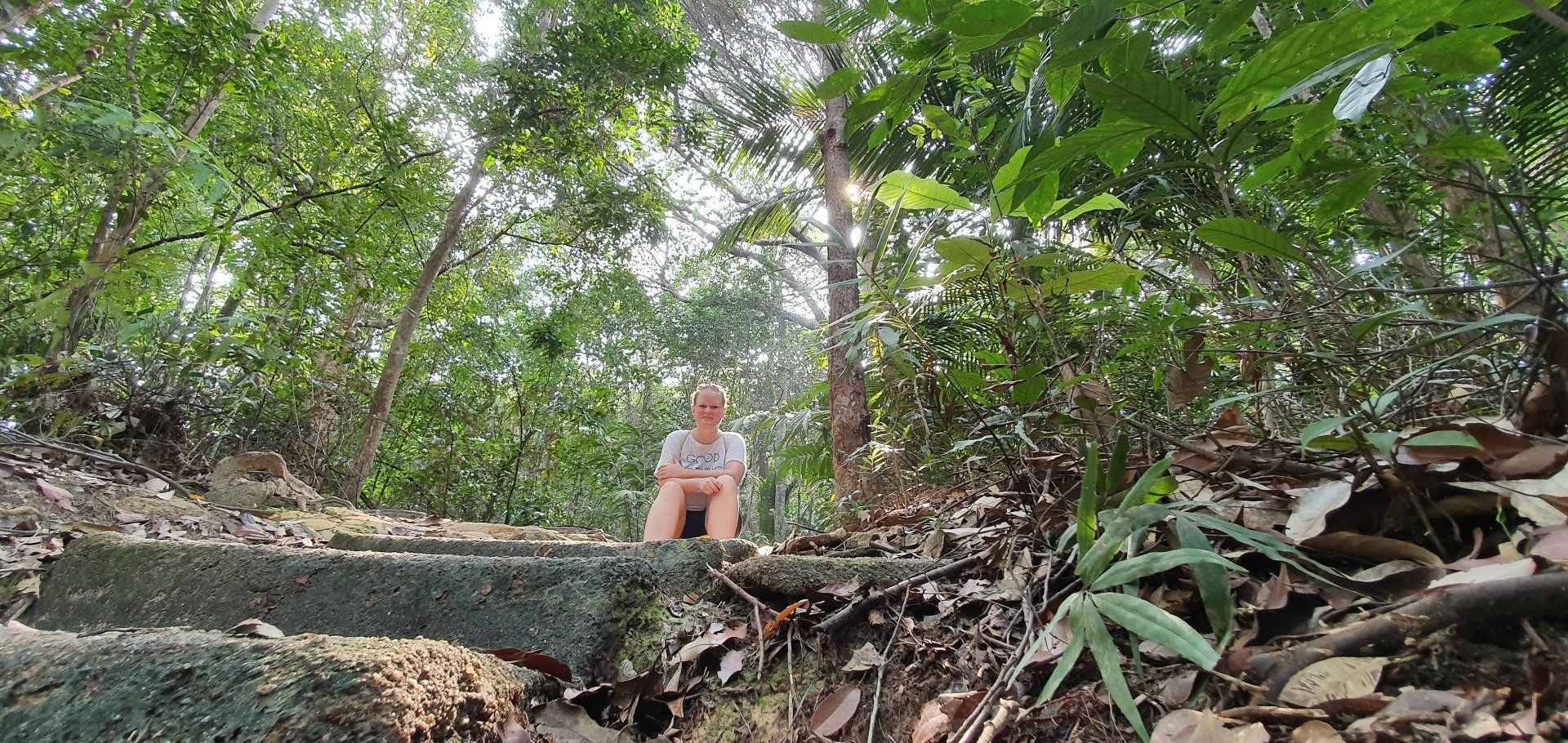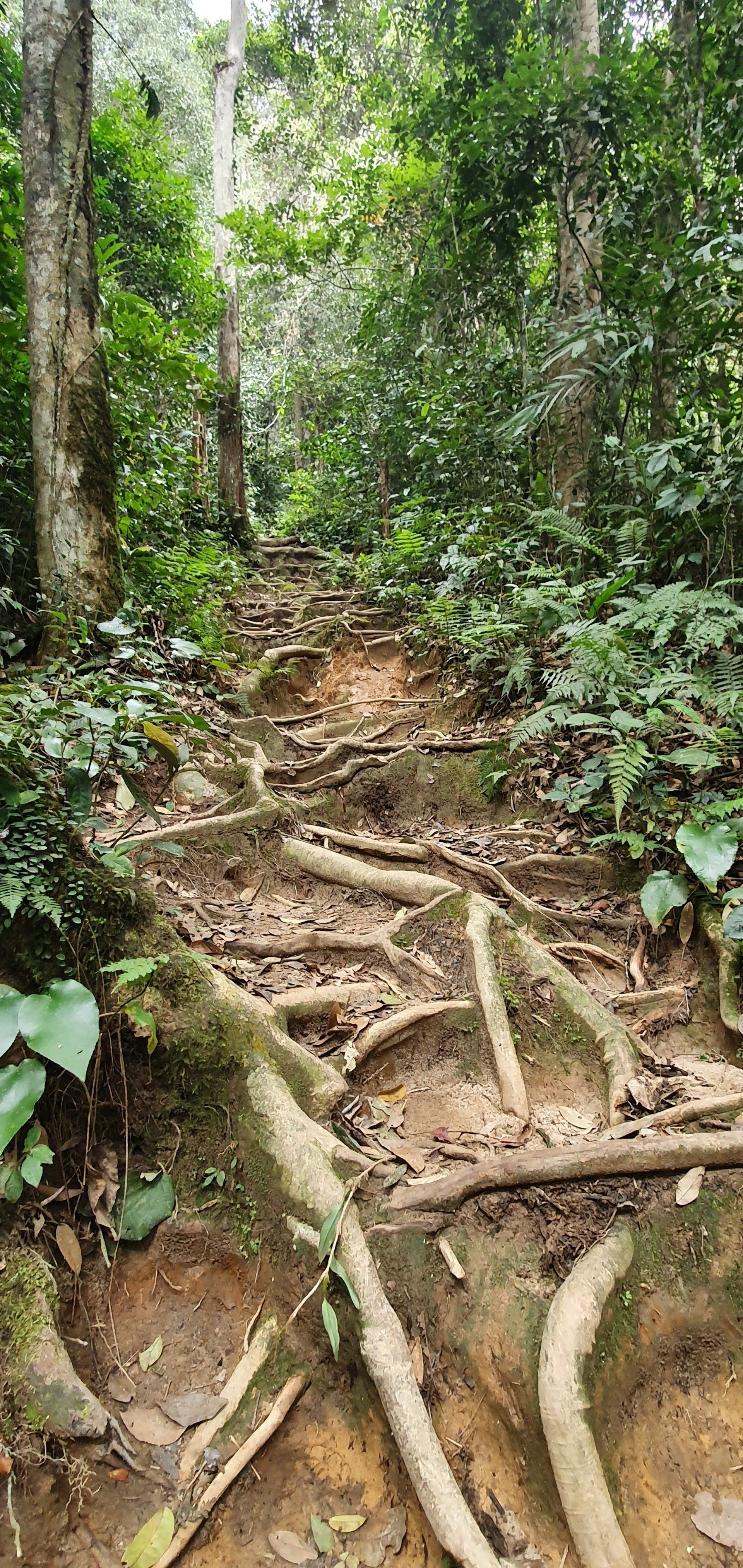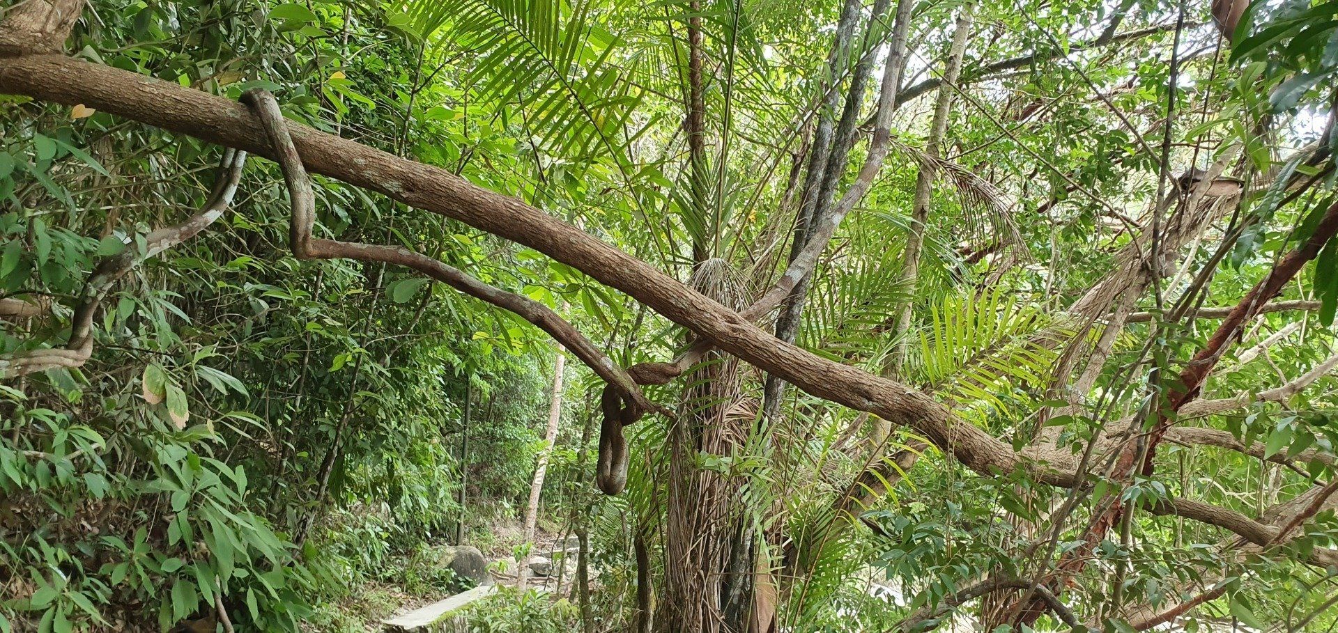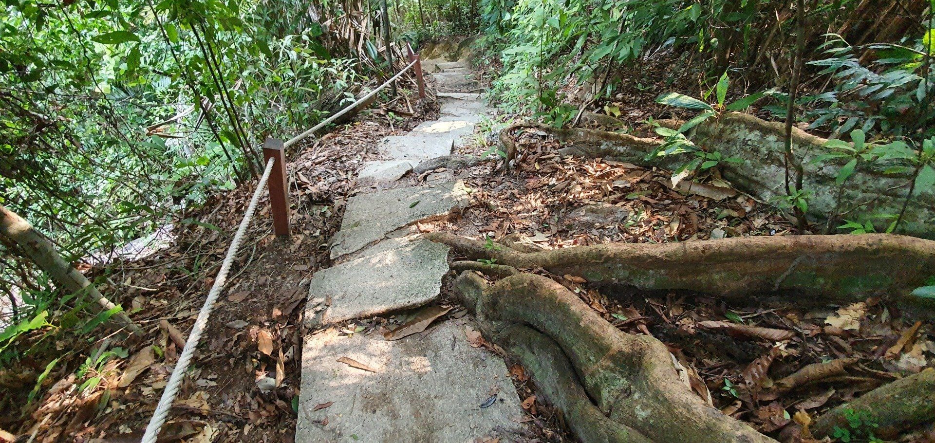 Dann mache ich mich auf den Rückweg, was recht angenehm ist, da es wirklich ein sehr gut zu erkennender Weg ist. Auch wurden bei kniffligeren Stellen Stufen eingebaut, und Seile zum Klettern oder Absichern befestigt. Die Stufen sind jedoch auch schon größtenteils Opfer der Natur geworden. Aber insgesamt ist es wirklich sehr schön zu wandern und vielleicht ist es ja auch deshalb nicht ganz so überlaufen. Auf diesem Weg begegnen mir zwar immer mal wieder Leute, aber es ist wirklich überschaubar. Insgesamt habe ich dadurch auch viele Tiere beobachten können, die sich an mir alleine wohl nicht gestört haben, inklusive der Affen, die auch mitten im Dschungel rumhüpfen. Glücklicherweise sind mir (sichtbar) keine Spinnen oder Schlangen begegnet, auch wenn ich bei manchen Ästen den Eindruck hatte, sie sehen einer Schlange doch verdächtig ähnlich...