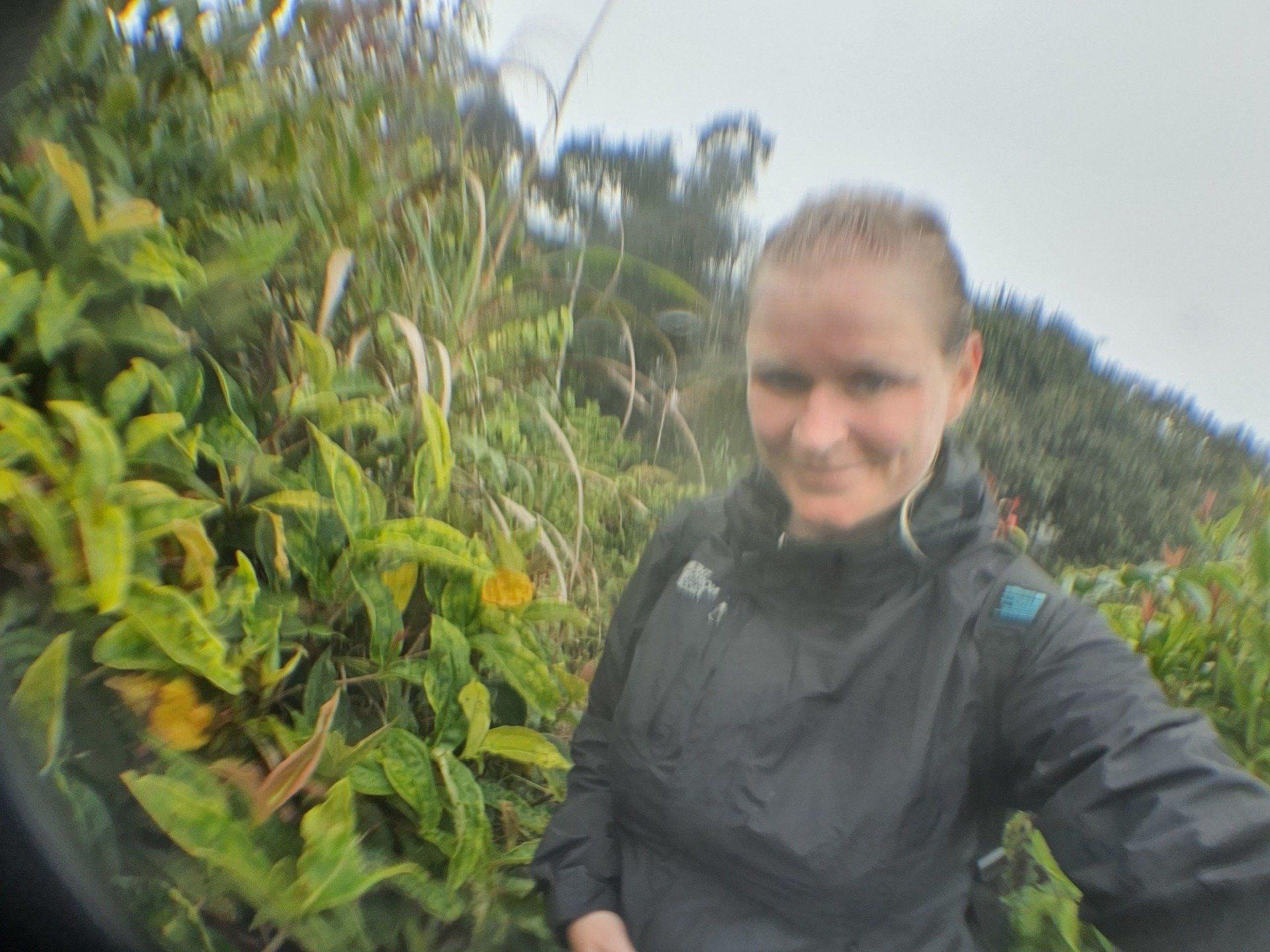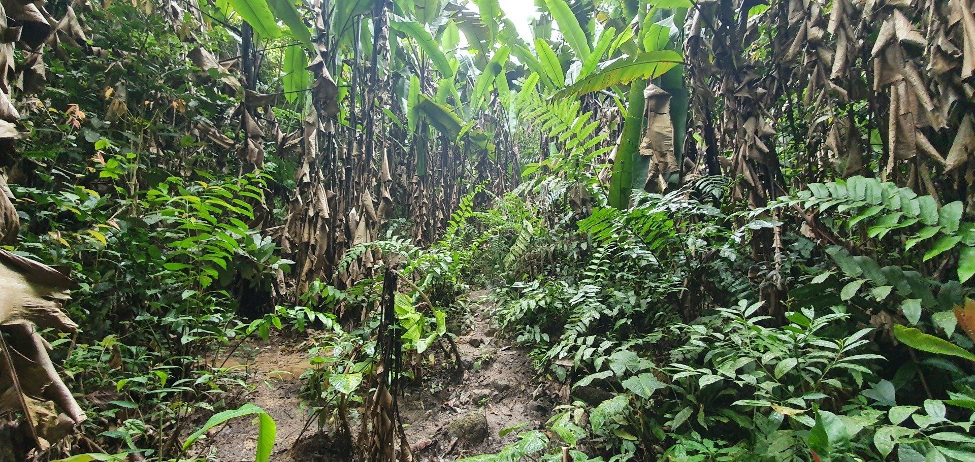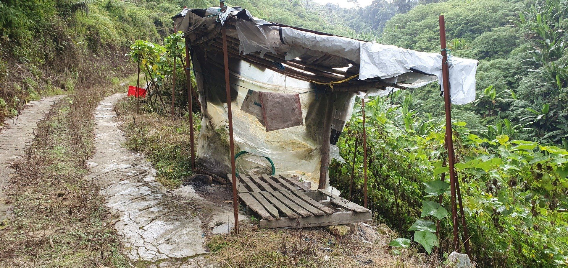 Nach ein paar Kilometern erreiche ich dann auch endlich eine Art Weg, mit Plantagen (was genau, kann ich leider nicht so ganz erkennen, jedenfalls nicht die Teeplantagen, die ja so schön sein sollen). Und dann wird der Regen stärker und stärker und mein Kopfschmerz ebenfalls, und dann muss ich mich erst mal geschlagen geben und suche in einer kleinen "Hütte", bestehend aus Paletten und einer übergespannten Plane, Schutz. Aber es hört nicht auf und so muss ich dann auch bald weiter, um nicht im Dunkeln irgendwann zu laufen, weil ich echt lange brauche.