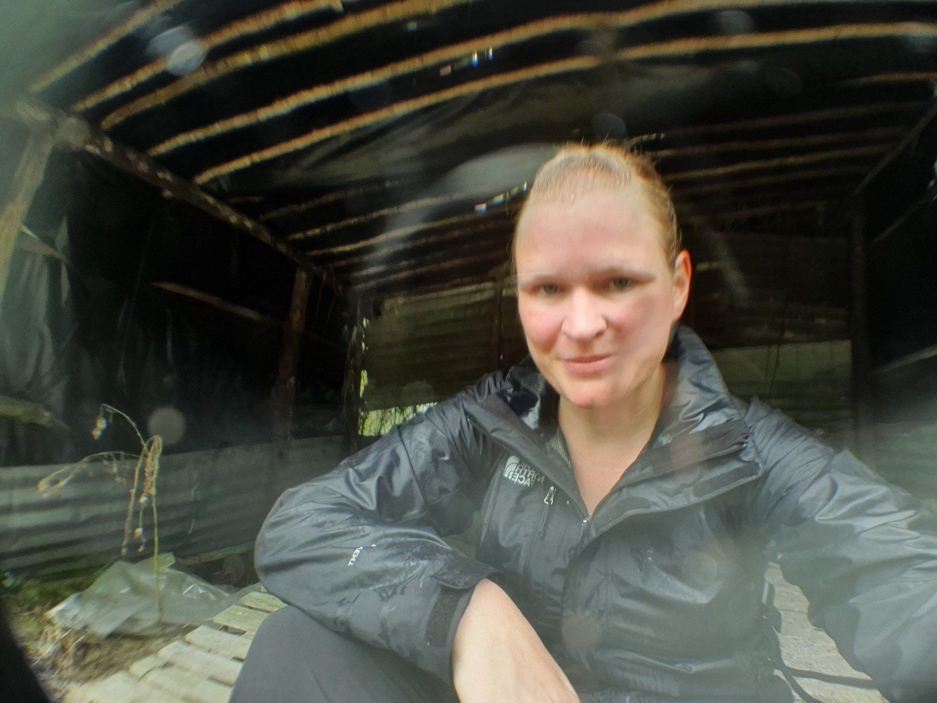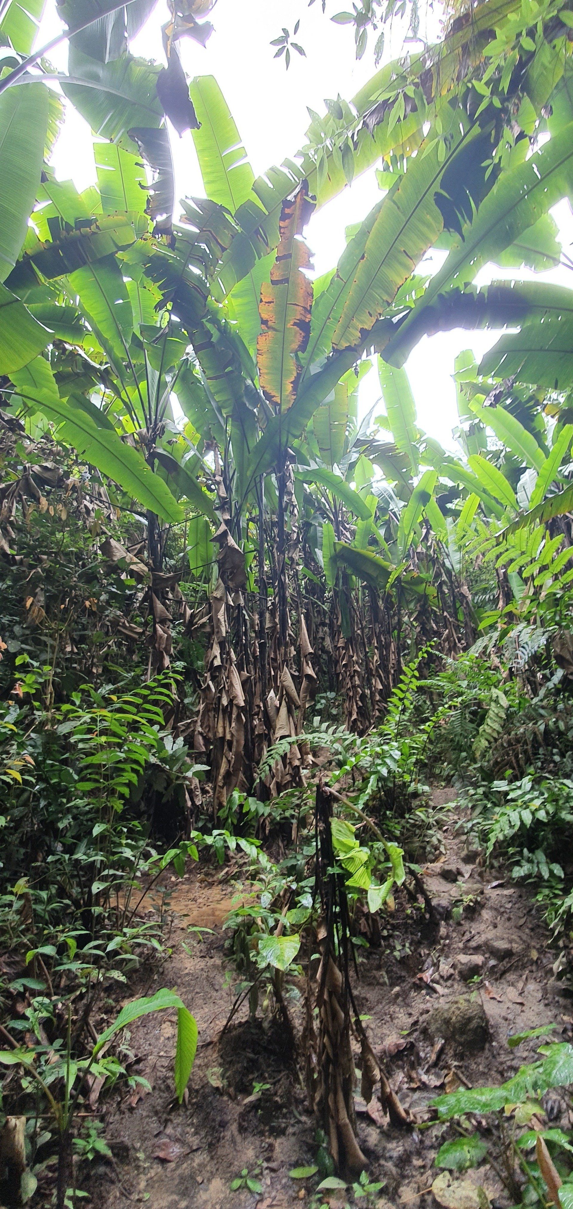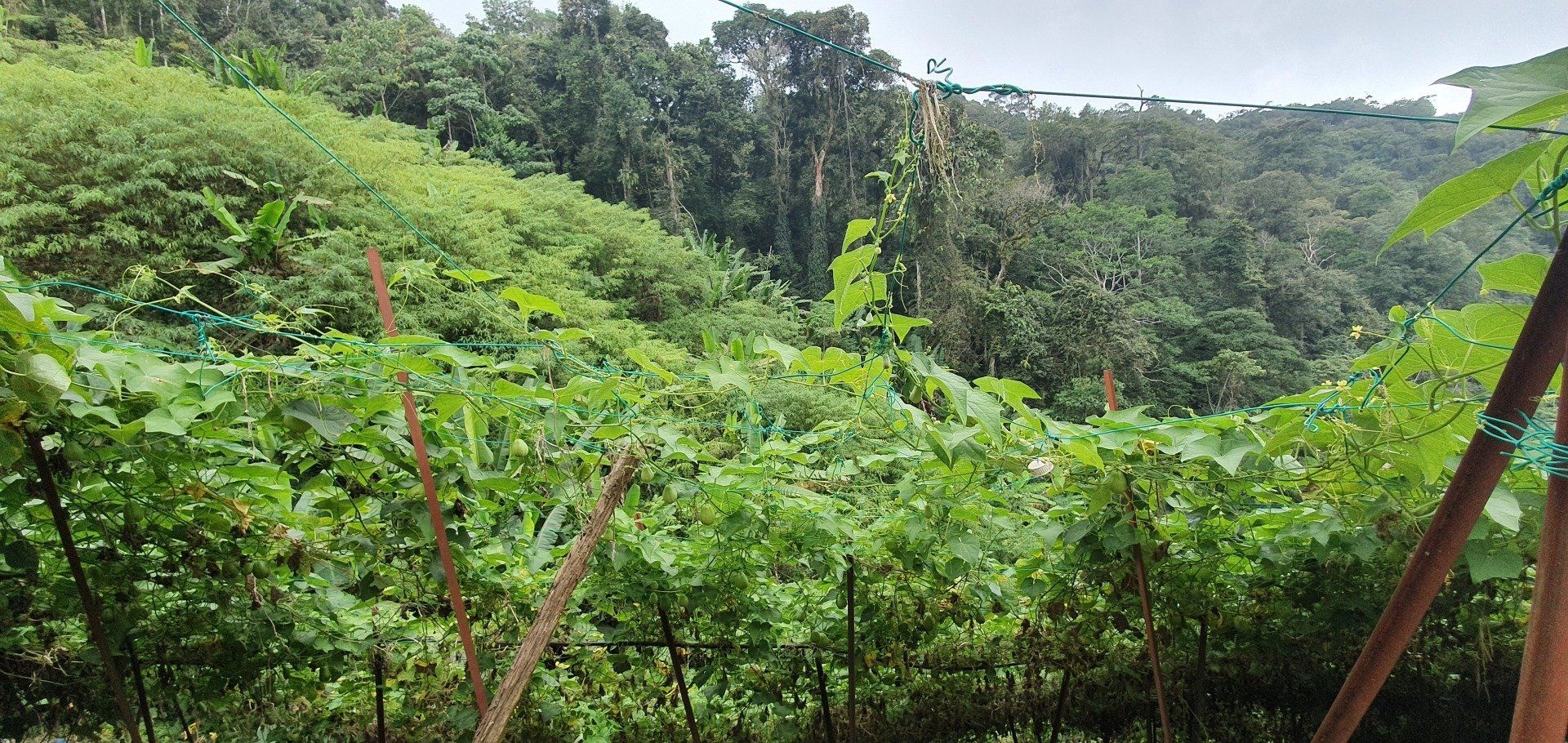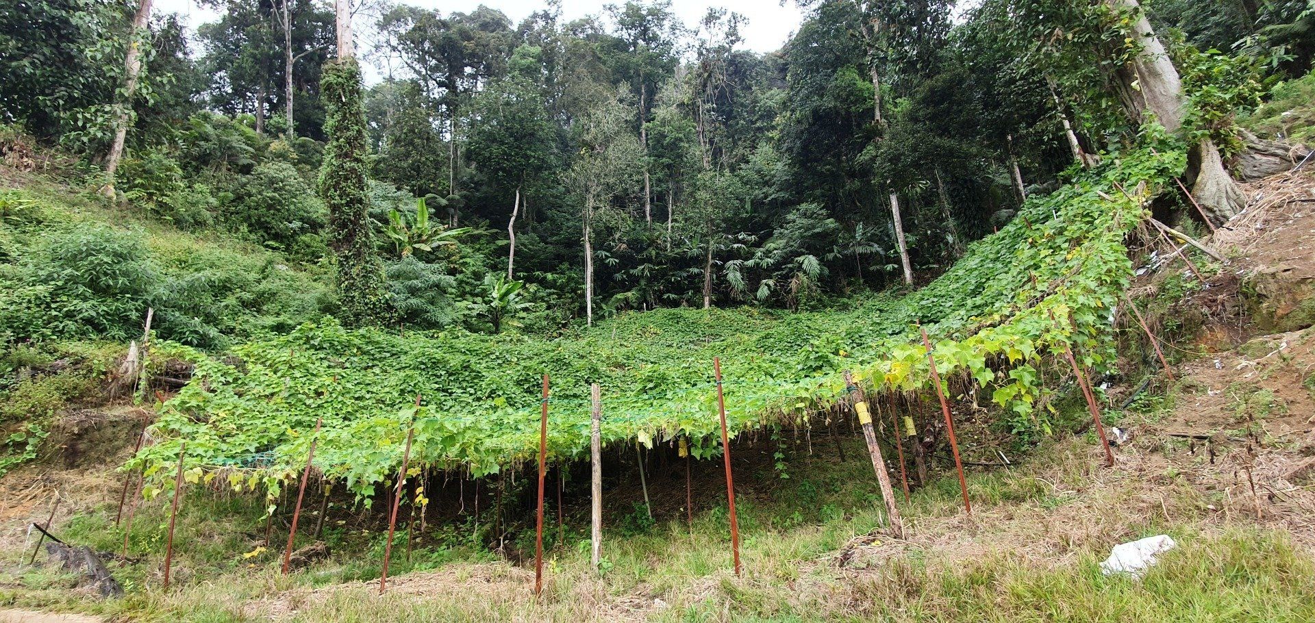 Nach ein paar Kilometern erreiche ich dann auch endlich eine Art Weg, mit Plantagen (was genau, kann ich leider nicht so ganz erkennen, jedenfalls nicht die Teeplantagen, die ja so schön sein sollen). Und dann wird der Regen stärker und stärker und mein Kopfschmerz ebenfalls, und dann muss ich mich erst mal geschlagen geben und suche in einer kleinen "Hütte", bestehend aus Paletten und einer übergespannten Plane, Schutz. Aber es hört nicht auf und so muss ich dann auch bald weiter, um nicht im Dunkeln irgendwann zu laufen, weil ich echt lange brauche.