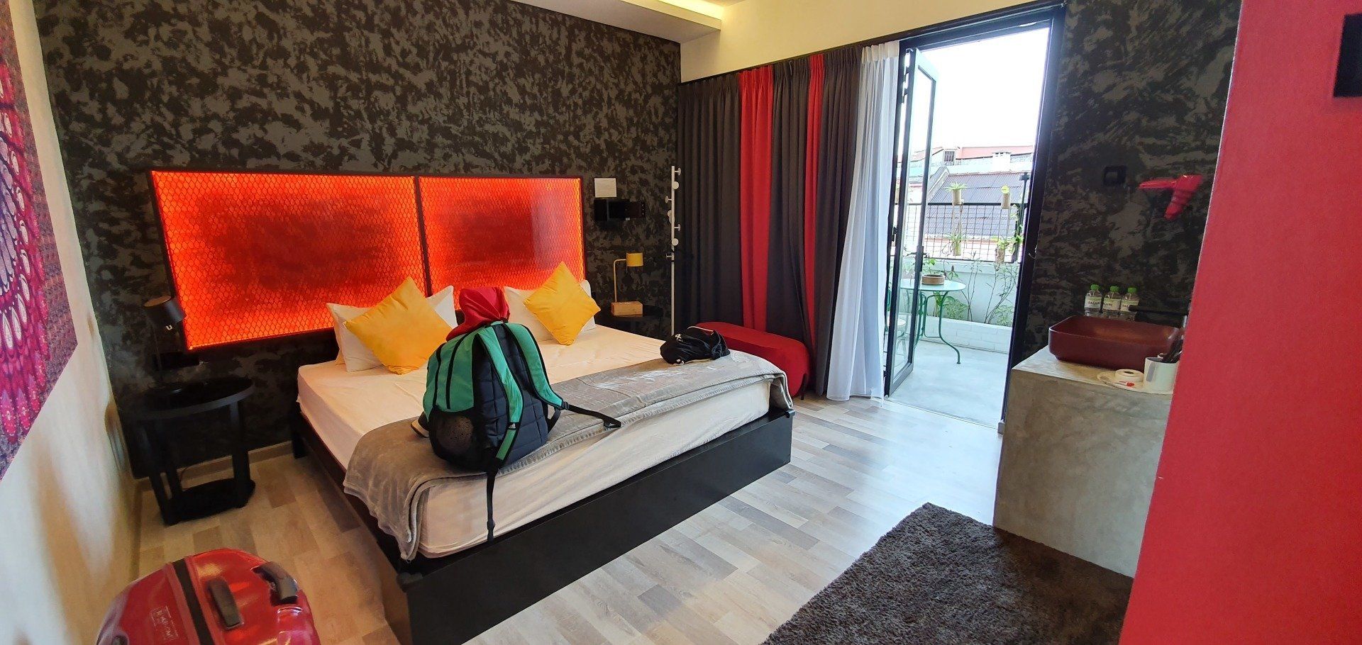 Leider ist der Balkon aber nicht ganz so toll, denn die Tür ist halboffen und gegenüber ist ein Busparkplatz, auf dem die Busse von morgens sehr früh bis abends sehr spät stehen und permanent aufgrund der Klimaanlage den Motor laufen lassen. Das ist zum einen sehr laut und störend, und zum anderen gehen die Dämpfe natürlich auch mitten ins Zimmer.