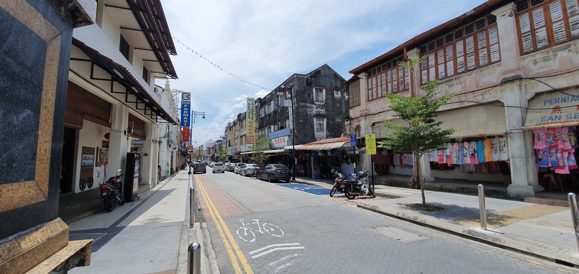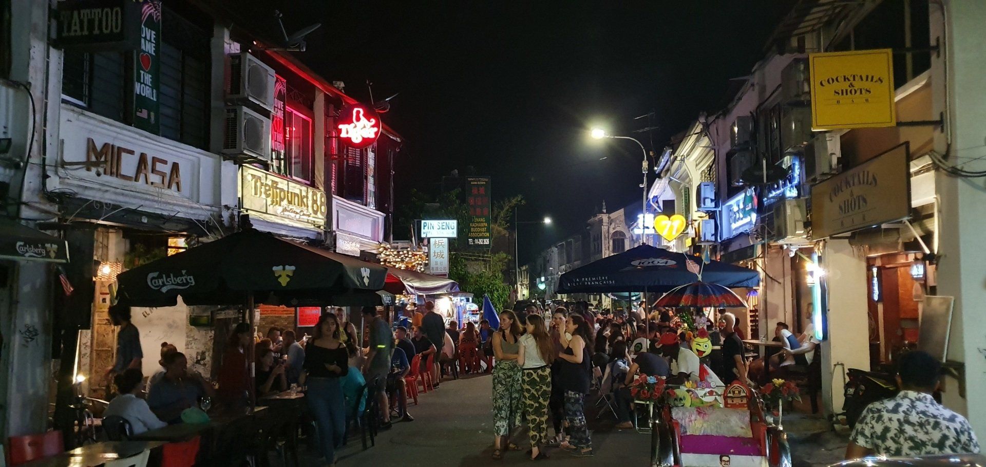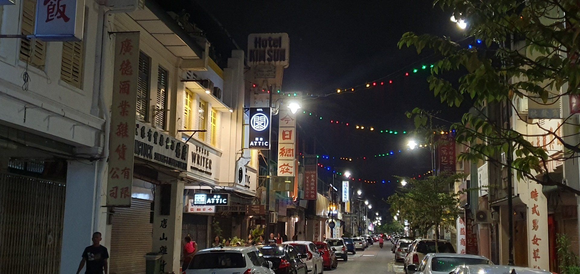 Irgendwie einfach nicht mein Tag heute. Dann Tür auf, wieder Treppen, ein extrem komischer Geruch begrüßt mich und ein Mitarbeiter, der mich bittet, noch kurz draußen zu bleiben. Er versprüht irgendein Spray, scheinbar ist was ausgelaufen, und ich muss davon erst mal wild husten. Dann trägt er den Koffer hoch und ich kann endlich einchecken. Allerdings will man noch einen Deal mit mir aushandeln, um sich die Gebühren zu sparen, und damit es schneller geht, willige ich einfach ein. Denn wenn 4 auf dich einreden, ist es schwer, zu diskutieren. Dann geht es ins Zimmer, was auf den ersten Blick recht nett ist, modern und mit Balkon. Das Hotel ist das Attic Hotel, im Herzen von Chinatown in der Stadt Georgetown. Doch als ich ins Bad gehe, merke ich, dass da wohl kurz vorher noch jemand geduscht hat. Alles ist nass, ein gebrauchtes Shampoodöschen liegt rum und ich denke, oh mann, wann ist dieser Tag endlich rum. Also erst mal zum runterfahren aufs Bett gelegt, es fängt auch noch unfassbar heftig an zu gewittern und schütten, dass man eh keinen Fuß raussetzen könnte - oder wollte. Aber bald hört es auf und ich schnappe mir meine Sachen und drehe noch eine erste Runde in der Stadt zum Kennenlernen. Hier habe ich immerhin 6 Nächte gebucht. Auf Maps.Me ist am Ufer ein Aussichtspunkt ausgeschrieben, den ich ansteuere. Insgesamt ist mein erster Eindruck sehr gut, alles wirkt irgendwie süß und ich habe den Eindruck, man kann sich hier wohlfühlen. Als ich dann zum Wasser komme, ist der Steg aber leider nicht begehbar, weil es wohl einen Wasserrohrbruch gab und das gerade den Steg überflutet. Aber was wundert es mich an diesem Tag... Also such ich mir eine kleine Bar, um noch was zu essen, und gehe dann, vorbei an ersten Streetarts, die einem hier überall begegnen, über die berühmte Lovelane in Richtung Hotel zurück. Und prompt lande ich wieder in einer Straßenparade, scheinbar von Chinesen, die es krachen lassen. Welche Festivität das nun aber war, habe ich nicht mehr rausgefunden. Aber ich verfolge das Spektakel eine ganze Weile und dann gehts zurück. Da keiner mehr an der Rezeption ist, dusche ich halt in dem dreckigen Bad, was mich schon etwas aufregt, und gehe dann ins Bett. Endlich ist dieser Tag vorbei und es kann ja nur wieder was Besseres kommen.