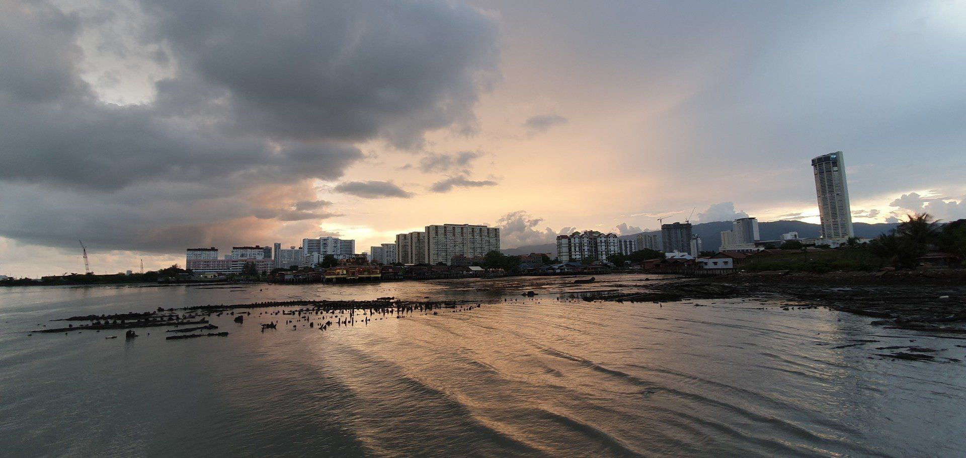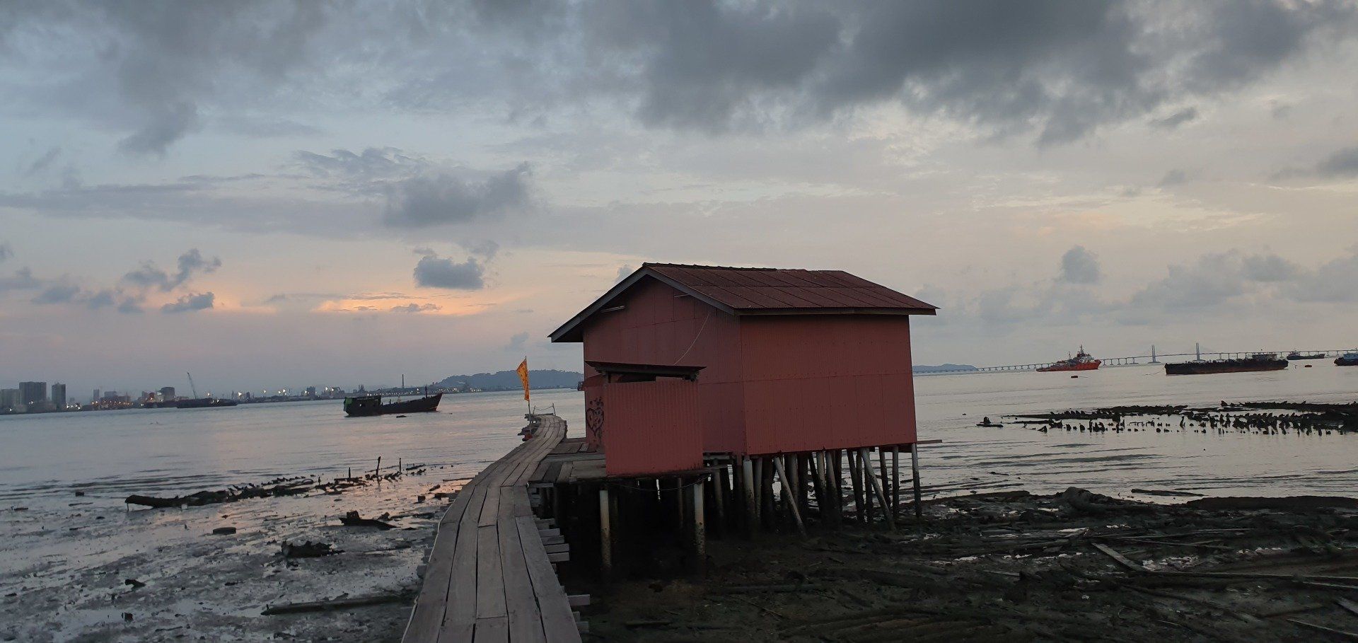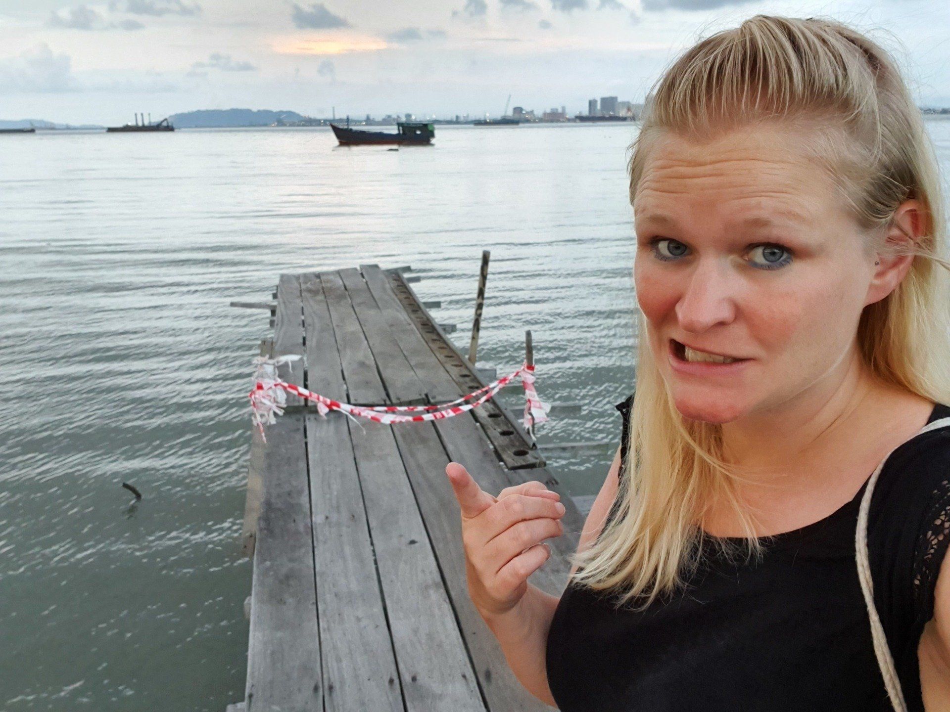 Dann geht es für mich wieder runter, vorbei an vielen Baustellen. Insgesamt ist diese Anlage also schon noch im Aufbau, oder immer wieder im Bau. Es war interessant, aber richtig empfehlenswert irgendwie auch nicht. Und dann bringt mich Grab wieder für ca. 3 Euro zurück zum Hotel. Nach einer kurzen Pause mache ich mich wieder auf zu dem Aussichtpunkt, der gestern nicht zu betreten war. Und es geht, auf wackeligen Brettern kann man weit ins Meer reinlaufen, das sich aufgrund der Ebbe gerade zurückgezogen und viel Müll zum Vorschein gebracht hat. Bis hin zu einem LKW ist nichts da, was es nicht gibt, und was alles so im Meer landet. Von vorne schaue ich mir noch den etwas wolkenbelasteten Sonnenuntergang an und mache mich dann auf den Weg. Kurz vor Anfang der Straße steht noch eine Familie, die ein Foto mit mir machen wollen. Alle, in verschiedenen Konstellationen. Und auch der kleine Junge muss mal mit mir aufs Bild und man sieht ihm an, dass er denkt, was soll ich denn jetzt mit der komischen fremden Frau auf einem Bild. Aber was solls, sie freuen sich drüber und dann gehe ich auch weiter. Entlang des Ufers, was aber auch nicht so ganz einfach ist und man oft auf die Straße muss. Es gibt aber dennoch viel Schönes zu sehen und ich muss sagen, dass mir Georgetown echt gut gefällt. Immer mal wieder trifft man auf die Streetart, auf Sprüche und Bilder. Nach etwa 4 KM Rundgang laufe ich noch mal zur berühmten Lovelane, dieses Mal ohne Parade, und gehe in einem Italiener was essen. Dann geht es auch für mich schon wieder zum Hotel, es ist aber auch schon spät am Abend.