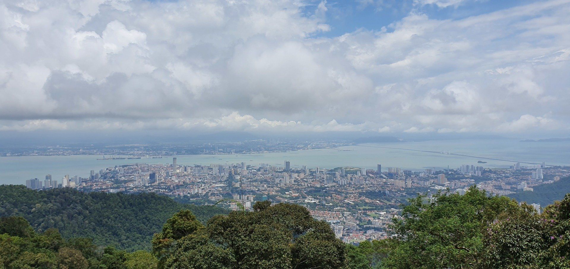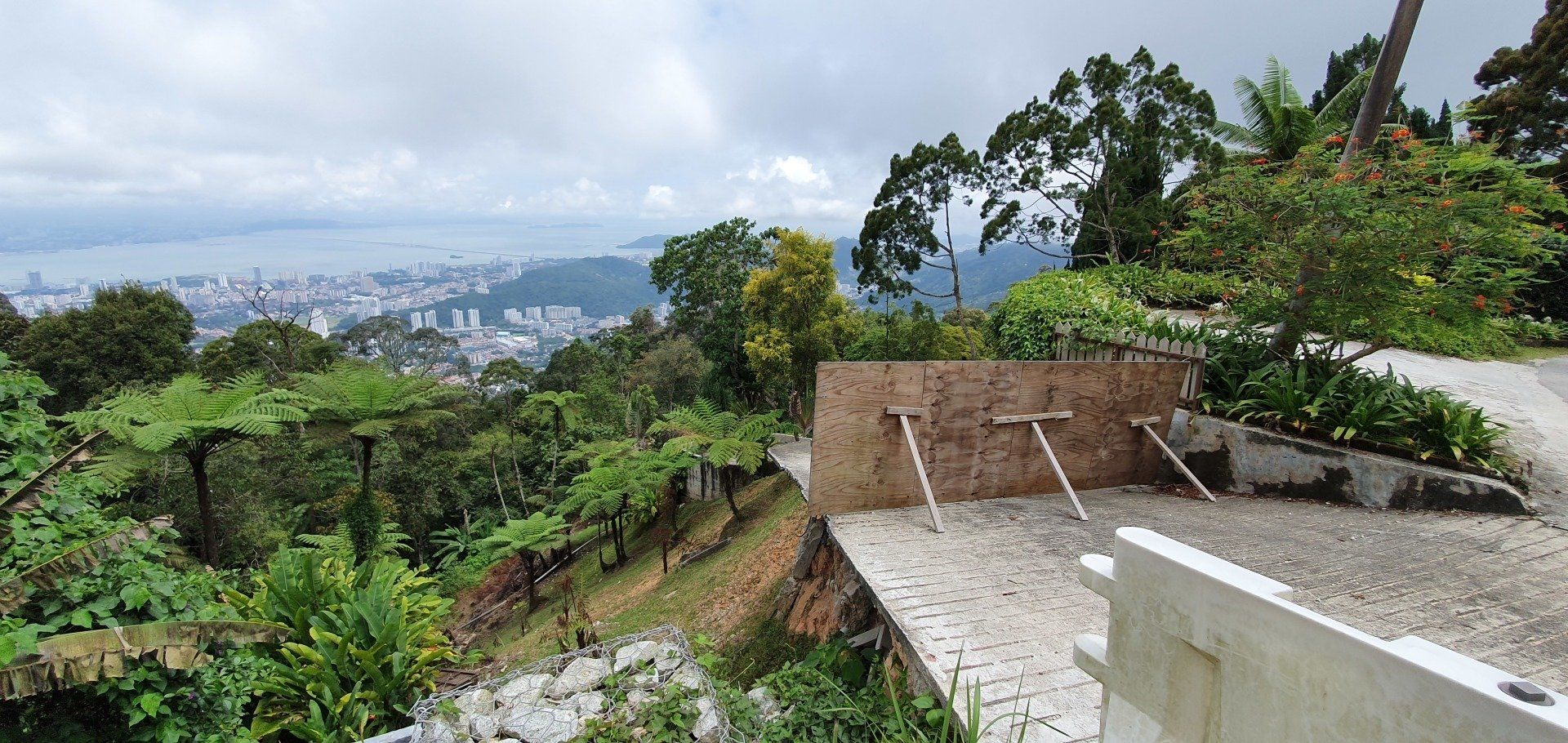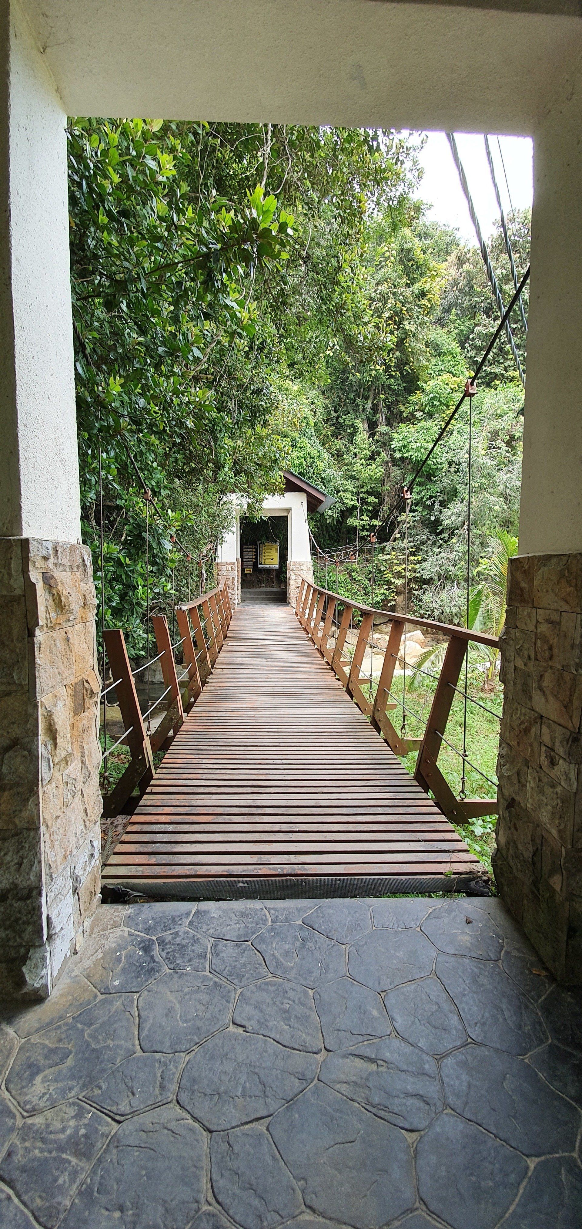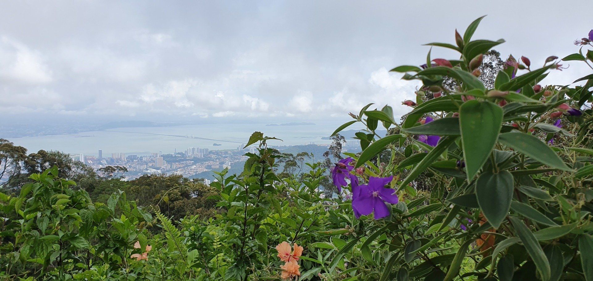 Wirklich spektakulär ist es jetzt nicht, mit dieser Bahn zu fahren, aber man ist schnell oben und die Aussicht ist fantastisch. Der Blick aufs blaue Meer, einen klaren Himmel mit paar Wölkchen, und die Stadt Georgetown in ihrer ganzen Breite - vom idyllischen, hübschen Kern der Altstadt, wo ich auch wohne, über die Plattenbauten und abgeranzten Gegenden außerhalb dieses Stadtteils, der bei Touristen so beliebt ist. Ich gehe relativ schnell weiter weg von dieser ersten Aussichtsplattform, auf der sich alle Leute tummeln. Der Penang Hill bietet auch viele Wanderwege, auch einen kleinen Skywalk, den ich nehmen möchte. Irgendwann sehe ich jedoch ein Schild, das einen größeren, aber gut machbaren Weg ausweist, und entscheide mich dafür, weil ich Lust drauf habe, fit bin und auch das Wetter mitspielt. Man kann auch ein Shuttle nehmen, was wirklich viele in Anspruch nehmen, und sich zu 4 verschiedenen Fotospots fahren lassen. Ich laufe die Strecke und genieße die Aussicht. Und nach ca. 500 Metern, entfernt von der Haltestelle der Bahn, bin ich auch schon relativ alleine auf diesem sehr gut ausgebauten Weg. Lediglich ein englisches Paar hat sich wohl auch entschieden, sich etwas zu bewegen. Sonst ist wirklich keine Menschenseele zu Fuß unterwegs, alle lassen sich mit den Caddies umherfahren. Das ist so schade, denn die Wege sind toll und es ist so schön zu laufen. Ich laufe zu verschiedenen Punkten, es gibt immer wieder Hinweistafeln über die verschiedene Flora und Fauna und es ist einfach ein schöner Tag. Irgendwann biege ich ab, weg aus der Sichtweite des Pärchens, und lande auf einem Weg schon bergab. Auch der Weg ist gepflastert und sehr schön, aber da hier keine Caddies fahren, begegnet mir hier niemand und der Weg ist auch nicht gepflegt, sprich voll von Blättern und was die Natur so bringt.