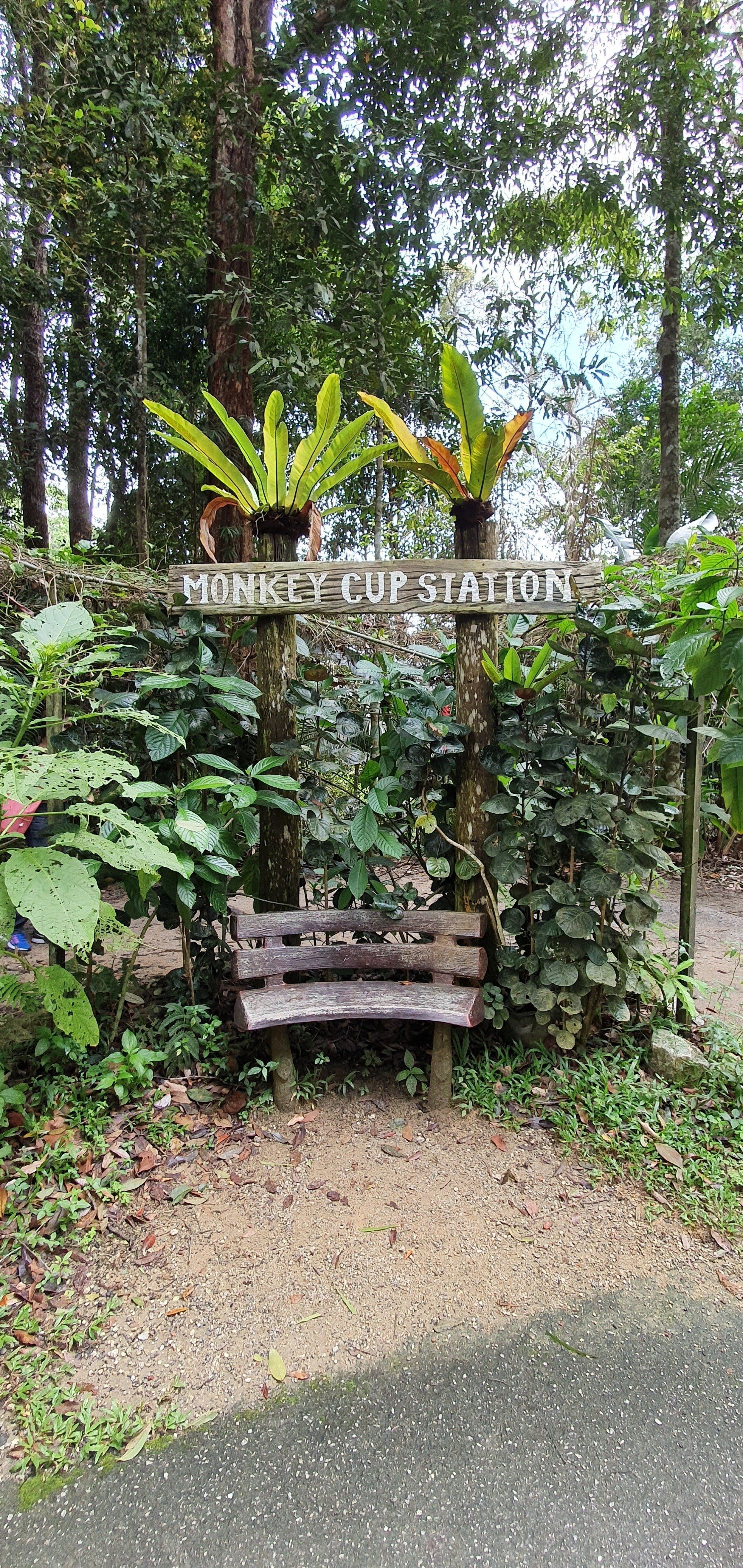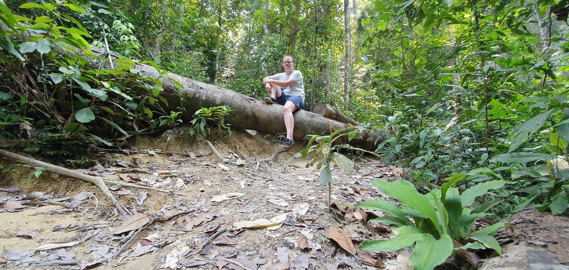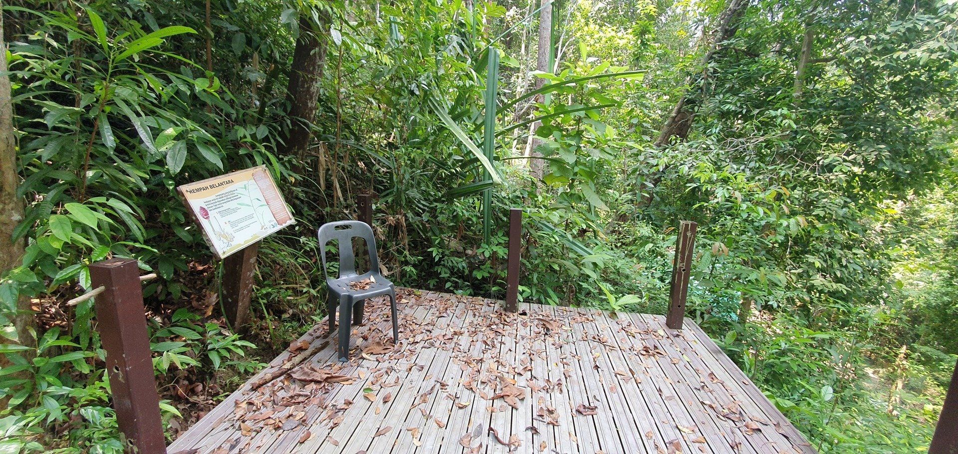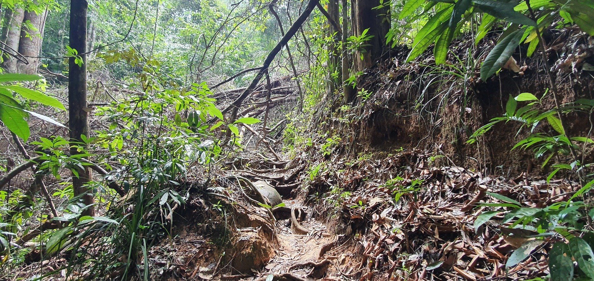 Es scheint etwas schwierig zu sein, diesen Nationalpark in Schuss zu halten, was auch schade ist. Man hat für die Touristen auch einen Hängebrückenpfad errichtet, die Brücken sind hoch oben auch noch sichtbar, aber der ist gesperrt, weil es wohl auch hier einen umgestürzten Baum gab und man es nicht mehr erneuert hat. Ich laufe noch zur Hütte rauf, an der man seinen Beitrag zum Betreten der Brücken zahlen musste, und alles ist sehr verfallen. Eigentlich echt traurig. Das Ganze, wie auch der Sturm, der den Weg zu Monkey Beach versperrt hat, war wohl schon 2017. Es geht für mich weiter, irgendwann kreuzt ein Pärchen meinen Weg, das ist dann auch schon alles. Da ich nicht ganz fit bin, finde ich es mal wieder recht anstrengend, wenn auch sehr schön. Aber manchmal muss man echt gut überlegen, wie man über die Baumstämme, Äste und Co drüber kommt. Natürlich nehme ich auch einige blaue Flecken mit nach Hause, aber das ist glücklicherweise auch alles. Immer mal wieder gibt es auch Abzweigungen, die ich aber nicht nehme, weil sie vom "Hauptweg" abweichen, der auch schon schwer zu erkennen ist, und ich da dann bezweifle, dass man wirklich weiter kommt, oder ich mich gar noch verirre. Zumal ich von der Route, die ich bei der Registrierung eingetragen habe, nun ja auch abgewichen bin. Irgendwann kreuzt dann der "eigentliche" Weg zum Turtle Beach, der gut ausgebaut ist, und ich denke, na, das habe ich ja wieder mal gut gemacht. Es sind noch rund 1,2 km bis zum Strand und ich laufe mal in die Richtung, um den Weg auszuchecken. Nach ca. 500 m drehe ich aber um, weil ich meine Kräfte etwas schwinden sehe und nicht noch mal runter will, um später noch einmal hoch zu laufen. Immerhin ist man hier auch wieder auf einer guten Höhe und weitere Kopfschmerzen wie in den Cameron Highlands will ich nicht riskieren. Also mache ich noch eine kurze Pause an einer ehemaligen Hütte. Auf den ganzen Wegen, die ich gesehen habe und gelaufen bin, ist alles, was mal gebaut wurde, nicht instand gehalten worden. Informationsschilder über Geschichte, Flora und Fauna ist teilweise so verwittert, dass man es nicht mehr lesen kann. Sehr schade. Auch die "Hütte" besteht nur noch aus einem Teil eines Daches sowie ein paar Brettern, die lose umher liegen und wohl mal den Boden darstellen sollten.