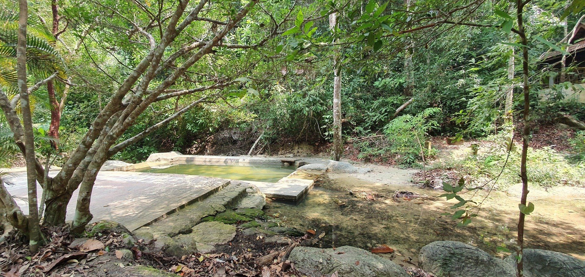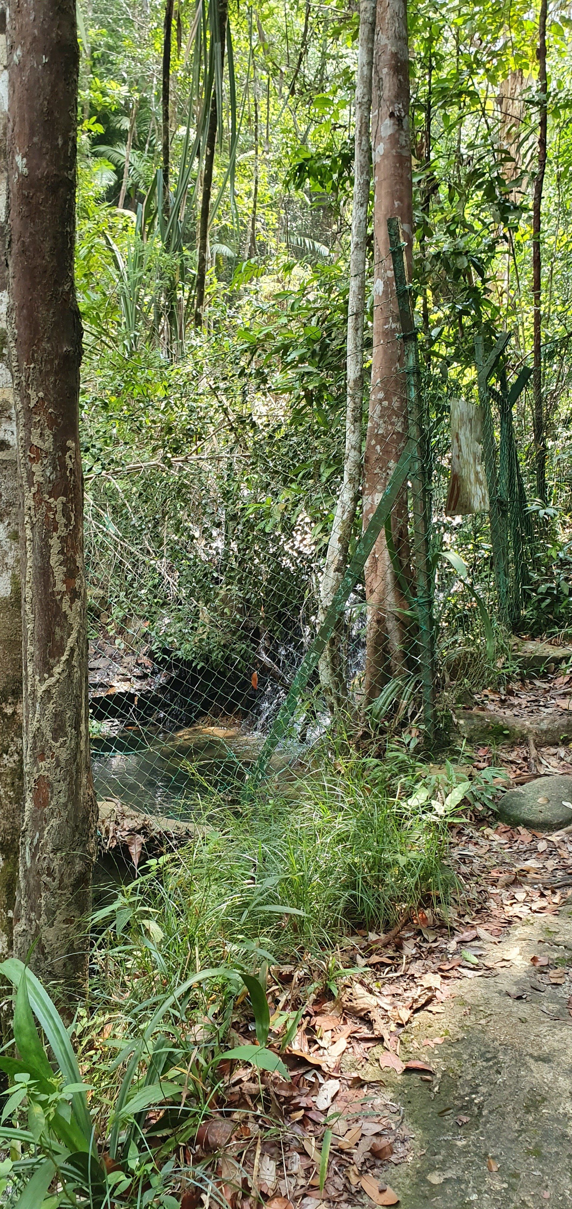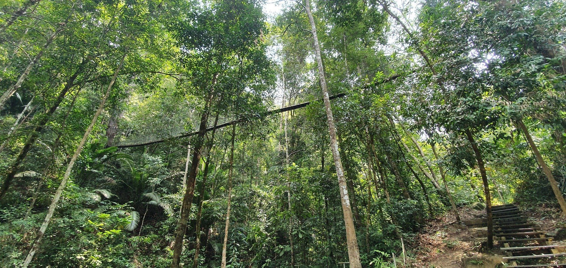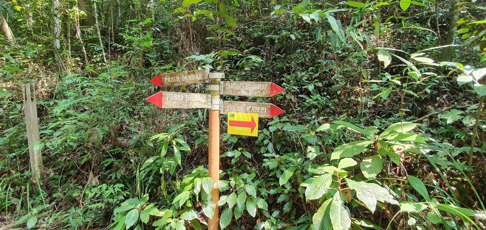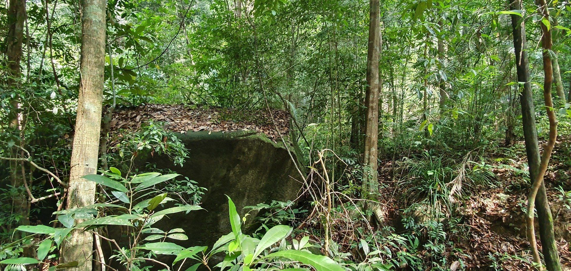 Es scheint etwas schwierig zu sein, diesen Nationalpark in Schuss zu halten, was auch schade ist. Man hat für die Touristen auch einen Hängebrückenpfad errichtet, die Brücken sind hoch oben auch noch sichtbar, aber der ist gesperrt, weil es wohl auch hier einen umgestürzten Baum gab und man es nicht mehr erneuert hat. Ich laufe noch zur Hütte rauf, an der man seinen Beitrag zum Betreten der Brücken zahlen musste, und alles ist sehr verfallen. Eigentlich echt traurig. Das Ganze, wie auch der Sturm, der den Weg zu Monkey Beach versperrt hat, war wohl schon 2017. Es geht für mich weiter, irgendwann kreuzt ein Pärchen meinen Weg, das ist dann auch schon alles. Da ich nicht ganz fit bin, finde ich es mal wieder recht anstrengend, wenn auch sehr schön. Aber manchmal muss man echt gut überlegen, wie man über die Baumstämme, Äste und Co drüber kommt. Natürlich nehme ich auch einige blaue Flecken mit nach Hause, aber das ist glücklicherweise auch alles. Immer mal wieder gibt es auch Abzweigungen, die ich aber nicht nehme, weil sie vom "Hauptweg" abweichen, der auch schon schwer zu erkennen ist, und ich da dann bezweifle, dass man wirklich weiter kommt, oder ich mich gar noch verirre. Zumal ich von der Route, die ich bei der Registrierung eingetragen habe, nun ja auch abgewichen bin. Irgendwann kreuzt dann der "eigentliche" Weg zum Turtle Beach, der gut ausgebaut ist, und ich denke, na, das habe ich ja wieder mal gut gemacht. Es sind noch rund 1,2 km bis zum Strand und ich laufe mal in die Richtung, um den Weg auszuchecken. Nach ca. 500 m drehe ich aber um, weil ich meine Kräfte etwas schwinden sehe und nicht noch mal runter will, um später noch einmal hoch zu laufen. Immerhin ist man hier auch wieder auf einer guten Höhe und weitere Kopfschmerzen wie in den Cameron Highlands will ich nicht riskieren. Also mache ich noch eine kurze Pause an einer ehemaligen Hütte. Auf den ganzen Wegen, die ich gesehen habe und gelaufen bin, ist alles, was mal gebaut wurde, nicht instand gehalten worden. Informationsschilder über Geschichte, Flora und Fauna ist teilweise so verwittert, dass man es nicht mehr lesen kann. Sehr schade. Auch die "Hütte" besteht nur noch aus einem Teil eines Daches sowie ein paar Brettern, die lose umher liegen und wohl mal den Boden darstellen sollten.