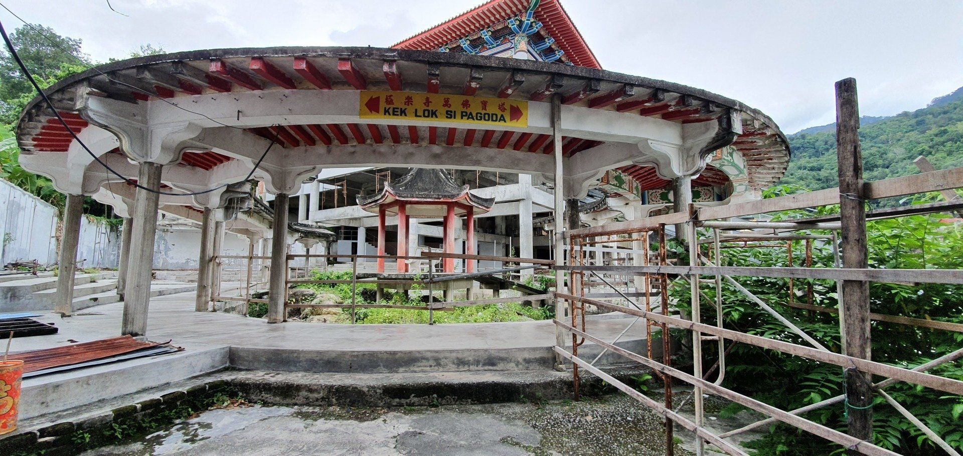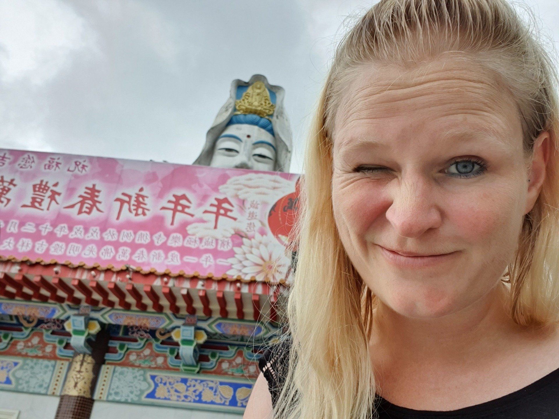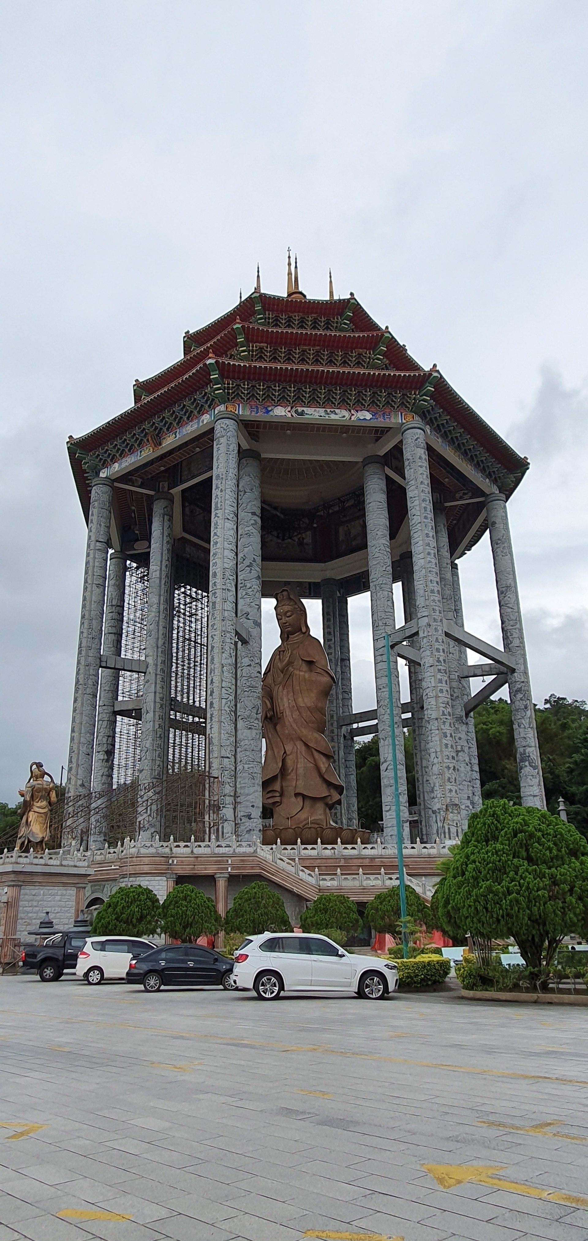 Da noch Zeit ist, lasse ich mich von Grab zum nahegelegenen Kek Lok Si Tempel fahren. Wohl einer der größten der Gegend, chinesisch-buddhistisch. Der Eingang, an dem die Touris sich dem schon von Weitem sichtbaren Tempel nähern können, ist ein elend langgezogener Tunnel durch Verkaufsstände hindurch, und alle wollen einem wieder ihren Kram andrehen. Es sind meistens Souvenirs, T-shirts... Und ich bin nicht so ganz sicher, ob sich hier wirklich so viele Leute hin verirren. Es wirkt alles etwas verwaist. Nachdem ich den Händler"attacken" erfolgreich entkommen bin, gehe ich hoch zum Tempel. Alles wirkt irgendwie nicht so prunkvoll, wie man es erwartet hätte. Viel ist schon zerfallen oder es befindet sich immer noch im Aufbau. Der Tempel, oder die Tempelanlagen ziehen sich über mehrere Ebenen. Viele goldene Buddha-Statuen sind zu finden, die wirklich schön und anmutig sind. Ich gehe einmal komplett durch, verfolge ein paar Zeremonien und dann geht es über eine kleine Aufzugbahn noch mal eine Ecke höher zur riesigen Statue der Kuan Yin, die Göttin der Gnade und des Mitgefühls. Umgerechnet kostet das 3 Euro. Oben gibt es zum einen die imposante, doch recht nett anzuschauende Statue, die allerdings irgendwie auch noch im Bau ist und man daher nicht direkt hoch kann, und einen Teich mit vielen Karpfen. Auf einem Schild steht auch, dass man bitte keine Fische darin aussetzen soll. Schade, mache ich doch sonst immer mit den Fischen, die ich immer dabei habe...