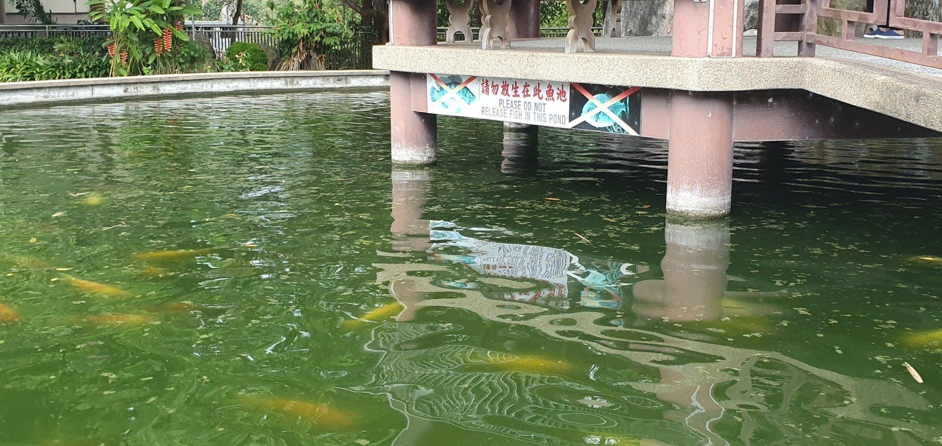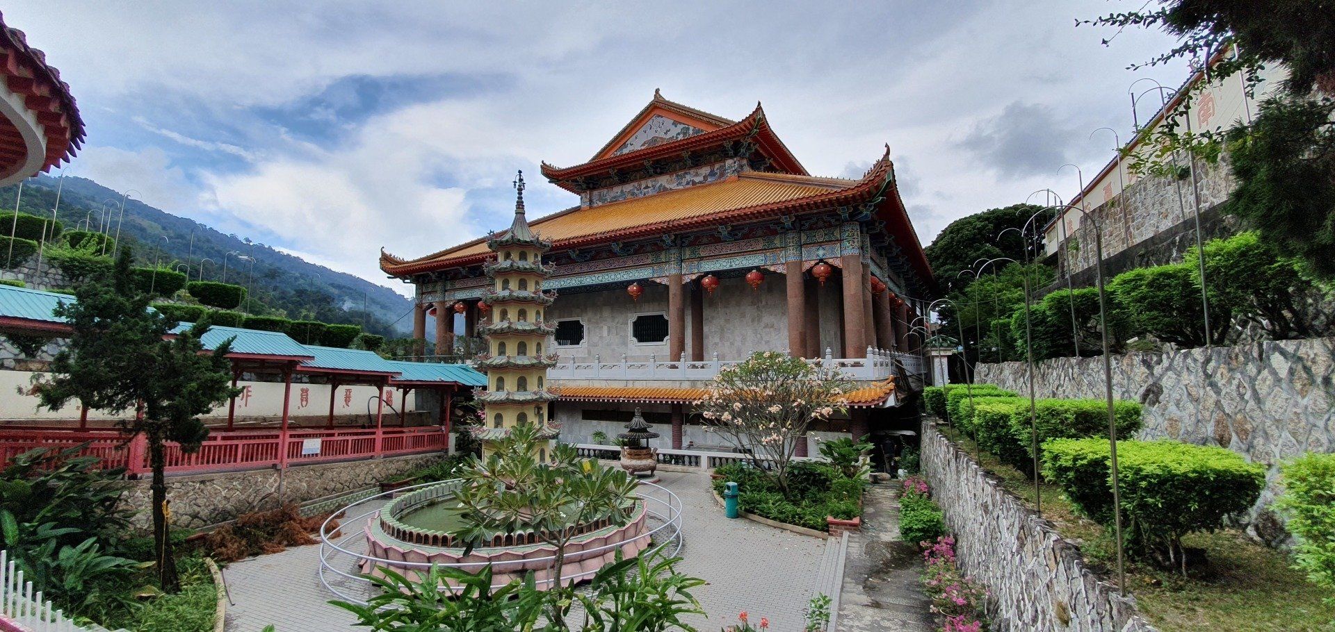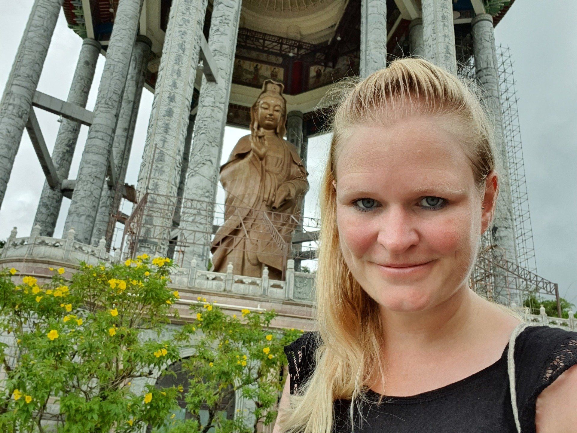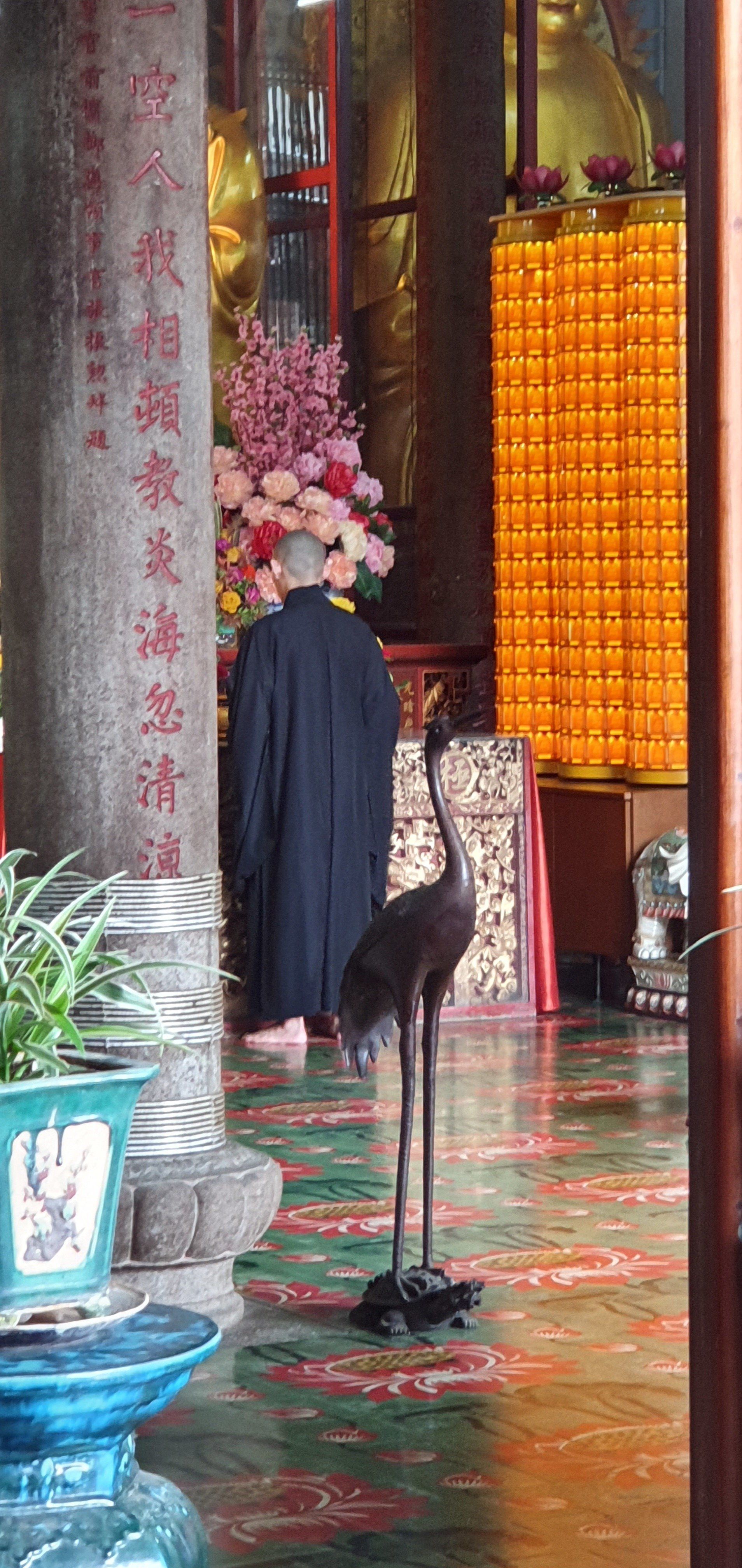 Da noch Zeit ist, lasse ich mich von Grab zum nahegelegenen Kek Lok Si Tempel fahren. Wohl einer der größten der Gegend, chinesisch-buddhistisch. Der Eingang, an dem die Touris sich dem schon von Weitem sichtbaren Tempel nähern können, ist ein elend langgezogener Tunnel durch Verkaufsstände hindurch, und alle wollen einem wieder ihren Kram andrehen. Es sind meistens Souvenirs, T-shirts... Und ich bin nicht so ganz sicher, ob sich hier wirklich so viele Leute hin verirren. Es wirkt alles etwas verwaist. Nachdem ich den Händler"attacken" erfolgreich entkommen bin, gehe ich hoch zum Tempel. Alles wirkt irgendwie nicht so prunkvoll, wie man es erwartet hätte. Viel ist schon zerfallen oder es befindet sich immer noch im Aufbau. Der Tempel, oder die Tempelanlagen ziehen sich über mehrere Ebenen. Viele goldene Buddha-Statuen sind zu finden, die wirklich schön und anmutig sind. Ich gehe einmal komplett durch, verfolge ein paar Zeremonien und dann geht es über eine kleine Aufzugbahn noch mal eine Ecke höher zur riesigen Statue der Kuan Yin, die Göttin der Gnade und des Mitgefühls. Umgerechnet kostet das 3 Euro. Oben gibt es zum einen die imposante, doch recht nett anzuschauende Statue, die allerdings irgendwie auch noch im Bau ist und man daher nicht direkt hoch kann, und einen Teich mit vielen Karpfen. Auf einem Schild steht auch, dass man bitte keine Fische darin aussetzen soll. Schade, mache ich doch sonst immer mit den Fischen, die ich immer dabei habe...