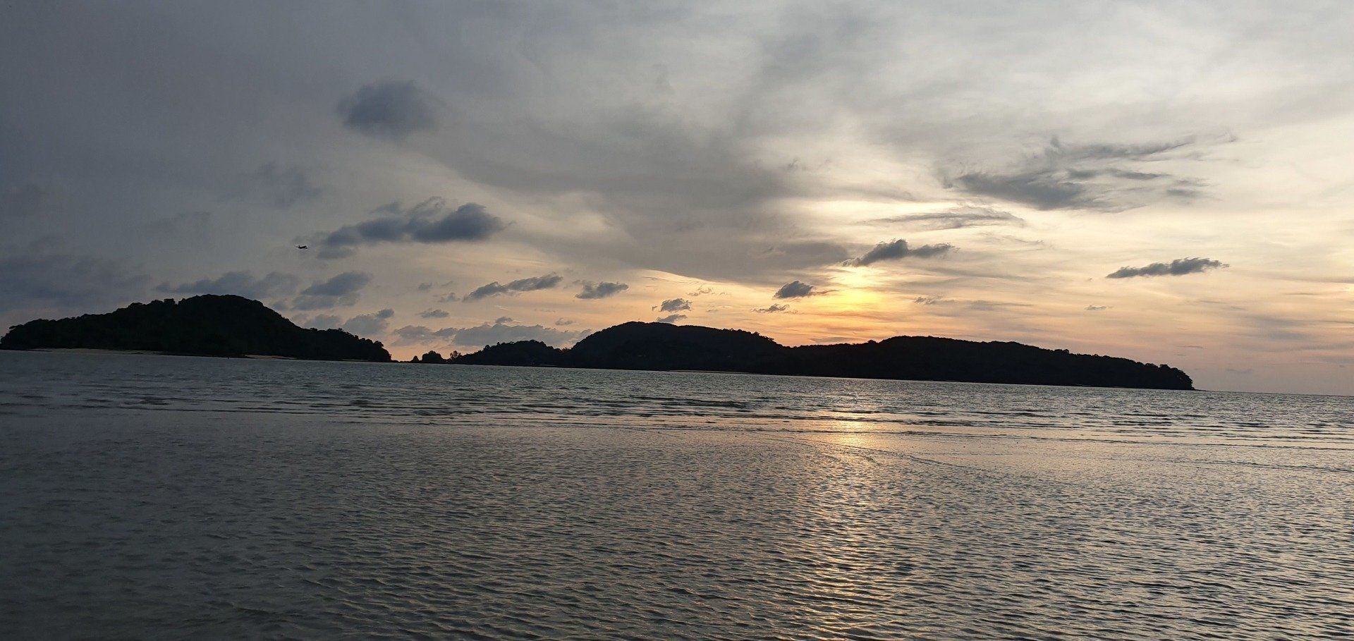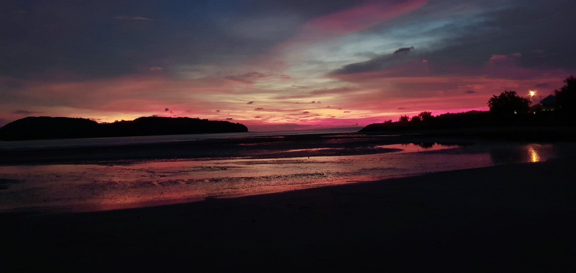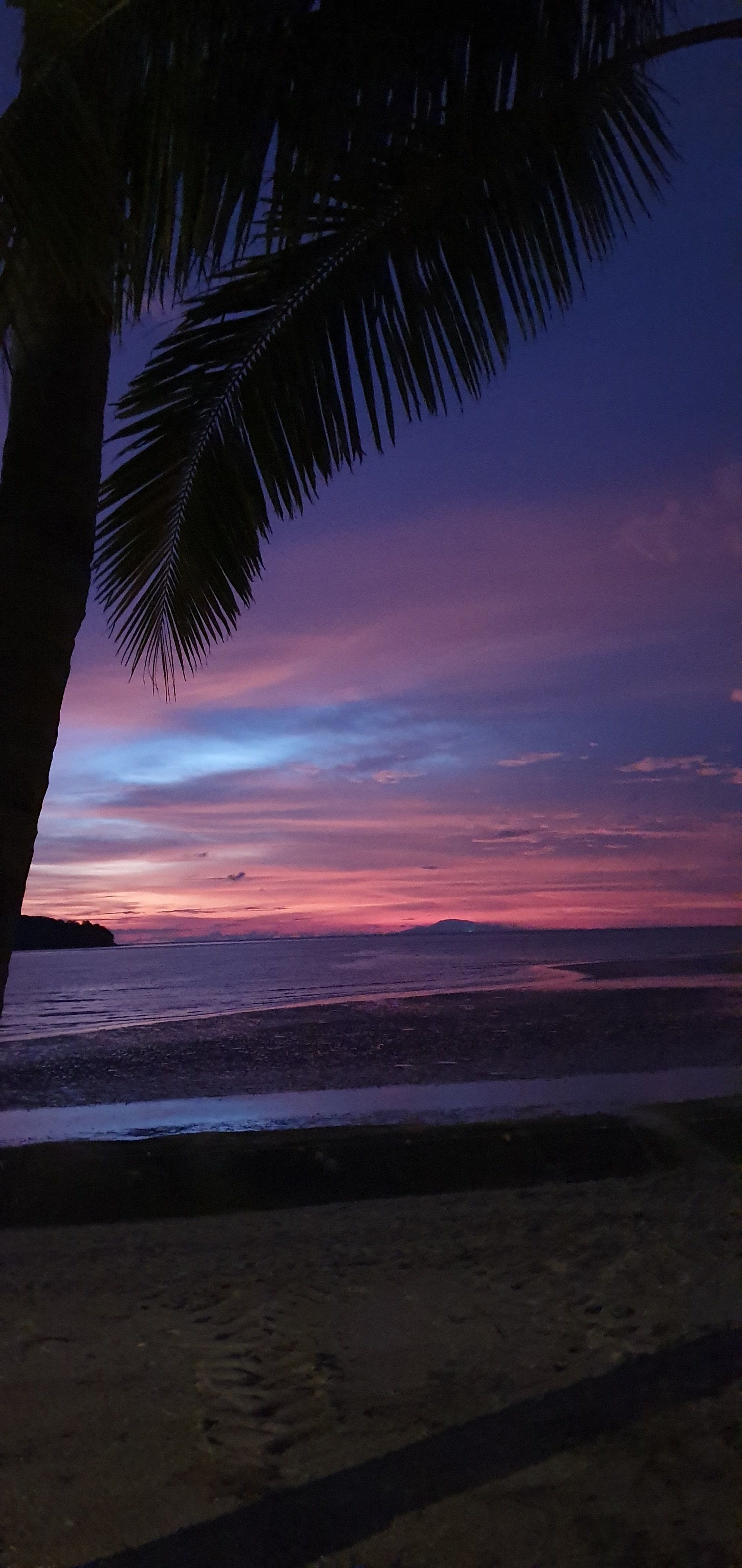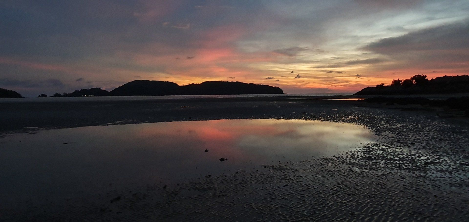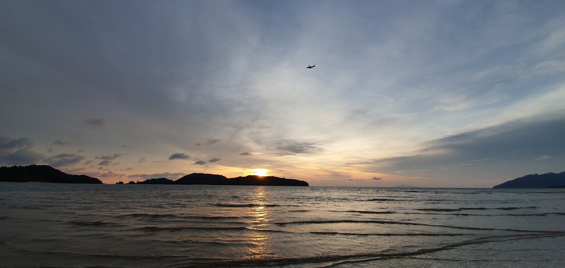 Dann auf Langkawi ist es aber recht easy, weil der Flughafen auch klein ist. Mit Grab gehts zu meiner Unterkunft. Der Fahrer ist nett und wir unterhalten uns gut, und er sagt noch, wenn ich Roller fahre, wäre es hier nicht so schlimm. Nur muss man aufpassen, dass einem keine Tiere vors Gefährt laufen: Hunde, Katzen, Hühner, Ratten, Kühe, Affen... Meine Unterkunft hier ist etwas günstiger und nicht direkt am Strand, aber ich habe auch eh nicht vor, viel dort zu sein. Dennoch ist es sehr nett und das Personal auch, sodass man sich schnell wohl fühlt. Wie man auch sehen kann, ist hier viel im Aufbau. Bei vorherigen Bewertungen war die Rede von Bauarbeiten, wo ein Pool entstehen soll, der jetzt in den letzten Zügen war. Es fehlten nur noch die Feinheiten, dann hätte man ihn schon nutzen können. Auch befindet sich nach wie vor viel Müll an den Straßenrändern, aber an dieses Bild muss man sich leider hier in Asien vielerorts gewöhnen. Nachdem ich mein Zimmer eingecheckt habe, laufe ich zum Strand und einmal den ganzen Ort ab, Cenang Beach. Meine Unterkunft ist das Casa Idaman Motel in Cenang. Der Strand ist wirklich sehr schön und ich fühle mich direkt wohl. Die ganze Stimmung und Atmosphäre ist toll und man kann wirklich weit ins Wasser laufen, da gerade Ebbe ist. Man könnte sogar bis zur nächsten kleinen Insel laufen. Leider habe ich die Zeit nicht dafür und schlendere weiter am kilometerlangen weißen Sandstrand entlang, bis die Sonne untergeht und ich einen der schönsten Sonnenuntergänge sehe, die ich jemals sehen durfte. Der Himmel wird pink angemalt, richtig kräftige Farben schmücken den Himmel. Zwischendurch fliegt noch ein Flugzeug über meinen Kopf, da der Flughafen recht nah am Strand ist.