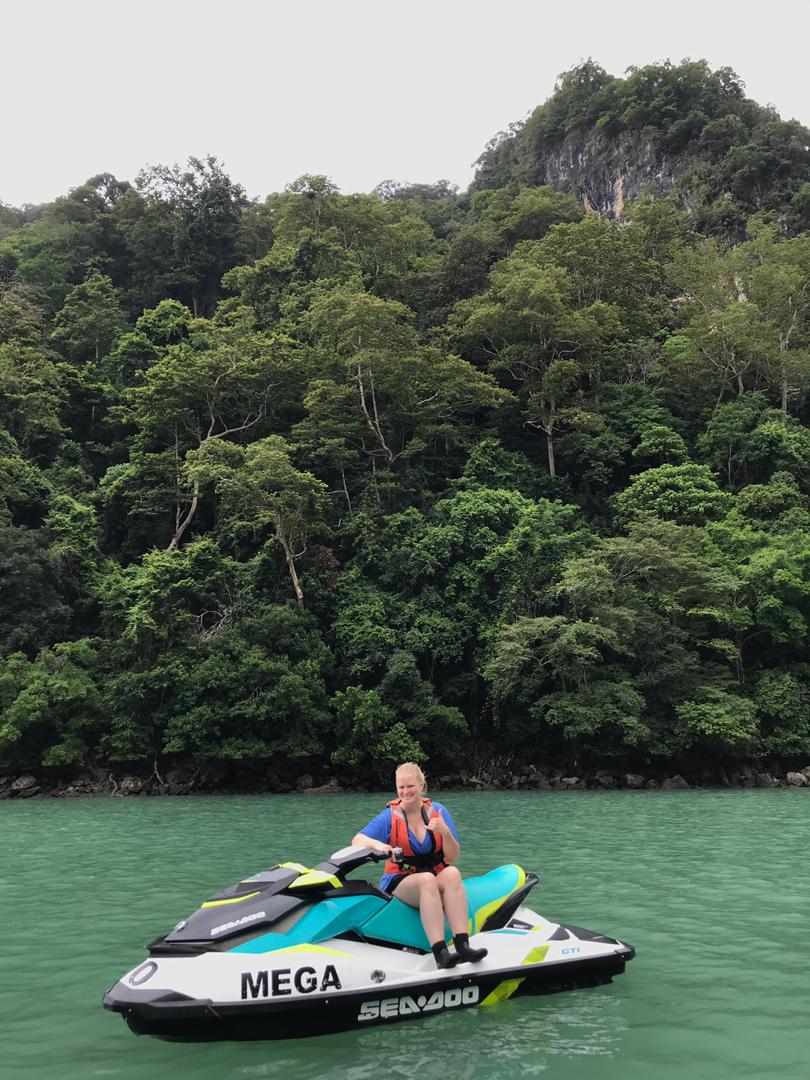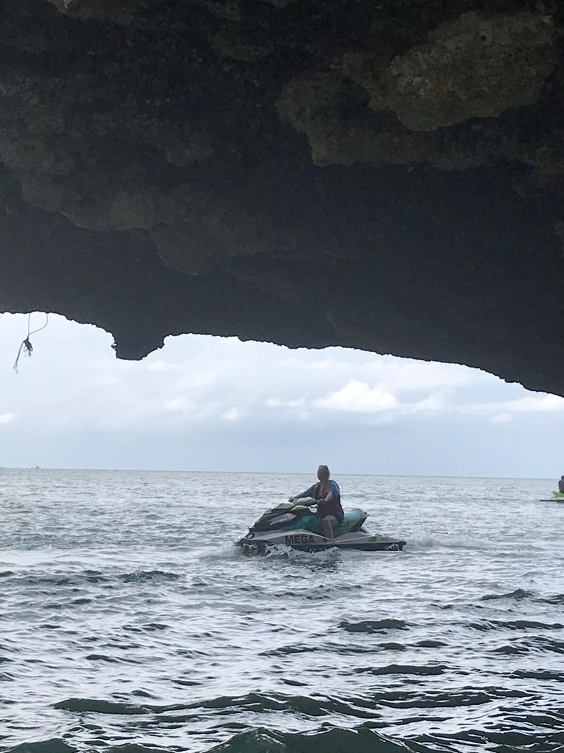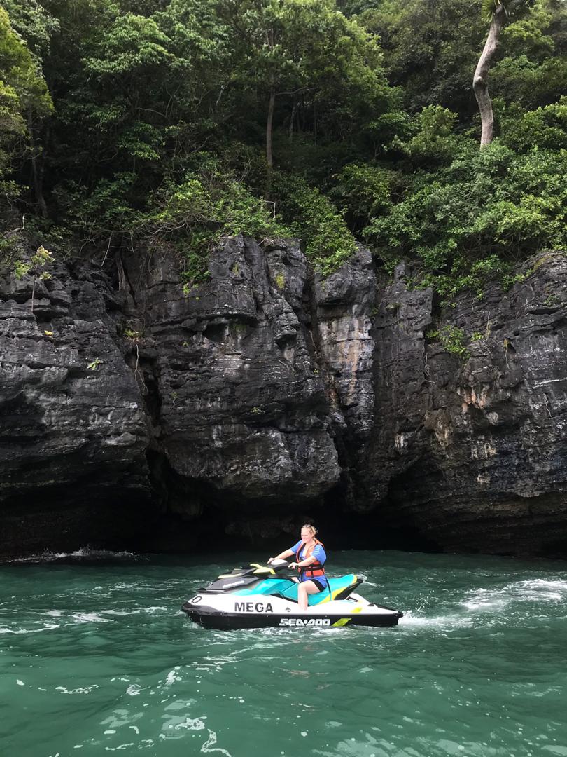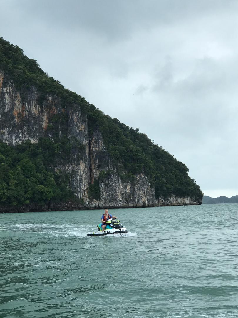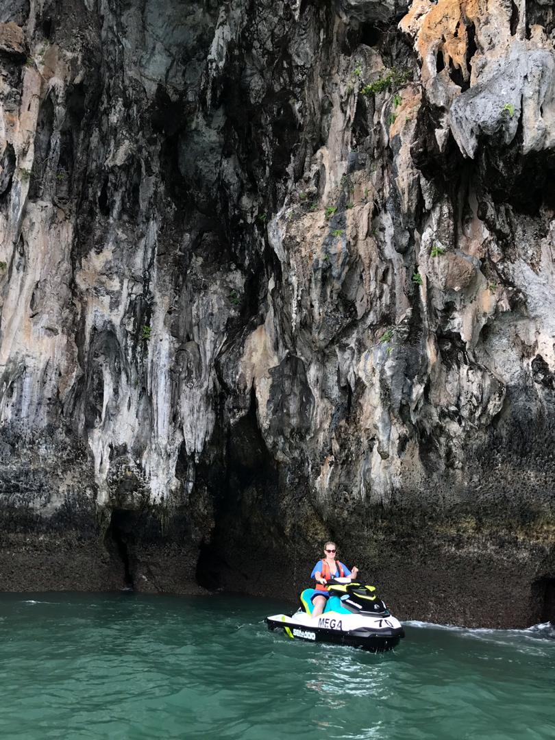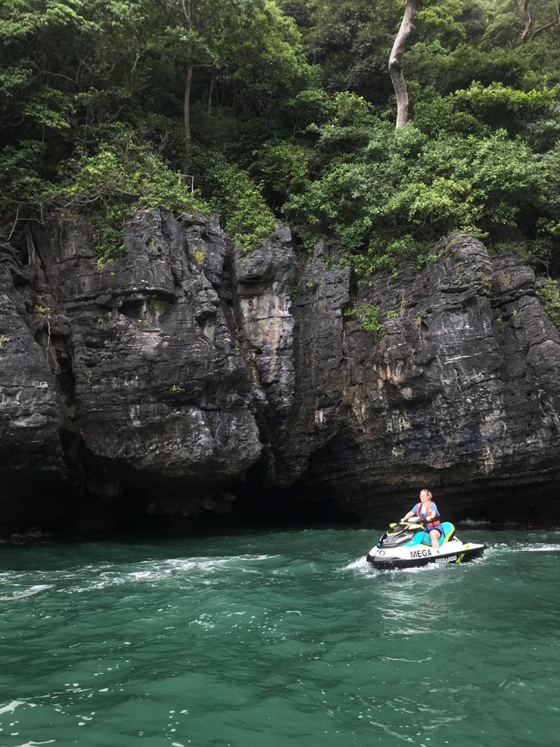 Dann geht es auch noch zu verschiedenen Felsformationen, teilweise mit richtig tiefen Felsspalten, was wir mit den Jetskis nah bestaunen können. An einer kleineren Insel machen wir noch einen Halt und können schwimmen, was auch super angenehm ist, da das Wasser warm ist und der Fahrtwind gepaart mit dem windigen Wetter und Regen doch recht kühl.