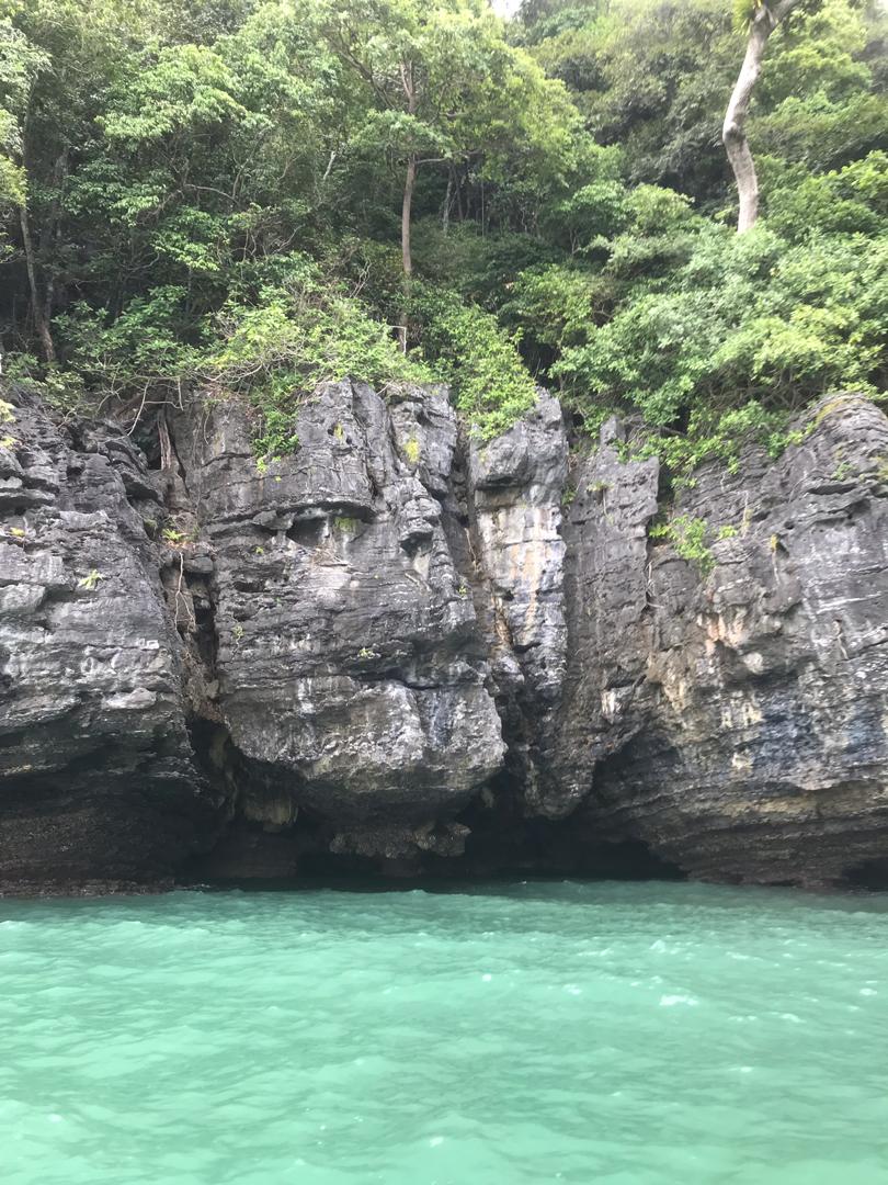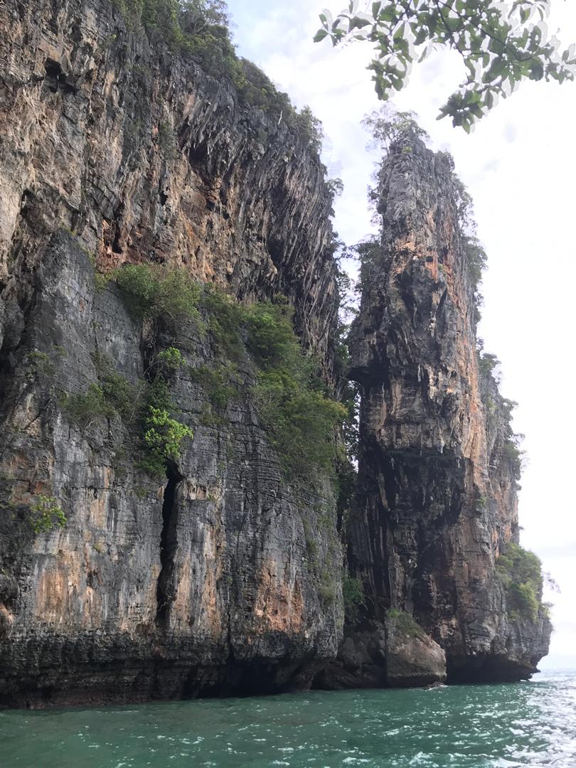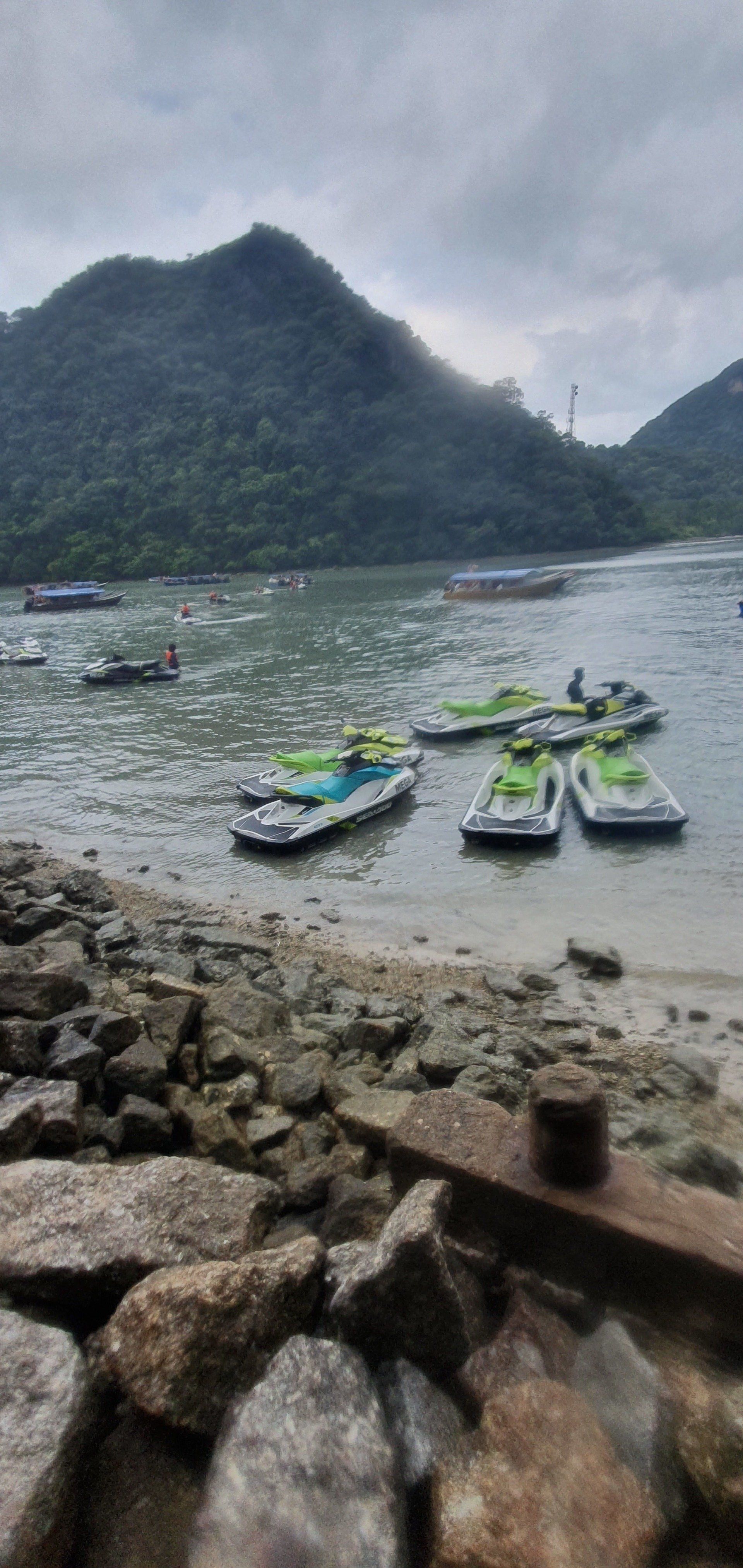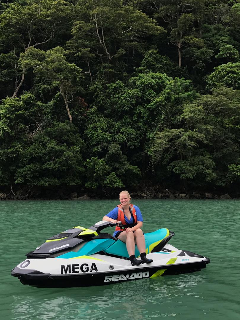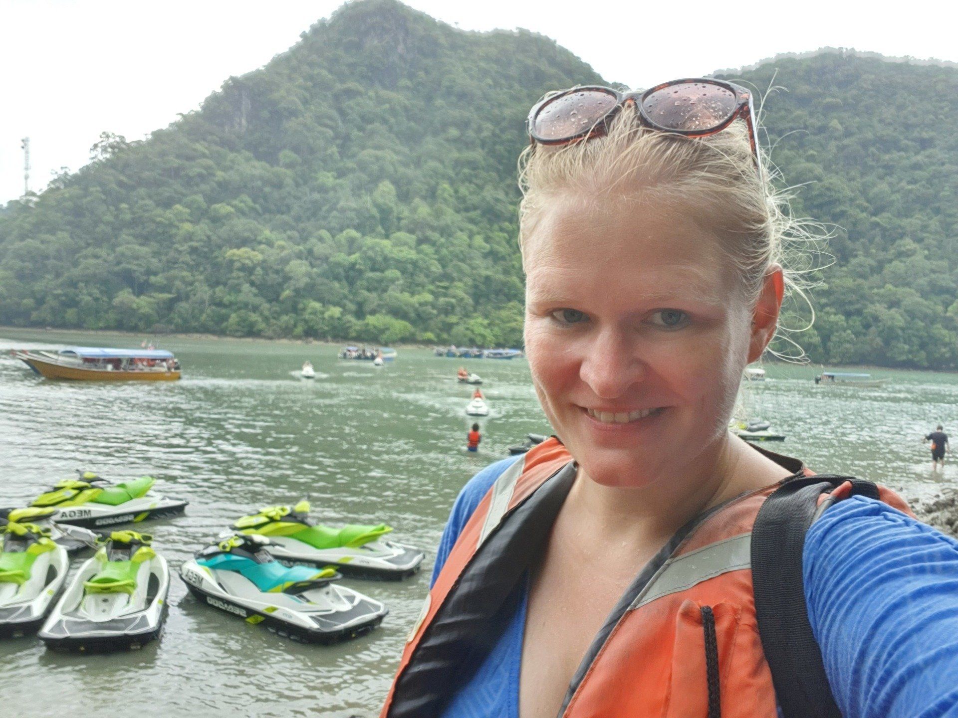 Dann geht es auch noch zu verschiedenen Felsformationen, teilweise mit richtig tiefen Felsspalten, was wir mit den Jetskis nah bestaunen können. An einer kleineren Insel machen wir noch einen Halt und können schwimmen, was auch super angenehm ist, da das Wasser warm ist und der Fahrtwind gepaart mit dem windigen Wetter und Regen doch recht kühl.