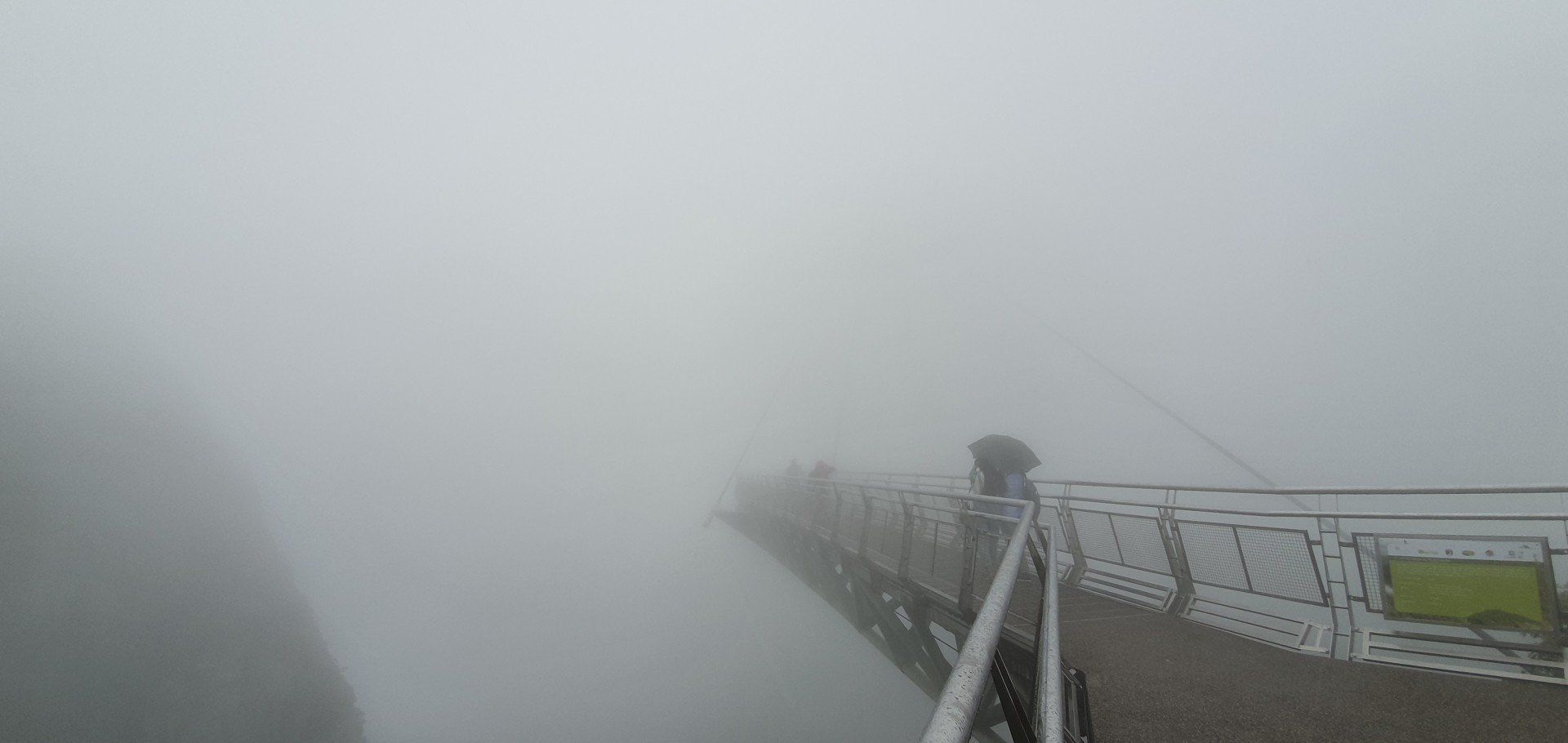 Oben sehe ich dann auch, dass die Brücke auf ist, was mich sehr freut. Ich kaufe mir ein teureres Ticket, weil ich denke, dass man da noch etwas Besonderes dabei hat, aber wie sich rausstellt, ist es einfach nur eine weitere Bahn, damit man nicht die Stufen laufen muss. Und das dauert noch mal etwa eine Stunde, bis ich endlich meinen Fuß rein setzen kann. Bzw. bis ich Glück hatte und noch als Einzelperson in dieser Bahn mit konnte. Denn an der Brücke angekommen laufe ich drüber und verstehe nun auch, warum sie bei schlechtem Wetter und Wind geschlossen ist (es ist gut wackelig). Die Aussicht ist genial. Ich laufe über die Brücke bis zu einer kleinen Plattform, wo sich auch einige Äffchen aufhalten und schaue mir die weite Sicht auf die Berge an. Und während ich da so verträumt gucke, ziehen in einem rasanten Tempo ein paar Wolken durch die Bergspitzen, was ich zunächst echt faszinierend finde, wie schnell das geht. Und dann drehe ich mich um, und wo vor einer Minute noch die Brücke samt herrlichem Ausblick war, ist nun nur noch die Silhouette und ein einziger Nebelwald zu sehen. Auch faszinierend irgendwie, wie schnell das geht. Diejenigen, die hinter mir standen und erst jetzt aus der Bahn kamen, konnten schon gar nichts mehr von der Aussicht genießen. Ich hatte echt Glück. Doch dann fängt es an zu schütten ohne Ende. Ein starkes Gewitter kommt dazu und alle flüchten unter das Häuschen und warten auf die Bahn. Die eine Bahn, die so ewig braucht. Ich habe so ein bisschen meinen Flieger im Kopf... Aber noch ist etwas Zeit. Leider haben auch nun alle, die zuvor gelaufen sind, sich ein Ticket gekauft, und so heißt es wieder ewig warten und darauf achten, dass die Chinesen sich nicht wieder dreist vordrängeln. Denn vor allem mit einem Typen musste ich mich anlegen, denn er wollte sich mit 3 anderen an mir vorbei in die Bahn drängeln, und ich wäre nicht mehr mitgekommen. Aber ich habe ein paar nette Helfer in der Schlange bei mir gehabt und so kann ich mit. Ein Glück. Nach oben fährt auch sonst keiner mehr, alle Gondeln sind komplett verwaist. Auch die Aussicht, die man auf der Fahrt nach oben hatte, ist natürlich hin. Nur Nebel, Regen und Gewitter mit einigen spektakulären Blitzern zwischendurch. Na ja, die werden ja wisen, wann sie die Gondeln lieber stoppen... Und dann komme ich auch endlich unten an, und weil alles so ewig gedauert hat, kann ich leider keine weiteren Orte anfahren, wie geplant. Aber zudem ist das Wetter ja wirklich nicht einladend, und so muss ich auch in diesen sauren Wetterapfel beißen und fahre im Regen auf dem Roller mit einem provisorischen Regencape zurück, sehr langsam, weil alles sehr nass und rutschig ist. Fast pünktlich zum Late Checkout gebe ich dann den Roller ab, sammele meine Sachen im Zimmer ein und fahre zum Flughafen. Zum Glück keine Verspätung, aber da ich noch total durchnässt bin, ist es auch nicht so angenehm, im klimaanlagengetränken Terminal noch eine Stunde zu warten. Aber gut, hilft nix, gibt es erst mal einen Tee und dann kommt auch der Flieger und es geht los. Nach Ankunft noch ins Grab, mit einer gehörlosen Fahrerin, die die ganze Zeit telefoniert. Das machen alle hier extrem, nur finde ich es bei Gebärdensprache doch noch etwas schlimmer, da sie dafür ja ihre Hände benutzen muss, und diese dann gar nicht am Steuer sind. Aber auch die Leute, die angerufen werden oder anrufen, sind gehörlos und man kommuniziert über Videotelefonie. Ist an sich eine Supersache, nur beim Fahren... Na ja.