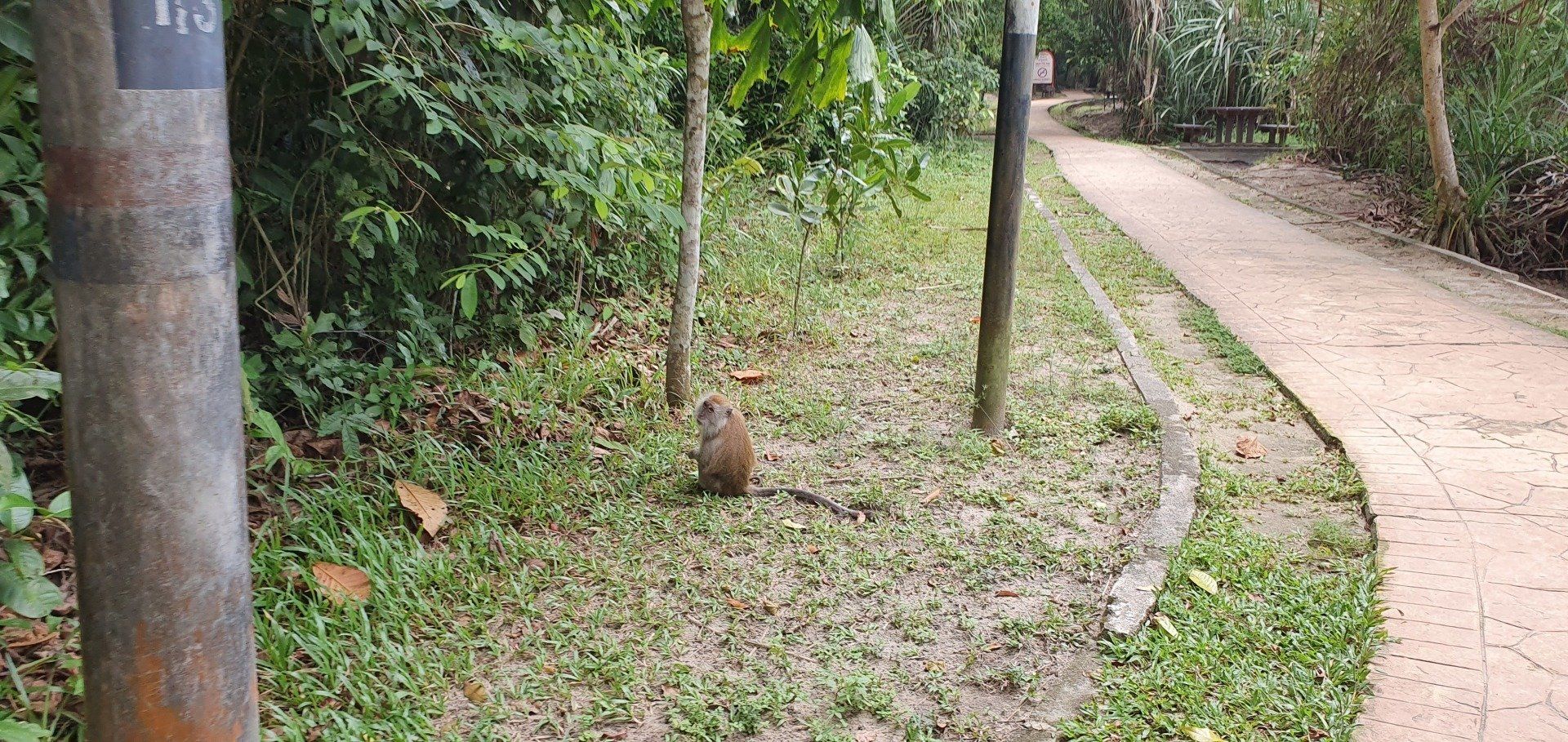 Ich entschließe mich, dennoch den Weg so weit es geht zu laufen, und mache mich auf. Der erste Teil ist asphaltiert und führt direkt am Strand lang. Zur Begrüßung hängt eine Affengang auf dem Weg ab und wartet auf neue Opfer (schon beim ersten Anblick habe ich meine Wasserflasche, die ich eben noch gekauft habe, schnell in den Rucksack gepackt). Und dann kreuzt die lustige Truppe auch noch eine Riesenechse, und ich fühle mich leicht zurück versetzt auf Komodo Island.
