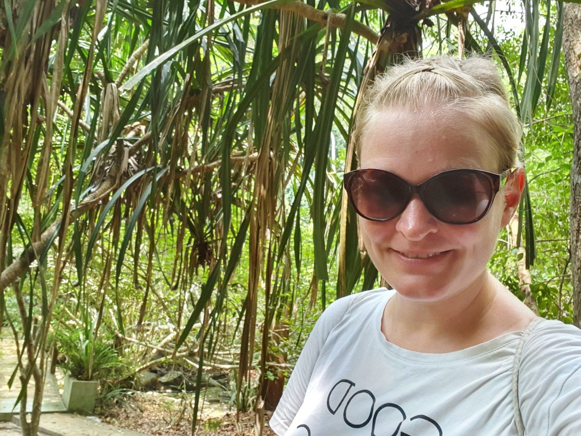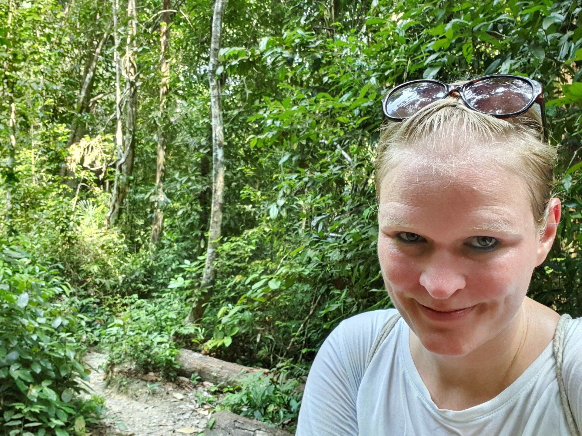 Auch wenn es bergab geht, ist es nicht immer einfach, einen guten haltenden Weg zu finden. Aber dann komme ich irgendwann wieder an der Abzweigung raus, an der ich (noch mit den Chinesen) gestartet bin und mache noch eine kleine Pause am Strand. Dann laufe ich ein Stück am Strand lang, aber erschrecke, als ich 2 Riesenechsen aufschrecke und die mich etwas skeptisch angucken, dann aber zum Glück wieder im Busch verschwinden. Und als dann auch noch fast in eine Riesenqualle trete, geht es für mich lieber auf dem asphaltierten Weg weiter. Am Ausgang unterhalte ich mich dann mit dem Ranger und erfahre, dass ich auch ein Boot hätte zurück nehmen können. Aber da ich das nicht wusste, ist alles okay. Grab kommt schnell und dann geht es wieder zurück in die City. Insgesamt definitiv eine empfehlenswerte Wanderung, die viele schöne Eindrücke hatte. Man sollte allerdings Wandersachen anziehen, denn mit meinen normalen Schuhen hat mir doch manchmal der Halt gefehlt.