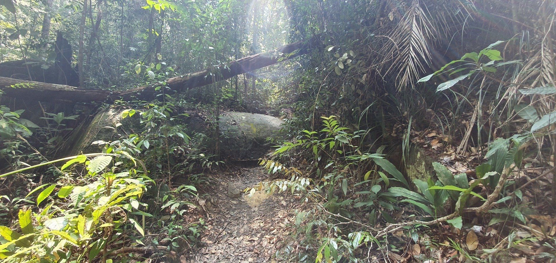 Ich halte mal etwas Abstand, aber das Tier läuft dann auch schon in die Büsche. Dann geht es weiter und leider hängt mir eine Gruppe von Chinesen im Rücken, die wieder mal laut daher brabbeln. Da ich gerne ruhig wandern möchte, versuche ich immer, sie abzuhängen, aber es funktioniert leider nicht. Irgendwann entschließe ich mich daher, den anderen Weg zu "Turtle Beach" zu nehmen, weil sie einfach nie ruhig sind. Leider erwische ich den schwersten Weg, der mitten durch den Dschungel führt, und der auch aufgrund von Sturmschäden eigentlich nicht mehr begehbar ist. Da ich den aber im Vornherein nicht nehmen wollte, ist mir das auch nicht bewusst, bis ich eben selbst über Matsch, Schlamm, Baumstämme und alles klettern und durchschlüpfen muss. Der Weg ist bei Maps.Me als Canopy Walk ausgezeichnet, und so kann ich wenigstens diesem Lauf etwas folgen.