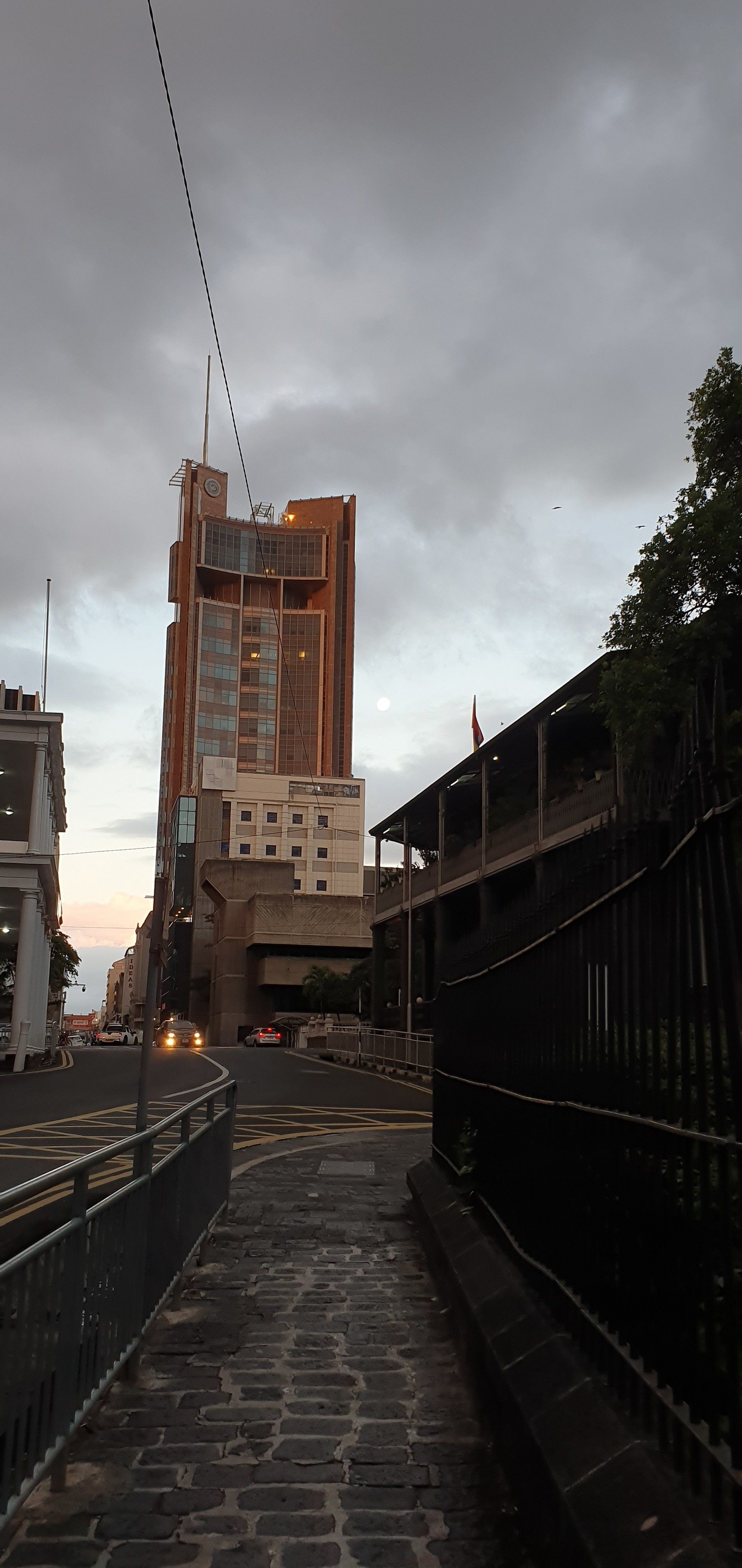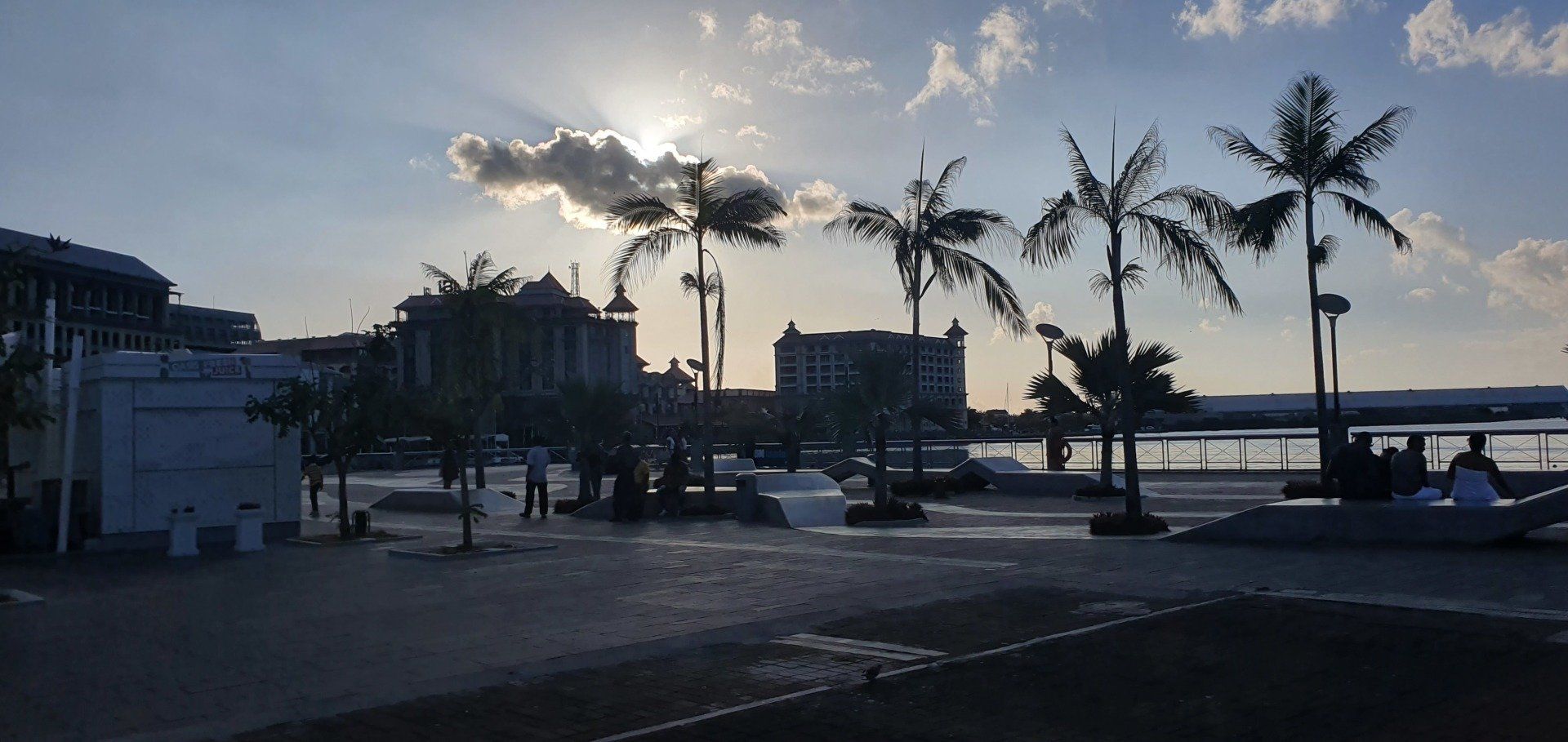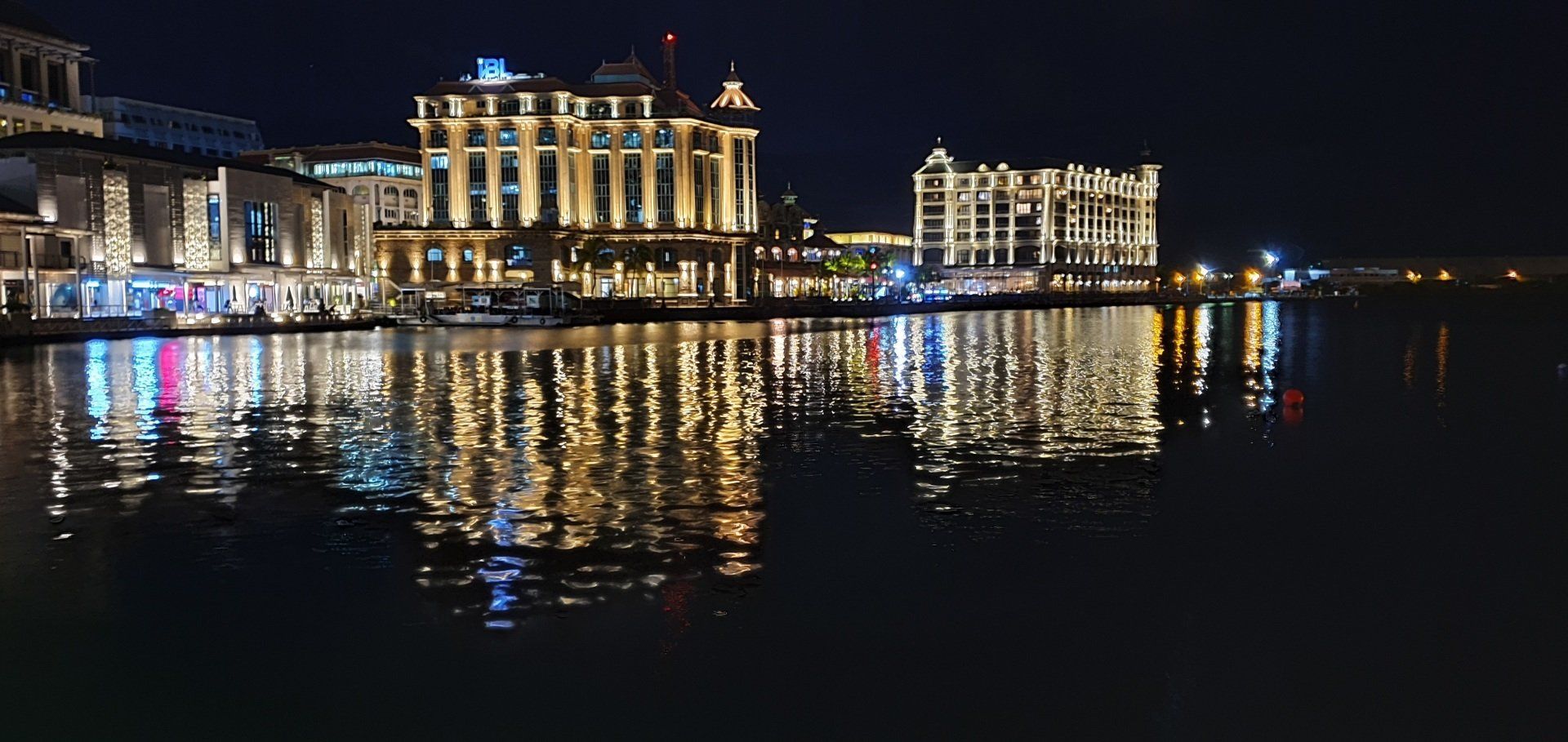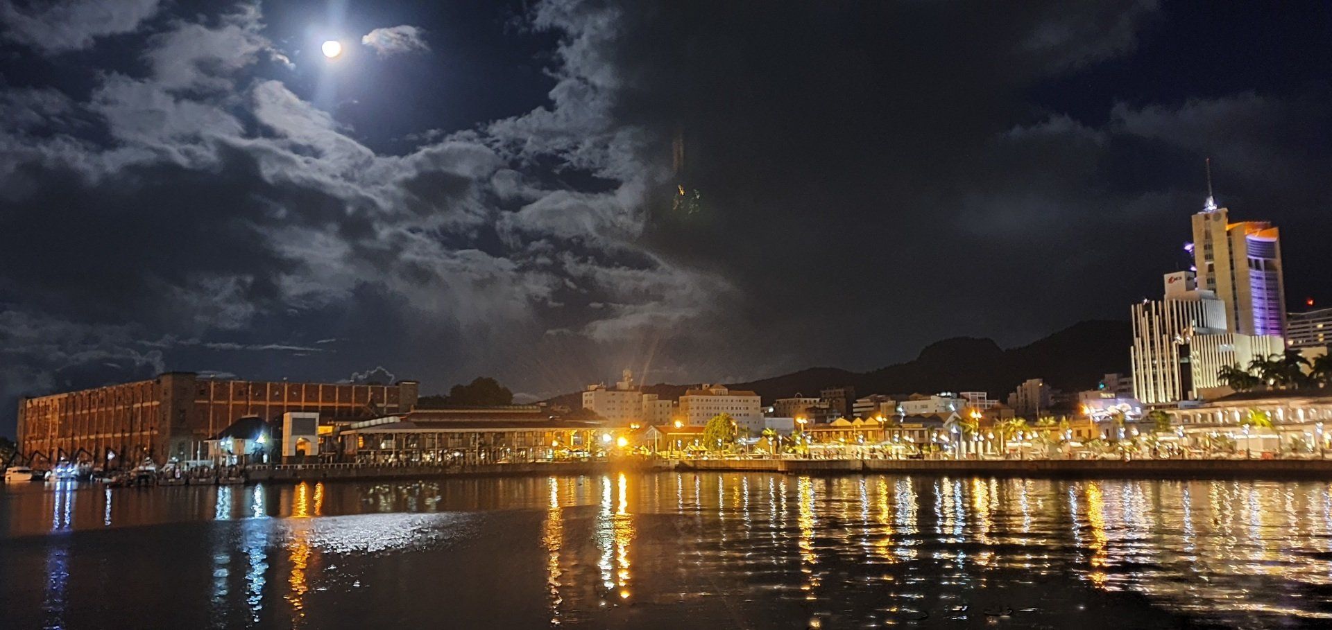 Dann gehts zurück, ich chille noch mal ne Runde und dann meldet sich Christian, dass er auch gelandet ist. Ich hatte ihm denselben Fahrer organisiert und dann klopft es irgendwann. Die netten Securityjungs stehen an der Tür und haben Chris im Schlepptau. Er richtet sich dann mal ein, es ist mittlerweile schon früher Abend. Dann machen wir uns irgendwann auf den Weg und laufen mal eine Runde am Wasser lang, auch am alten Postgebäude. Nach etwa 15 Minuten Fußweg erreicht man die Waterfront, eine nette Ecke, wo ein paar Bars sind und eine Art Promenade mit Einkaufszentrum. Echt ganz nett und scheinbar die einzige Ecke, wo man "ausgehen" kann. Das wird hier aber nicht großgeschrieben, denn eine richtige Bar- oder Discoszene gibt es hier nicht. Dann setzen wir uns mit den letzten Sonnenstrahlen in eine Bar und essen und trinken was. Danach drehen wir noch eine kleine Runde bis an die Spitze des Hafens und hier sieht es wirklich recht nett aus. Allzu viel ist aber nicht los, und scheinbar ist ab 12 Uhr hier auch Schicht im Schacht. Der Vollmond scheint sehr hübsch auf das Wasser im Hafenbecken und verleiht dem ganzen Anblick was romantisches. Es ist auch noch schön warm, sodass man gut in kurzen Sachen laufen kann. Dann gehts durch die Gassen zurück, hinter der Unterkunft, wo quasi tagsüber Trudel vom Markt ist, und abends tote Hose ist, wo Mäuse und Kakerlaken eine Party in den Müllresten feiern. Nicht so toll, nach wie vor. Da es schon spät ist, müssen wir lautstark an dem Eisentor klopfen und dann kommt der Securitymann, öffnet ebenso lautstark das Schiebetor von unten nach oben und begrüßt uns nett. Trotzdem seltsam, dass man abhängig davon ist, dass einer einem die eigene "Haustür" öffnet. Dann gehts hoch und wir schnacken noch eine Runde auf der Terrasse. Dann setze ich mich noch eine Weile an den Blog, der noch in Sri Lanka hängt, und Christian geht schon mal in sein Zimmer. Ab morgen werden wir dann den Mietwagen haben und ich bin gespannt, was die Insel außerhalb der Hauptstadt Port Louis kann. Nächtle.