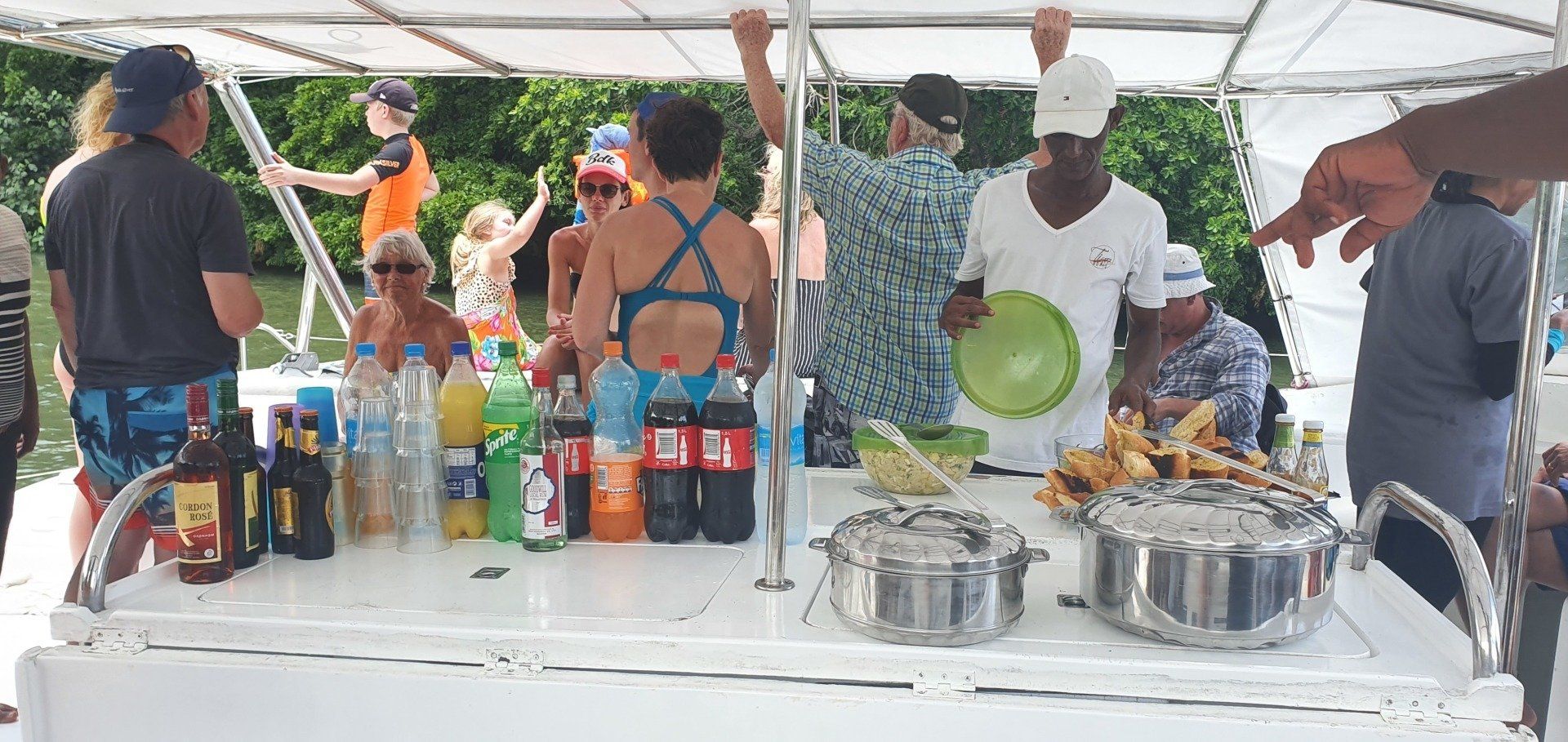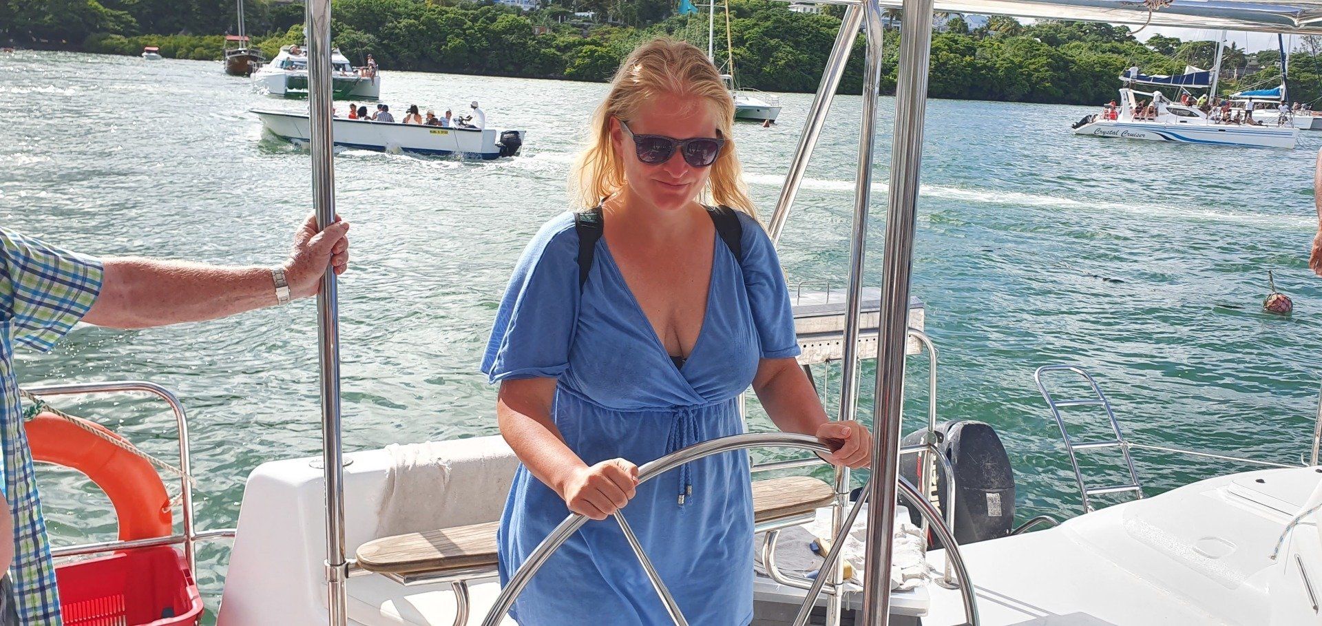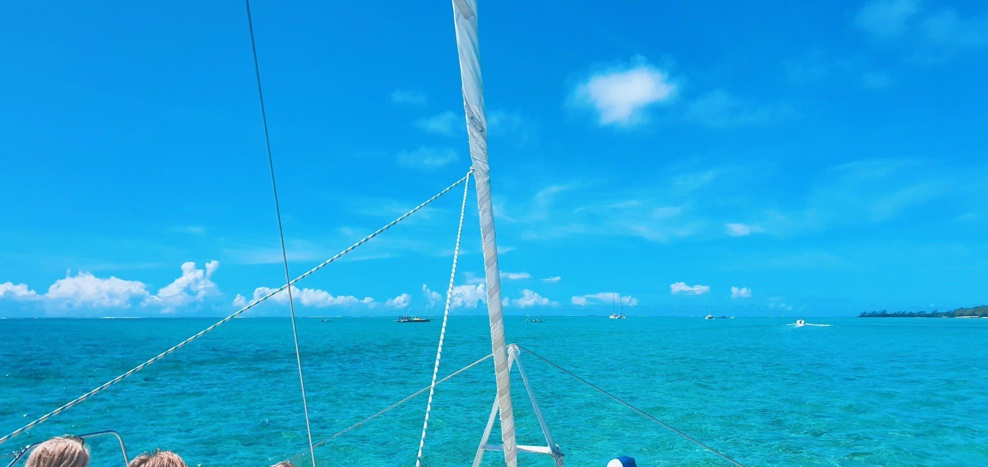 Dann ist er also da, der letzte ganze Tag meiner langen Reise. Er startet früh, um 8 wollen wir los. Also erst runter durch das Einkaufszentrum, wieder hoch zum Parkplatz (ich sage ja, mal kann sich hier echt verirren). Teilweise herrschen hier unten so üble Gerüche, weil es eine Tierhandlung gibt, dass einem richtig schlecht wird. Also schnell hoch zum Auto, und wieder runter fahren. Allerdings geht der Chip nicht, weil am Abend vorher der Security für uns gechippt hat und das System nun denkt, dass wir gar nicht drin sind. Okay, wir schalten ein wenig spät, man hätte den Chip ja auch einfach auf der anderen Seite mal erkennen lassen können, aber so müssen wir einen der Securities bemühen, was sehr lange dauert. Diese 15 Minuten warten mit voll angezogener Handbremse vor der Schranke am steilen Berg sind für die Fahrt zum Hafen nicht einkalkuliert. Dann geht es halt so schnell wie nur möglich über die Insel, aber um die Zeit sind viele unterwegs, auch viele Busse. Also dauert es wieder mal sehr lange, und eine Telefonnummer der Agentur haben wir auch nicht mit. Also fahre ich so schnell wie nur möglich, bis wir dann am Büro der Agentur ankommen, ich mich erst mal für die 30 Minuten Verspätung entschuldige (ja, so lange hats tatsächlich gedauert), und auch nicht mehr damit rechne, dass das mit dem Trip noch was wird. Die Dame ist aber ganz ruhig und meint, der Katamaran würde ja eh später fahren. Oh Mann. Wozu dann die Hektik? Aber gut, besser so, als das Ding verpassen und evtl noch Strafe zahlen, weil wir ja 2 Plätze gebucht hatten. Dann beschreibt sie mir eher schlecht als recht den Weg zu einem Parkplatz, den wir prompt nicht finden. Also wieder raus, jemanden fragen, ob man da, wo das Auto jetzt steht, stehen darf, dies wird verneint, also fragen, ob noch Zeit ist zum Umparken... Chaos. Aber dann läuft es, wir finden den Parkplatz, den man bei Regen definitiv nicht befahren sollte (alles voller Erde, einen Hang runter) und werden dann am Hafen vom letzten kleinen Boot abgeholt, das uns zum Katamaran bringt. Alle entspannt, keiner genervt. Ein Glück, dann kann der entspannte Teil endlich kommen. Die Sonne strahlt und knallt gleichzeitig erbarmungslos auf Schiff und Mensch. Ich verkrümel mich ein wenig in den Schatten und dann gehts schon los. Was nicht kommuniziert wurde, war, dass alle Getränke, inkl. Alkohol, mit im Preis von ca. 45 Euro inkludiert ist. Das ist natürlich grandios. Das Meer hier ist sehr ruhig, weil man nur im Schutz der Riffe fährt, die keine großen Wellen durchlassen. Also kann man richtig relaxen. Es ist zwar recht voll an Bord, aber alle sind nett und genießen die Zeit. Unterwegs stoppen wir zum Schnorcheln, etwa eine Stunde. Da freu ich mich besonders drüber, weil es die letzten Monate ja eher wenig war mit Schnorcheln. Und dann gibt es auch ein paar tolle Fische zu beobachten. Nach dem Schnorcheln, etwa eine Stunde, gibt es ein leckeres Barbecue mit viel Auswahl, auch an vegetarischen Sachen, weil ich zuvor angemeldet hatte, dass ich nur veggie esse. Und das wurde wirklich toll bedacht und alles ist lecker. Das Bild vom dampfenden Grill am Heck des Katamarans ist natürlich auch nicht ohne :)