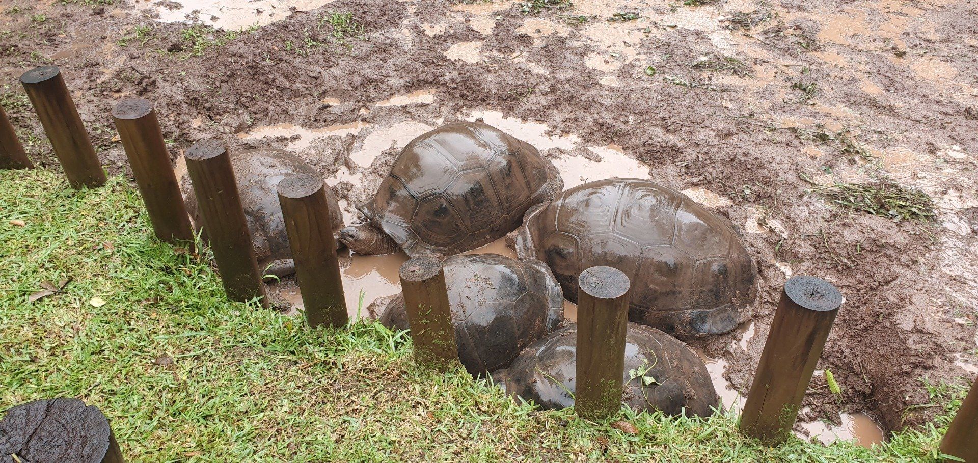 Man kann hier sogar "um die Kurve" laufen, weil die kleine Halbinsel so verläuft. Und von hier hat man auch auf den Berg eine tolle Aussicht. Als wir fragen wollen, ob wir an der Strandbar, die wohl zum Hotel gehört, was trinken dürfen, werden wir recht unhöflich weggeschickt. Na gut, dann gehts ein Stückl weiter und an der nächsten Strandbar machen wir dann eine Pause. Ebenso zieht das Wetter gleich, die Sonne pausiert und es gibt einen heftigen Regenschauer, sodass im Trockenen keine Plätze mehr frei sind. Aber dann hört es bald auf und wir setzen uns trotzdem hin, man trocknet in der Sonne ja auch schnell wieder. Hier hält man es auch eine ganze Weile aus, weil die Aussicht mal wieder sehr schön ist und viele tolle Farben bereit hält. Nach der Stärkung gehts in den Black River Nationalpark, ein riesiges Gelände mit vielen touristischen Highlights. In den Park selbst kann man sehr gut fahren, die Straßen scheinen recht neu und ich frage mich, wie es hier wohl vor 5 Jahren noch ausgesehen haben mag. Da konnte man vermutlich nur zu Fuß zu den Wasserfällen wandern. Aber gut, wir fahren direkt hin, vorher muss man am Eingang noch Eintritt zahlen. Mit 5 Euro etwa eine überschaubare Summe. Den Wasserfall erreicht man dann recht schnell, und man ist recht weit davon entfernt. So weit ich sehen kann, gibt es auch keinen Weg runter. Allerdings ist es wieder stark am regnen, sodass es ohnehin nicht so verlockend wäre, da jetzt auch noch runter zu gehen. Also harren wir ein wenig im Wald aus, und fahren dann zum nächsten Spot. Kaum geparkt, macht es wieder runter wie aus Eimern. Also stellen wir uns unter und ich lasse mir von ein paar Einheimischen, die als Fahrer hier auf ihre Gäste warten, ein paar Tipps geben. Als es dann einigermaßen aufhört, laufen wir zu der "Seven colored earth". Ein Stück Vulkanland, das sich durch die Witterung und verschiedene Zusammensetzungen zu diesen verrückten Farben formiert hat. Glücklicherweise hat die Sonne dann auch gerade ein Auge auf diesen hübschen Fleck geworfen, und so sieht man auch die Farben. Denn bei Regen, wie er danach wieder einsetzt, ist das ganze Schauspiel mehr oder weniger dahin. Also: Glück gehabt. Bei Regen drehen wir noch eine kleine Runde in dem Park, was aber natürlich nicht so viel Spaß macht, besuchen die eingesperrten Riesenschildkröten, die sich "kuschelnd" in einer Pfütze ausruhen und gehen dann auch wieder zum Auto. Man ist nun klatschnass und das lädt nicht so sonderlich zum weiteren Spazieren ein, zumal es weiter regnet. Also fahren wir noch mal weiter über die hügelige Landschaft von Chamarel, die sich auch im Regen schön ansehen lässt, da die Regen- und Nebelfelder sich hier festsetzen und durch kleine helle Lücken wieder ein ganz anderes Erscheinungsbild hergeben. Und da es so regnet, ist auch kaum was los hier oben. So zieht dann auch die Zeit recht schnell vorbei und wir machen uns über eine andere Straße dann wieder auf den Heimweg. Vorher gehts dann noch was kleines einkaufen, dann gibt es Abendessen "zu Hause" und wieder klingt der Tag mit einem Absacker auf der Terrasse aus. Was für morgen ansteht, ist für mich klar, Chris überlegt noch. Ich will mal die Tiere im Animal Sanctuary besuchen und mir den Botanischen Garten ansehen. Das Wetter ist wieder nicht so toll gemeldet, also fällt ein Strandtag ohnehin eher flach. Aber mal sehen. Das spontane Entscheiden hat sich hier bisher als ganz gut herausgestellt. Glücklicherweise schlafe ich hier auch ganz gut und hatte auch keinen (bemerkten) Kakerlakenbesuch in meinem Bett. Lucky me.