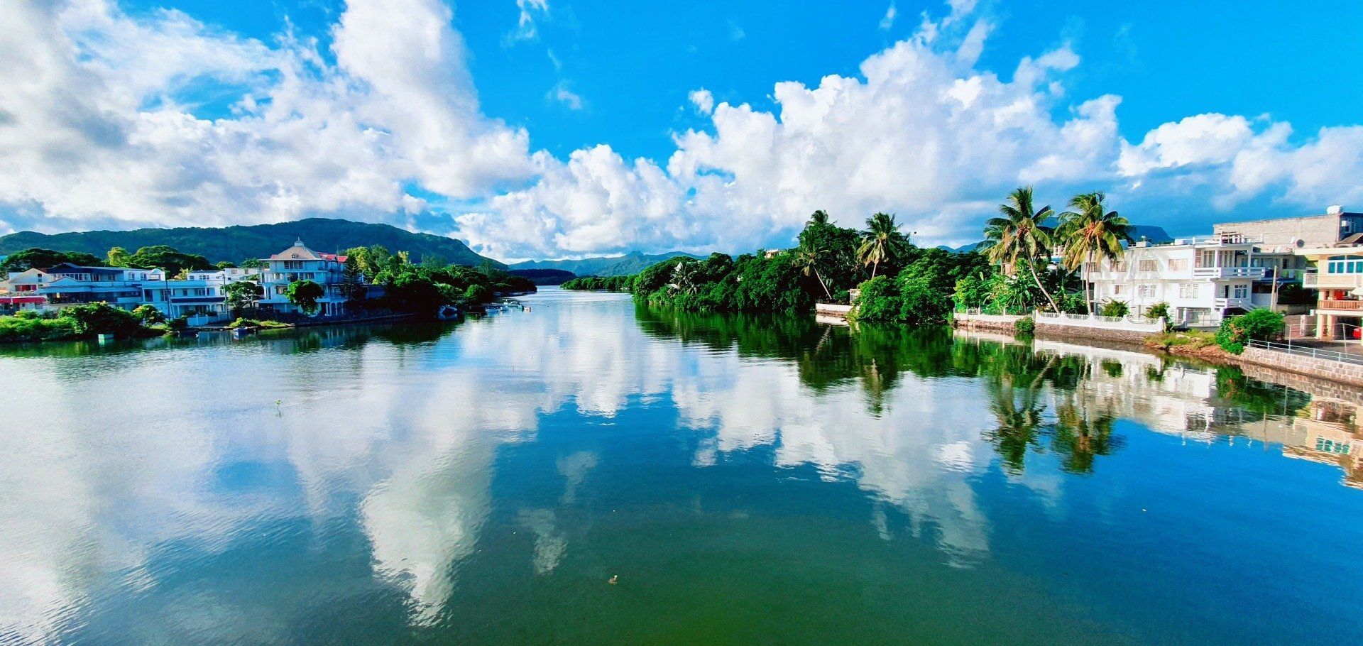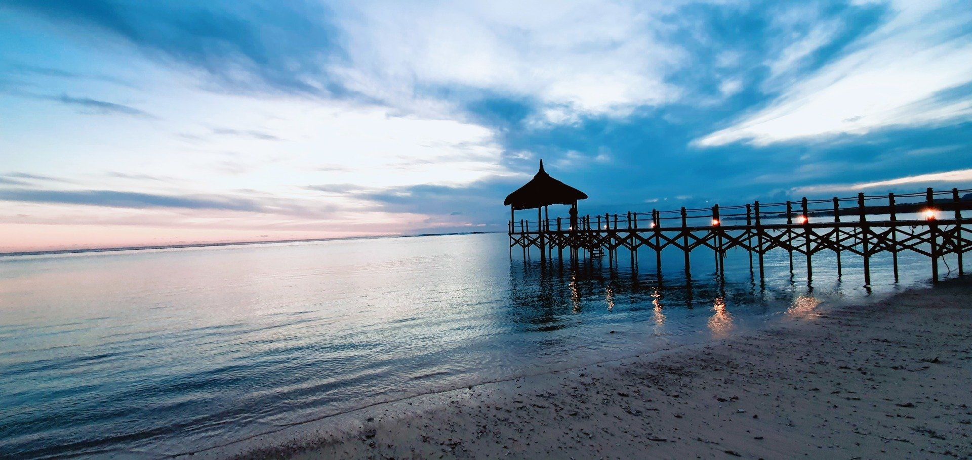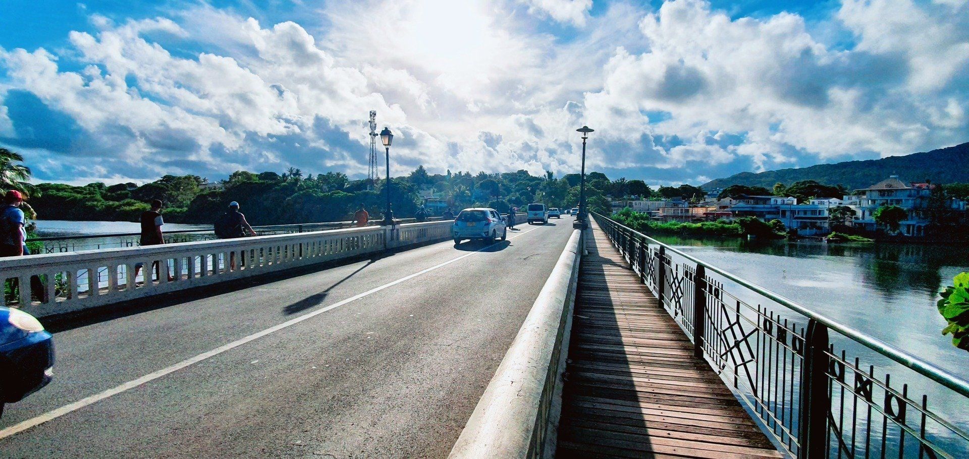 Weiter gehts dann nach einer Weile weiter an der Küste lang, bis in die zweitgrößte Stadt von Mauritius: Mahébourg. Dort steht die wohl erst gebaute Brücke "Cavendish Bridge". Wir laufen kurz drüber, aber es ist nicht so spektakulär. Was auffällt, ist die Sicht auf die Ufer: Auf einer Seite wie ein verfallenes, spooky Slum, auf der anderen Seite luxuriöse Gebäude. Die Sonne steht gerade auch so fantastisch, dass sich bezaubernde Spiegelungen im Wasser ergeben. Da es aber dann schon wieder Nachmittag ist, machen wir uns auch weiter auf den Weg zurück, weil wir die Strecke über den Süden und Südwesten antreten wollen, und das erfahrungsgemäß ja auch sehe lange dauert. Unterwegs fällt mir noch ein Aussichtspunkt auf Maps.Me auf, nämlich die Klippen von Gris Gris, die wir noch ansteuern und nicht enttäuscht werden. Super schöne Aussicht, toller Strand, hohe, sich an den Felsen brechende Wellen. Und oben Steinbänke, die zum Verweilen einladen. Dann geht es weiter, und weil wir nicht beim Sonnenuntergang im Auto sitzen wollen und es zudem auch der letzte hier auf der Insel für uns sein wird, halten wir an einem weiteren Strand, St. Felix, der auch sehr schön. Man kann lange laufen und am Ende steht ein hübsches Hotel, das viele kleine Bungalows hat. Davor führt ein Steg mit kleiner Hütte ins Wasser. Hier schauen wir uns dann den Sonnenuntergang an, der mal wieder gigantische Farben mit sich bringt. Jetzt ist es leider schon dunkel, weshalb wir auch bis zum letzten Rotstrahl warten, weil wir eh um Dunkeln zurück müssen. Die Fahrt zieht sich dann auch ewig hin, obwohl es nur noch 30 Kilometer bis Port Louis sind. Zudem ist es wirklich kein Spaß, hier im Dunkeln zu fahren, und an der Wohnung angekommen, müssen wir wieder klopfen, damit wir ins Parkhaus fahren können. Aber es war noch ein letzter schöner Tag mit vielen tollen Eindrücken und Aussichten, und jetzt gibt es eigentlich kaum ein Fleckchen, das ich hier auf der Insel nicht gesehen habe. Daher freu ich mich auch, dass wir morgen mal eine organisierte Tour haben, wo ich mir nicht überlegen muss, was man tun könnte. Um 9 sollen wir am Anleger auf der anderen Seite sein, deshalb starten wir um 8, um genug Puffer zu haben. Aber ich freue mich sehr, dass es doch noch mal geklappt hat mit dem Katamaran und Schnorcheln, nachdem das im Norden schon nicht geklappt hat.