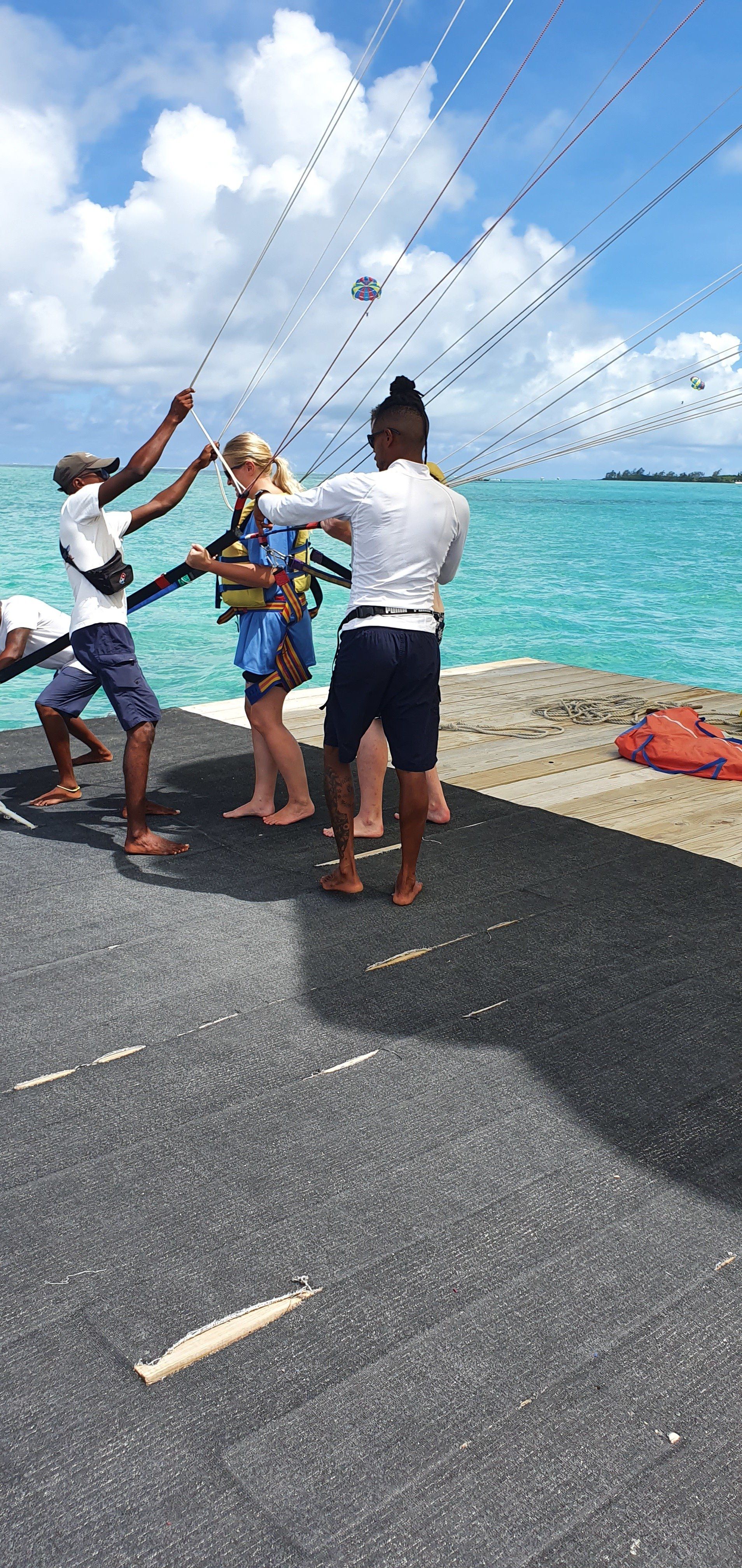 Der nächst Stopp ist dann auf der Ile-aux-Cerfs, wo Chris und ich noch beschließen, vorher eine Runde Paragliding zu versuchen. Für 20 Euro ein kurzes Vergnügen, etwa 3 Minuten in der Luft zu sein, aber auch mega cool. Werde ich definitiv noch mal machen. Zwischendurch will uns der Fahrer sogar veräppeln und lässt uns mal dezent ins Meer "dippen". Also bisher ein super Trip, mit perfektem Wetter und guter Stimmung. Die nervige Anreise ist lange vergessen. Dann haben wir noch etwa 1,5 Stunden auf der Insel, die wir mit chillen und schwimmen verbringen. Leider muss man hier höllisch aufpassen, weil überall Seeigel rumliegen. Wie es aussieht, wenn man in einen tritt, hat einer auf dem Boot demonstriert. Der hatte fast löchrige Fußsohlen, übersät von schwarzen kleinen Löchern. Autsch. So richtig Spaß macht es mir ohne Wasserschuhe daher nicht im Meer, und es ist auch ganz schon "pisswarm". Also gehe ich eher raus und sonne mich noch ein wenig, immerhin der letzte Strandtag für eine unbestimmte Zeit. Schon komisch, man kann sich richtig dran gewöhnen. Bevor wir abfahren, drehen wir noch eine kleine Runde zu der Stelle, wo 2 Inseln miteinander durch eine Sandbank verbunden sind. Die Insel ist, wie erwartet, voll mit Menschen und es gibt viele Essmöglichkeiten. Es ist nett und ich bin froh, es man gesehen zu haben, aber so richtig mein Ding ist es dann nicht. Einfach zu voll und zu wenig naturbelassen, auch wenn es wunderschön ist. Dann holt uns der Katamaran wieder ab und wir segeln langsam und gemütlich zurück. Ich gönne mir noch ein Abschlussbierchen auf dem Netz vorne und verbleibe hier, bis wir anlegen. Ein richtig toller Trip. Dann gehts zurück auf die (mittlerweile) echt nervige Strecke nach Port Louis, die wieder eine ganze Zeit dauert. Glücklicherweise jetzt ohne Zeitdruck. Wir beschließen, das Auto erst wegzubringen, vorher müssen wir noch tanken, und dann noch mal in die Waterfront zum Essen zu gehen. Gesagt, getan. Nach der Dusche gehts dann los, quasi das Abschiedsessen. Heute mal nicht zu den "üblichen" Restaurants, sondern noch zu einer anderen Bude. Heute ist es richtig voll hier überall, vielleicht liegt es am Kreuzfahrtschiff, das hier gerade liegt, oder daran, dass Freitag ist. Jedenfalls ist die Bedienung wirklich mega unfreundlich, sodass ich fast schon keine Lust mehr hab, hier zu essen. Aber wir warten dann trotzdem und irgendwann, nach ewigem Warten, kommt endlich das Essen. Zwischenzeitlich fängt es richtig hart an zu schütten, und obwohl wir es vorher noch schade fanden, nicht "richtig" draußen zu sitzen, haben wir jetzt mit unserem überdachten Platz natürlich das goldene Los gezogen. Wir quatschen noch eine Runde mit den Nachbarn, ein paar netten Locals, und machen uns dann auf den Heimweg. Ich muss noch alles abflugbereit packen und um 5 Uhr raus, und Christian ist müde. Also gehts zurück, ich verabschiede mich von der Gegend, die man ja nun doch trotz ihrer "Ecken und Kanten" irgendwie liebgewonnen hat, und bin schon etwas melancholisch, muss ich sagen. Ein komisches Gefühl, morgen nach Deutschland zurück zu fliegen und diese Reise jedenfalls mal zu beenden. Ein Stück weit freue ich mich aber auch, ganz klar. Dann gibts noch ein Abschiedsgetränk auf der Terrasse und wir verabreden uns für 5 Uhr noch zur Schlüsselübergabe und zur Verabschiedung. Die Tür muss man nämlich von außen abschließen, sonst bleibt sie auf, und das muss ja nicht sein. Dann packe ich langsam meinen Kram und gehe recht spät ins Bett.